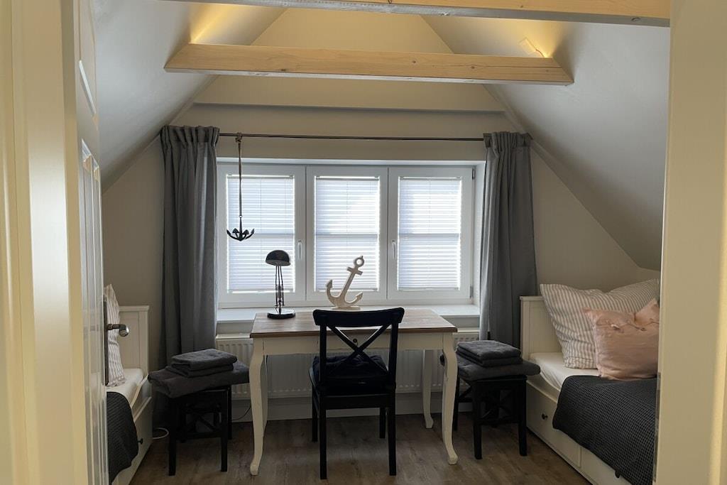 Parterre: (Eingangshalle(, ), Eingangshalle(), Küche(Kochplatte, Wasserkocher, Toaster, Kochherd, Kaffeemaschine, Backofen, Spülmaschine, Kühlschrank, Tiefkühlschrank, ), Wohn/Esszimmer(, , Bibliothek, TV, Esstisch, Radio, Hochstuhl), Badezimmer(, Toilette, Dusche, Waschbecken, Föhn), Abstellraum(, Trockner, Waschmaschine, Trockenschrank)) Dachgeschoss: (Eingangshalle, Schlafzimmer(, Doppelbett, TV, Fliegenfenster), Schlafzimmer(, Einzelbett, Einzelbett, Babybett)) , , , Internet, Internet, Trockner, Waschmaschine, Heizung, Terrasse(Gartenmöbel), Garten(Strand, Liegewiese), Parkplatz, Trockenschrank
