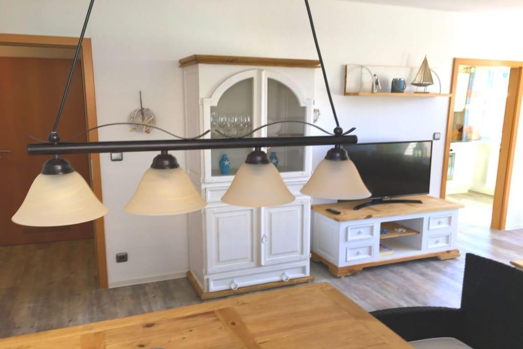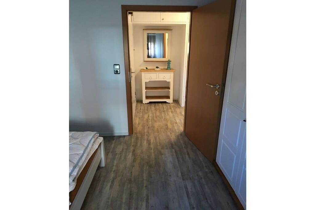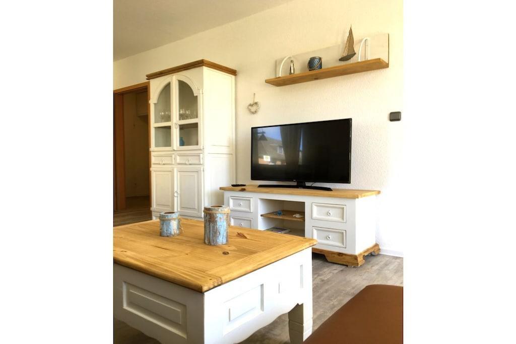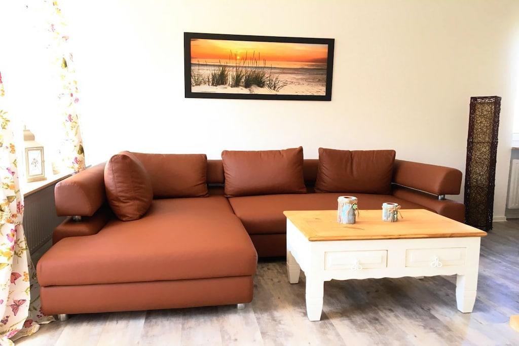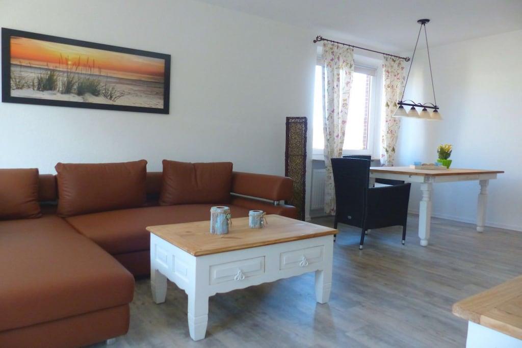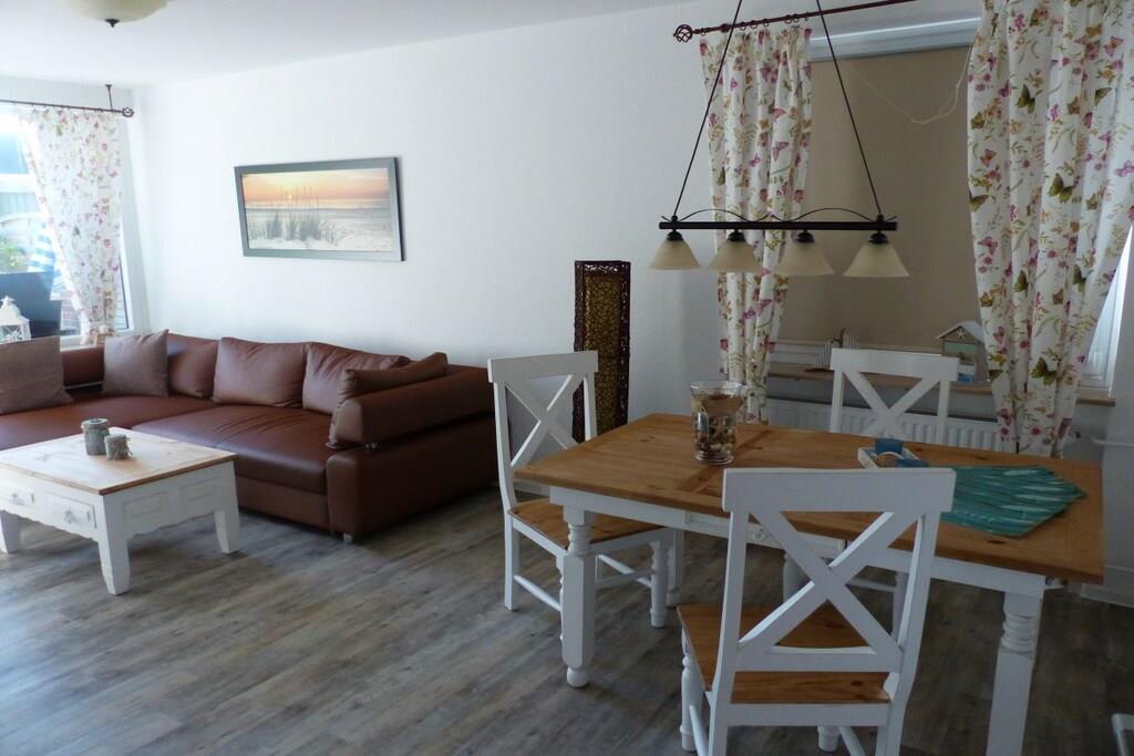 Nachdem Sie Ihr Auto auf dem privaten, kostenlosen Parkplatz abgestellt haben, betreten Sie die 52 m² große 2-Zimmer-Ferienwohnung im Erdgeschoss, die gut geschnitten ist. Sie ist teils im modernen Landhausstil und teils im rustikalen Hacienda-Stil eingerichtet, sodass Sie sich in einem hellen und stilvollen Ambiente wohl und entspannt fühlen. Das moderne Badezimmer wurde komplett neu gestaltet. Im geräumigen Flur finden Sie eine stilvolle Kommode mit Spiegel und einen Einbauschrank, der gleichzeitig als Garderobe für Ihre Outdoor-Ausrüstung dient. Durch die erste Tür rechts gelangen Sie in ein helles, 15 m² großes Schlafzimmer im modernen Landhausstil mit einem verstellbaren 180 x 200 cm großen Doppelbett und einem großen Kleiderschrank für Ihre Sachen. Das neu gestaltete Badezimmer bietet einen erfrischenden Rückzugsort nach einem anstrengenden Tag. Das 21 m² große Wohnzimmer präsentiert handgefertigte Holzmöbel im rustikalen Hacienda-Stil mit einem Tisch für vier Personen, einem gemütlichen Sofa, das sich in ein Bett für einen Erwachsenen oder zwei kleine Kinder verwandeln lässt, und einem 108 cm großen 4K-Fernseher mit kostenlosem WLAN zum Streamen und Spielen. Die separate Küche ist mit allem ausgestattet, was Sie brauchen, einschließlich Geschirrspüler, Kühlschrank und Cerankochfeld. Vom Wohnzimmer aus treten Sie auf die geschützte Südterrasse – perfekt zum Sonnenbaden oder Frühstücken, bevor Sie die nahe gelegenen Restaurants und das wunderschöne Weltnaturerbe Wattenmeer erkunden. Wir hoffen, dass Ihnen die Ferienwohnung vom ersten Moment an einen erholsamen und schönen Aufenthalt beschert. Wenn Sie sich nicht um Bettwäsche und Handtücher kümmern möchten, stellen wir diese gerne gegen eine Gebühr von 20,- EURO pro Person für Sie bereit.