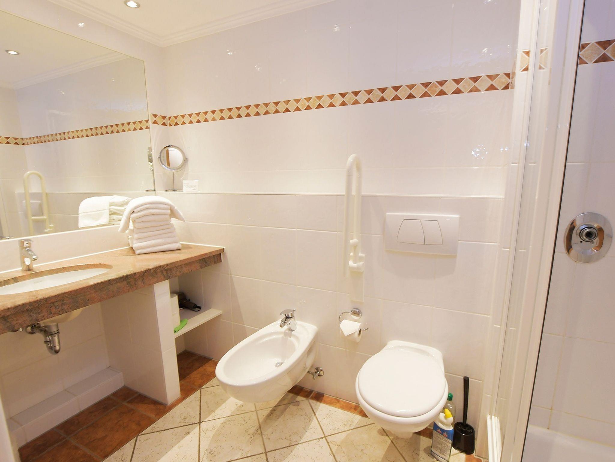 Unsere Bäder im Neubautrakt sind ausgestattet mit Dusche, WC, Bidet, großem Waschtisch mit Spiegel, ausreichend Ablageflächen, Fußbodenheizung, Handtuchtrockner und Radio.