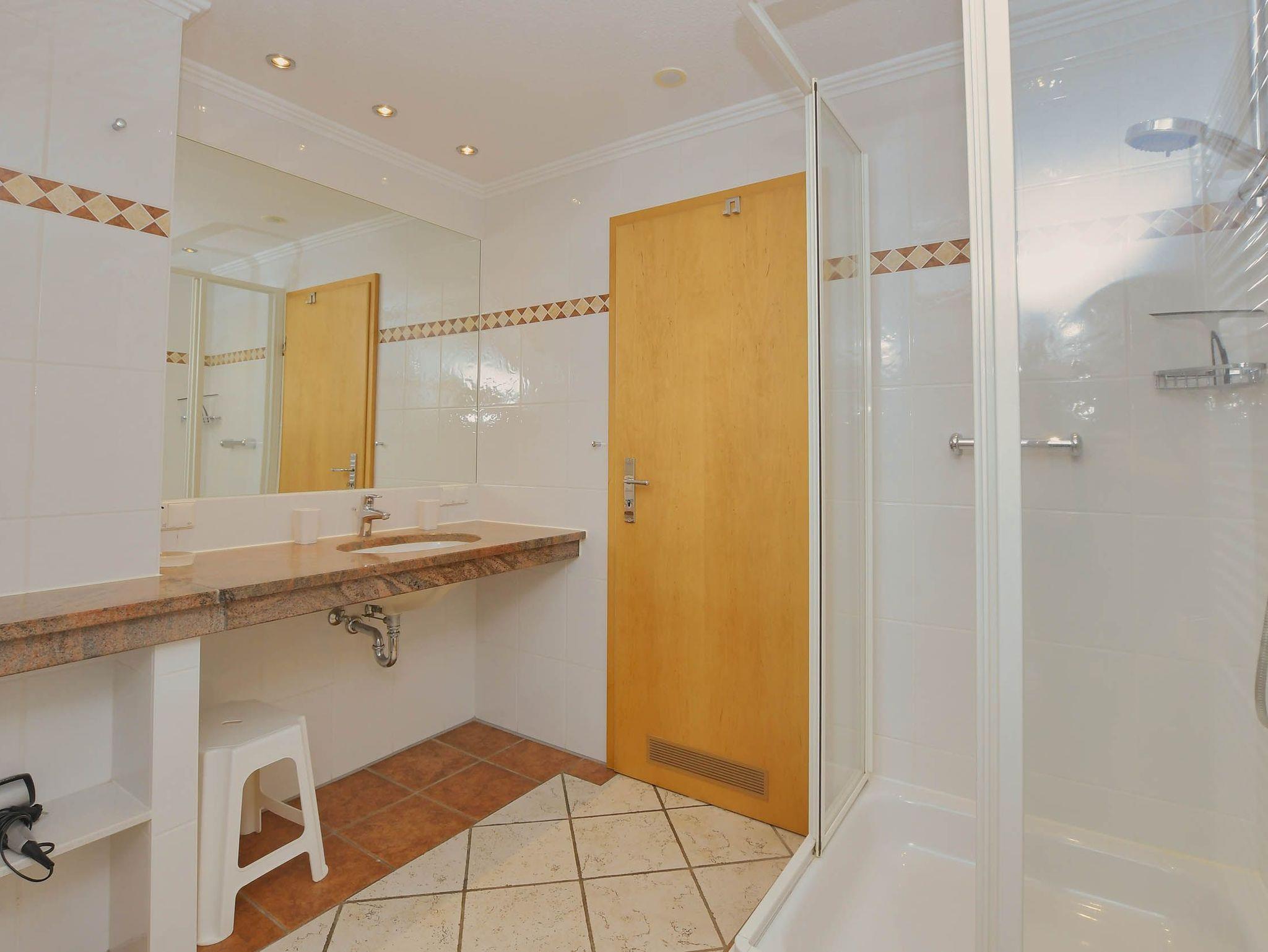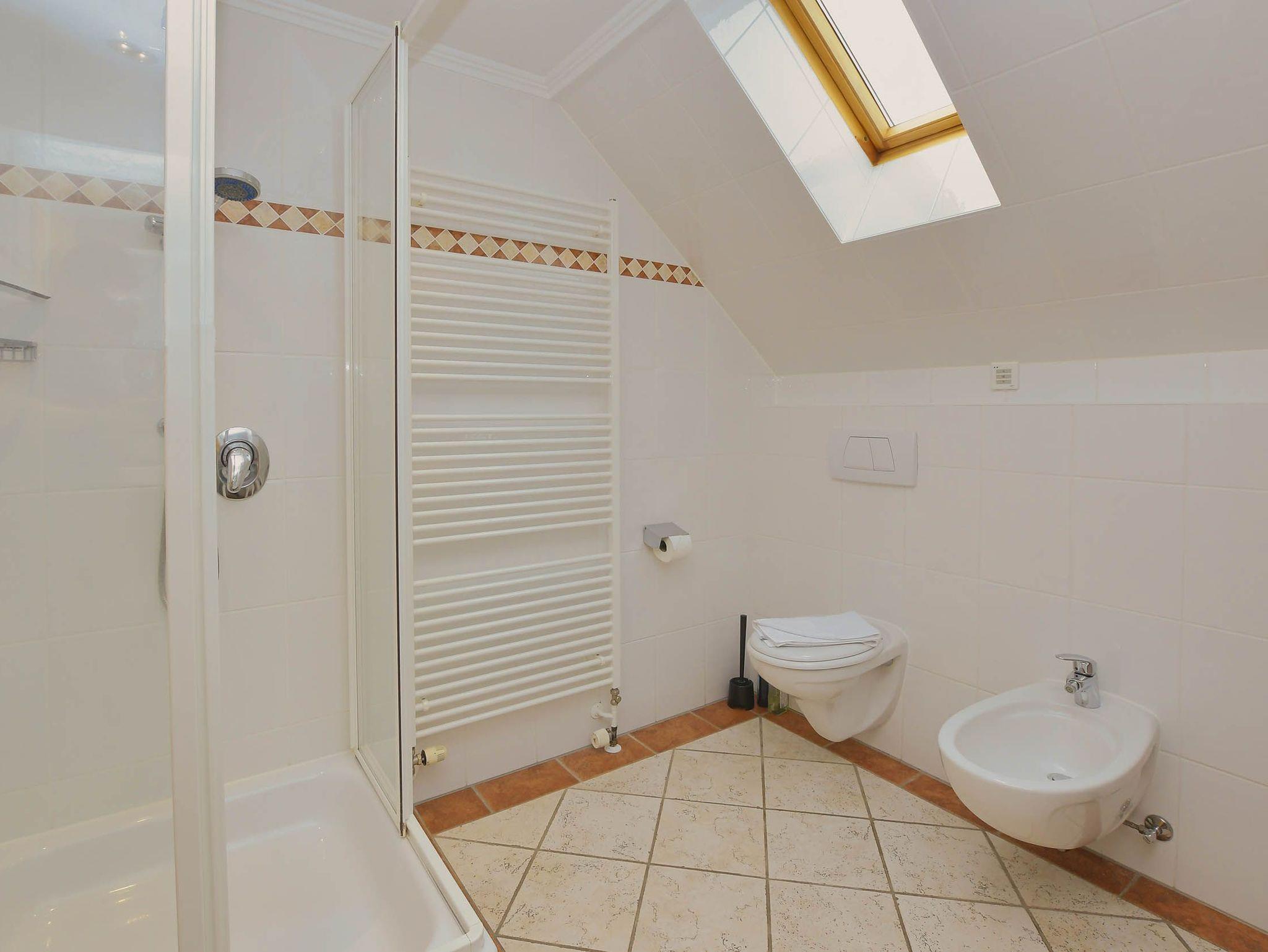 • Duschbad mit Dusche, WC, Bidet, großem Waschtisch mit Spiegel, ausreichend Ablageflächen, Fußbodenheizung, Handtuchtrockner und Radio.