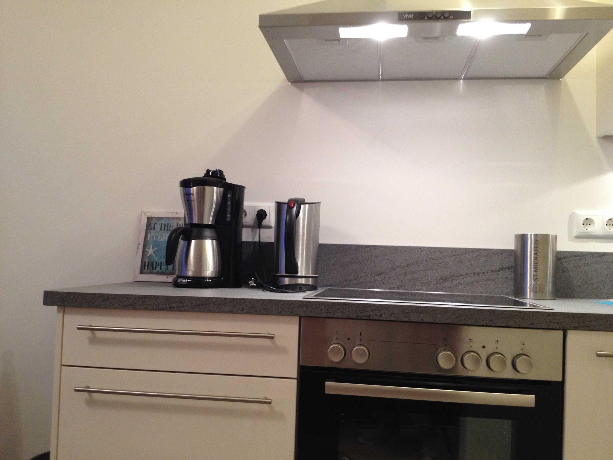 • neue offene Küche mit Ceranfeld und Backofen, Kühlschrank, Geschirrspüler, Dunstabzugshaube, Kaffeemaschine, Wasserkocher, Toaster und Mikrowelle.