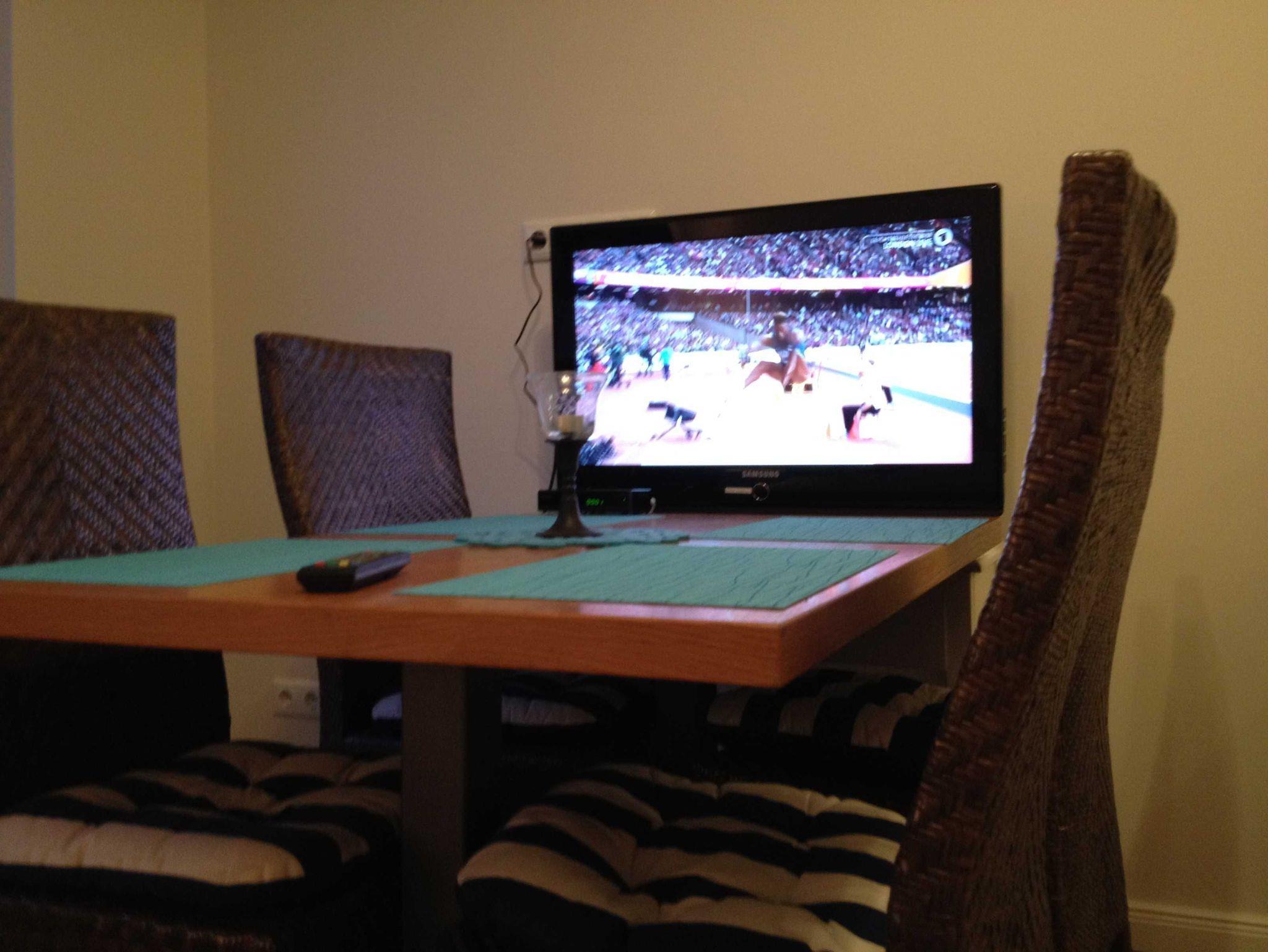 • Wohnzimmer mit bequemer Schlafcouch, Eßbereich und Fernseher