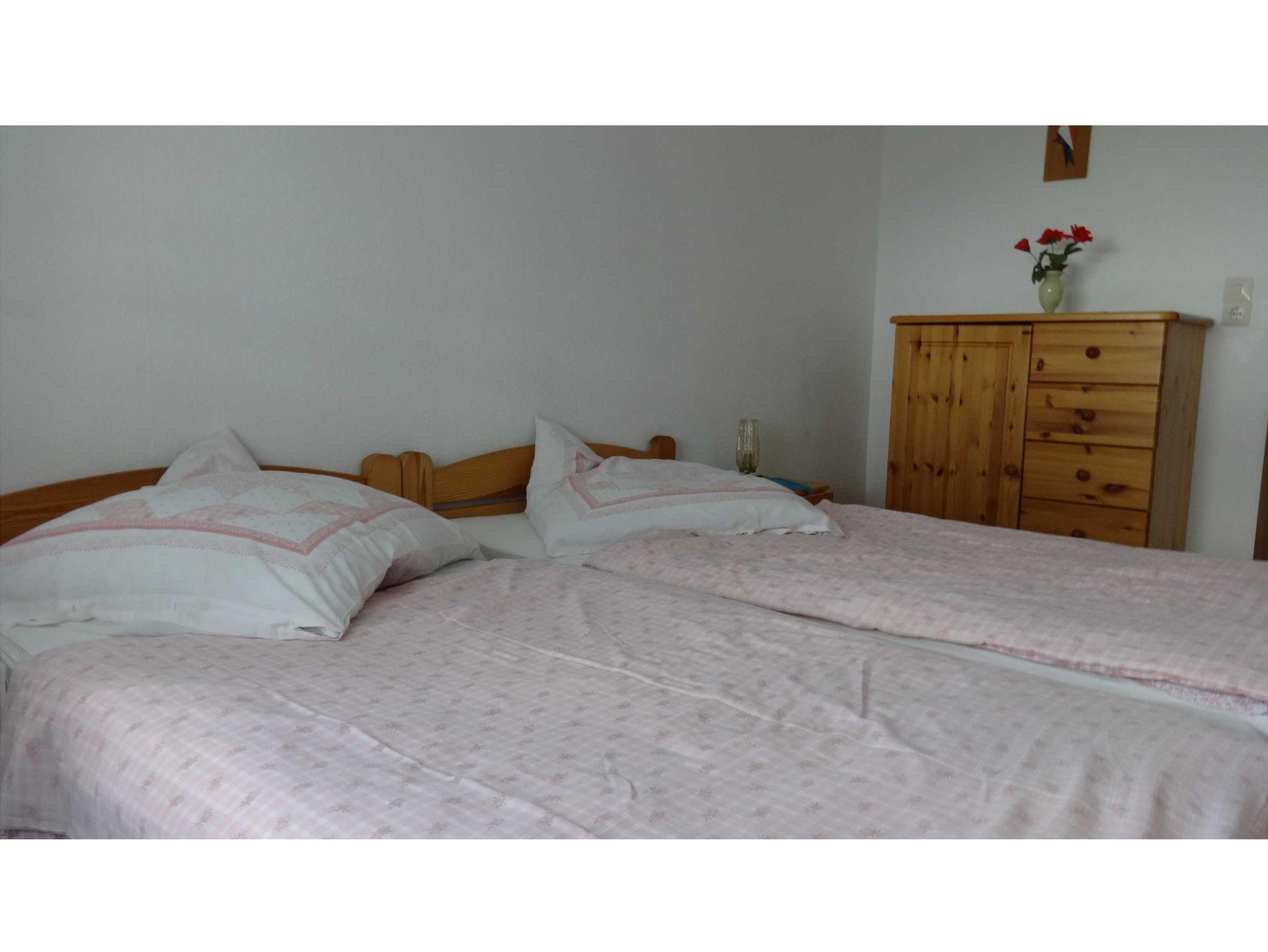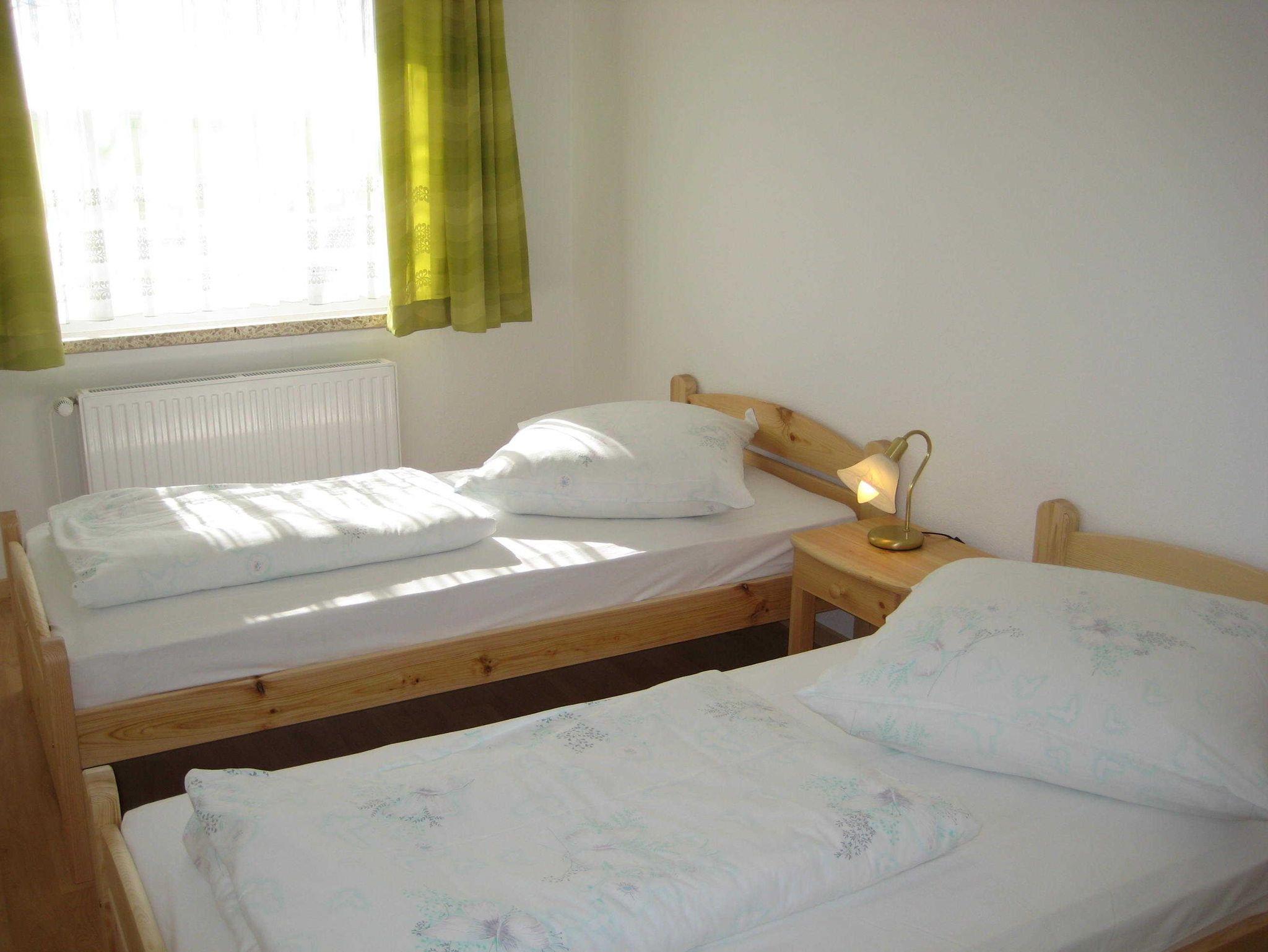 • 1. Schlafzimmer mit zwei getrennt stehenden Betten und Nachtschränken, Baby-Reisebett auf Wunsch.