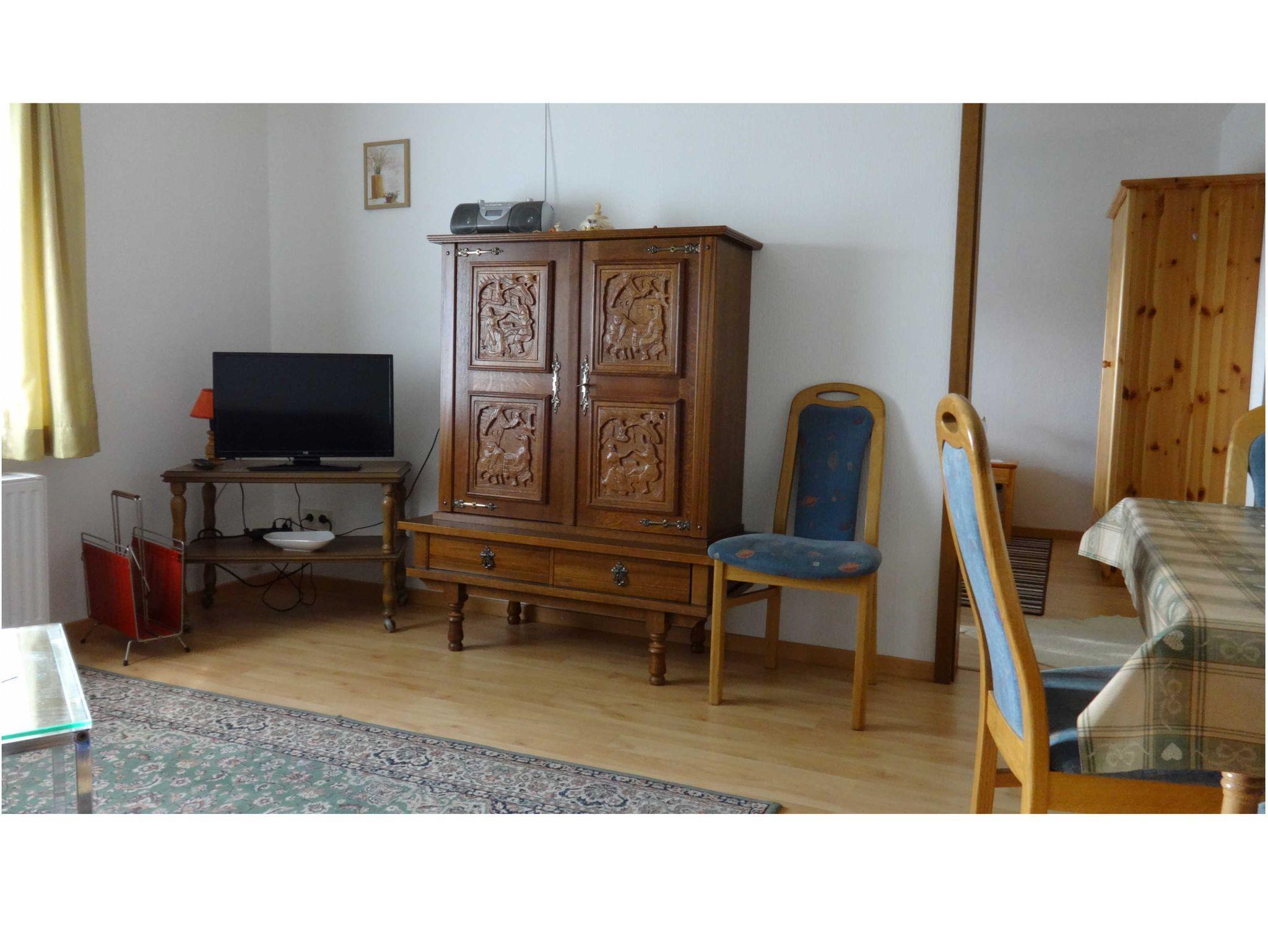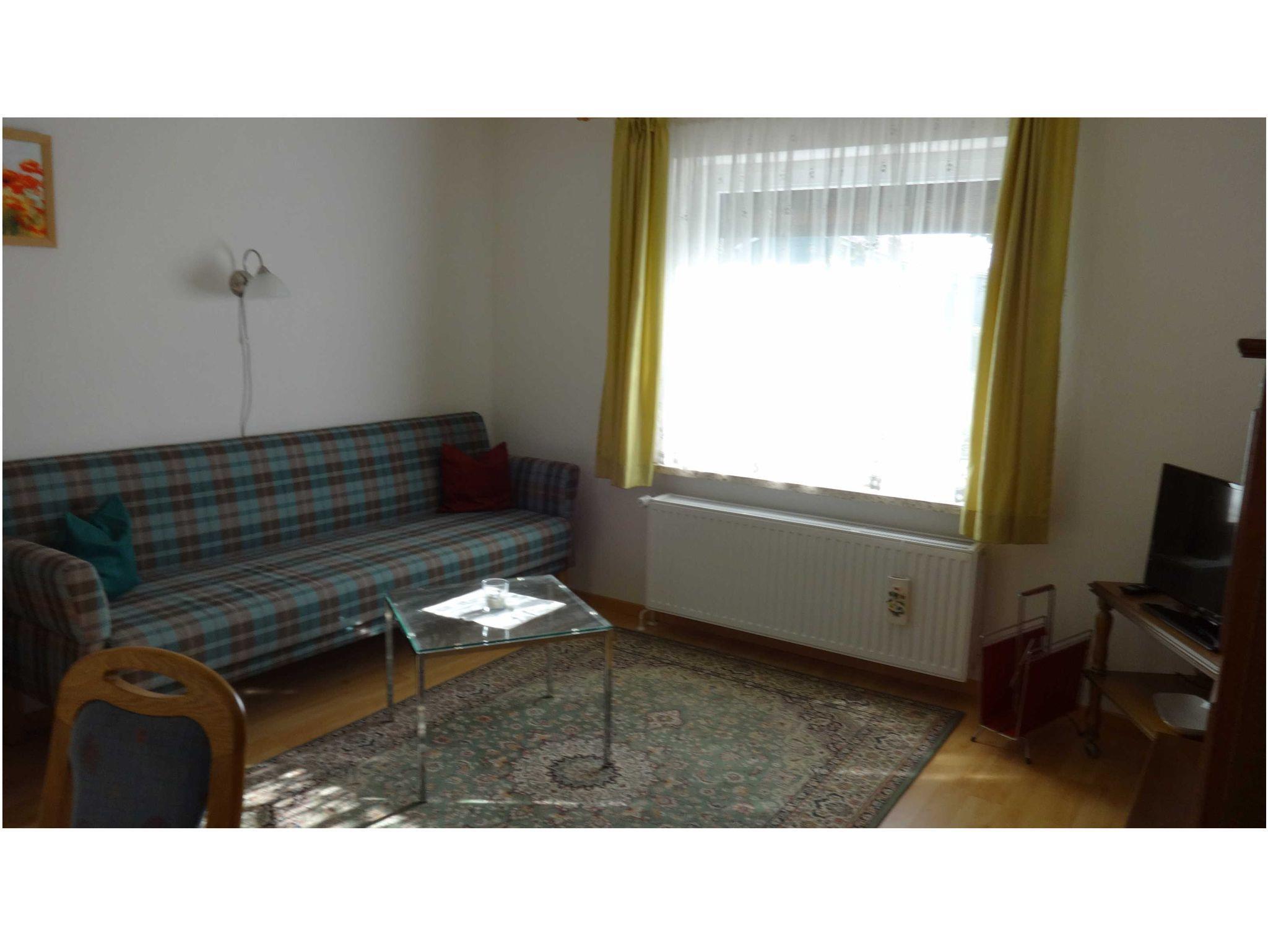 • Im Wohnzimmer befindet sich die Eßecke und eine Couchgarnitur. Sat.-Farbfernsehrer.