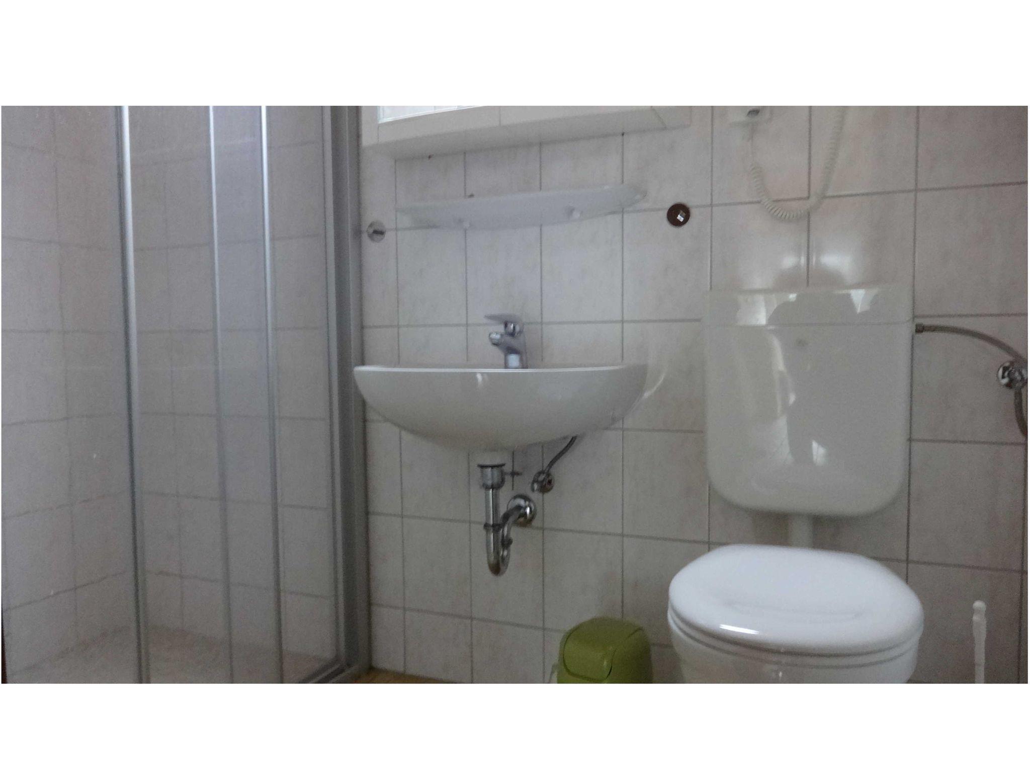 • Duschbad/WC ohne Stolperkanten durchgefliest. Nur wegen der Schiebetüren gibt es eine niedrige Schiene davor. Keine zusätzlichen Haltegriffe, normale Toilettenhöhe.