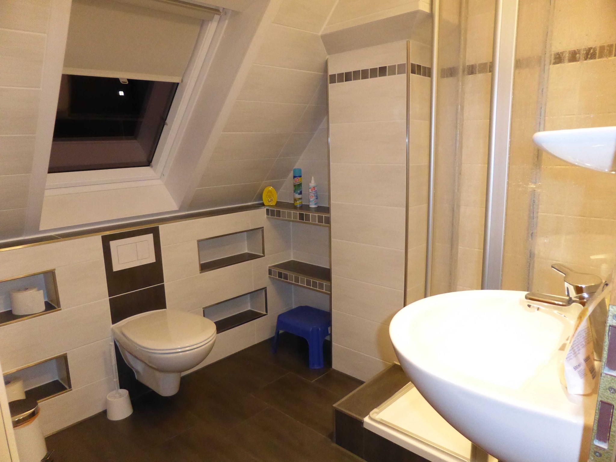 • Modernes Tageslicht-Badezimmer Dusche und WC.