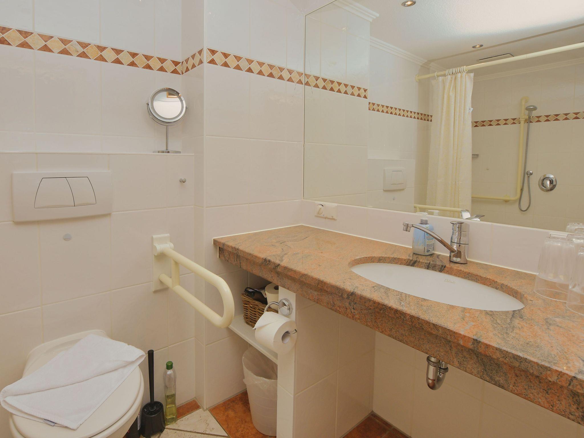 Modernes Bad - behindertengerecht ausgestattet - mit Dusche, WC, Bidet, großem Waschtisch mit Spiegel, ausreichend Ablageflächen, Fußbodenheizung, Handtuchtrockner und Radio.