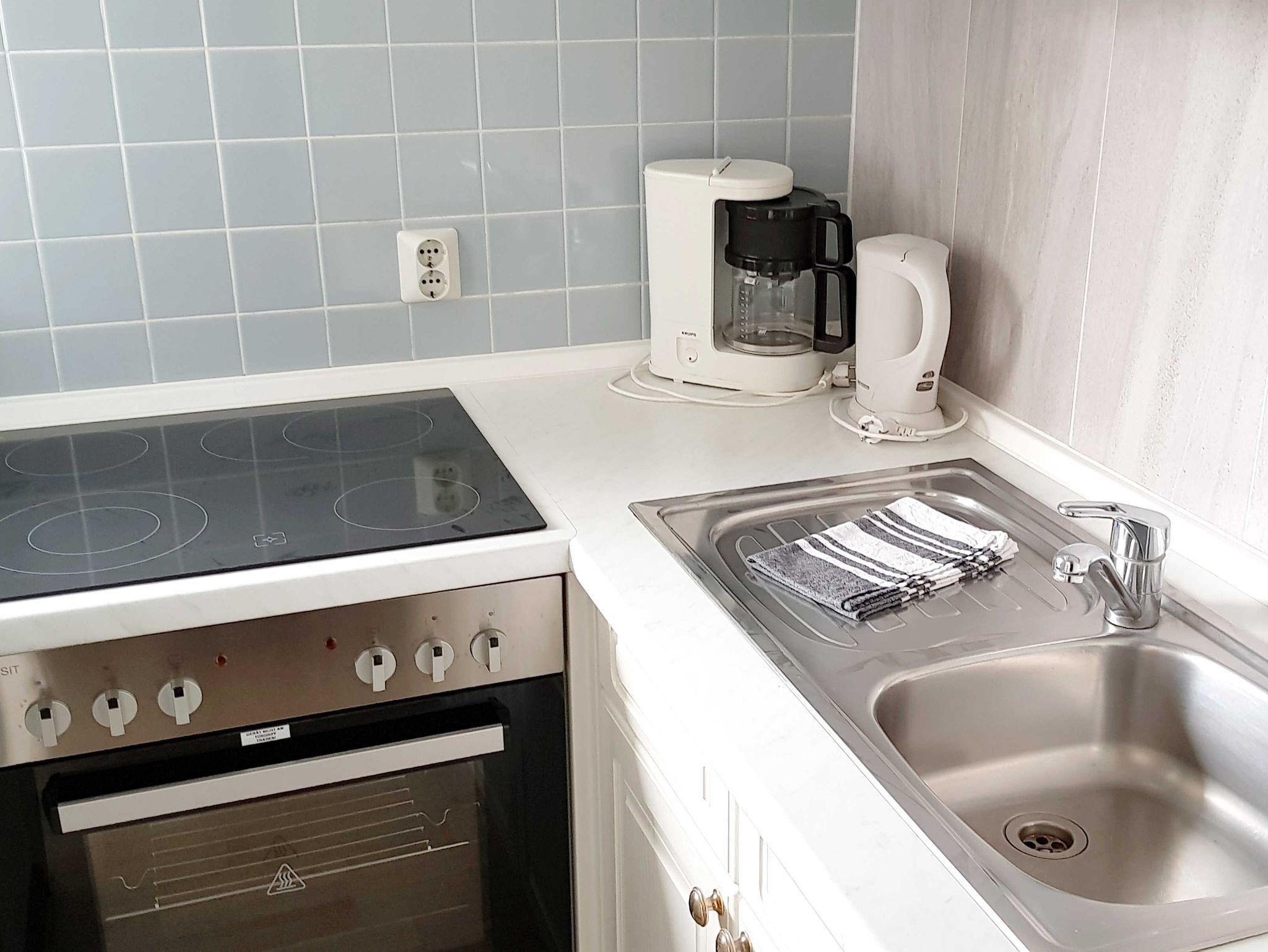 • separate Küche mit Ceranfeld (4 Kochstellen), Backofen, Mikrowelle (vorgehalten im Abstellraum), Kühlschrank, Kaffeemaschine, Toster und Geschirr für den täglichen Bedarf
