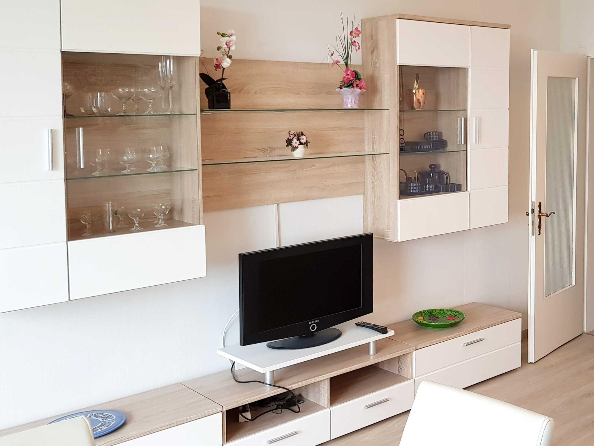 • Wohnraum mit Couchgarnitur (mit Schlaffunktion), Esstisch mit Stühlen, TV-Flachbild, Schrankwand