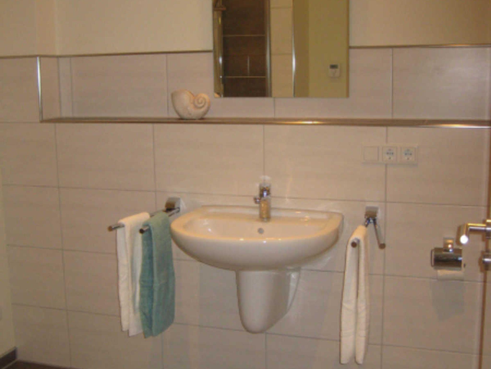 • Das modern eingerichtete Badezimmer ist mit Waschbecken, bodengleicher Dusche und WC ausgestattet.