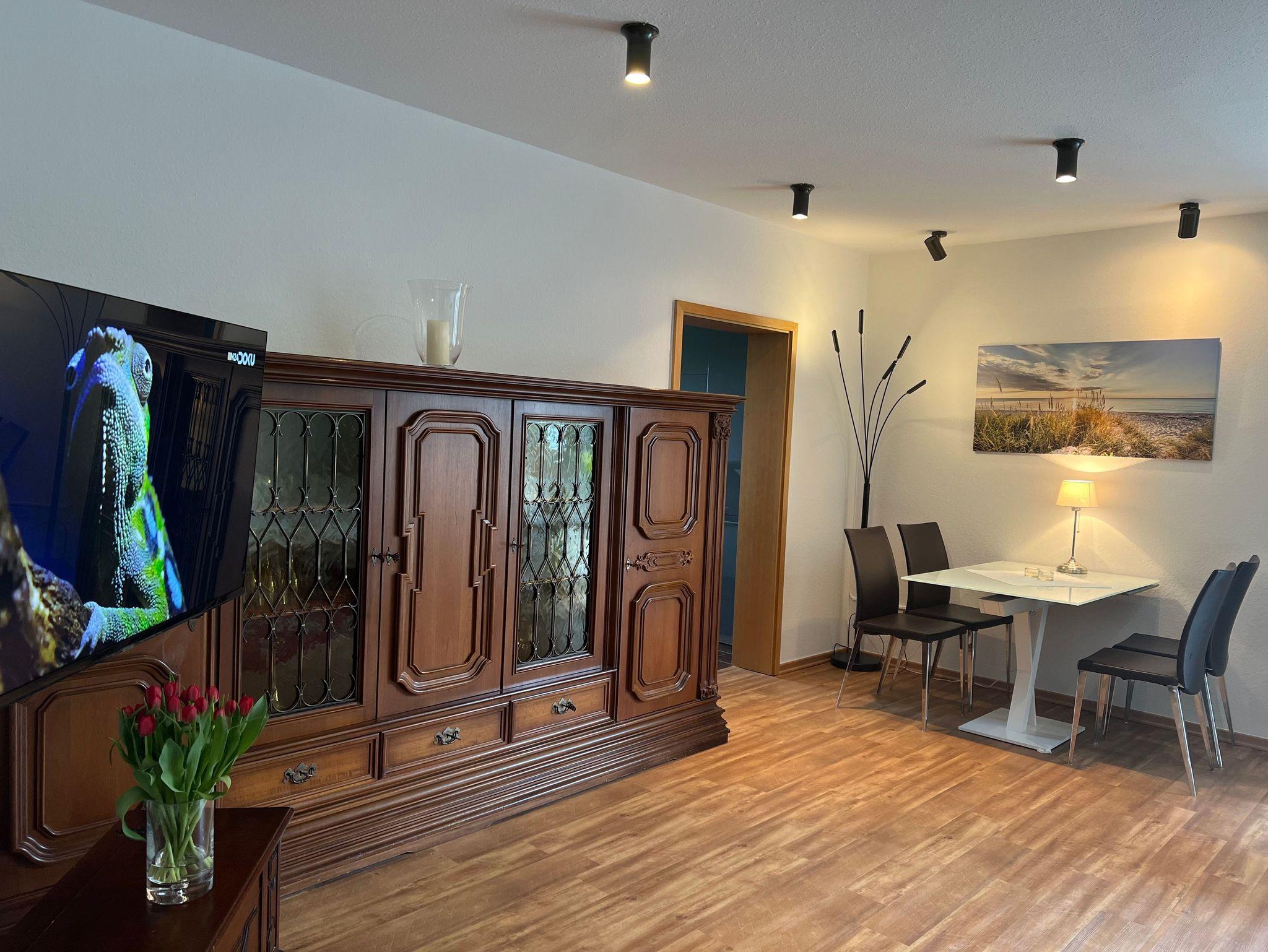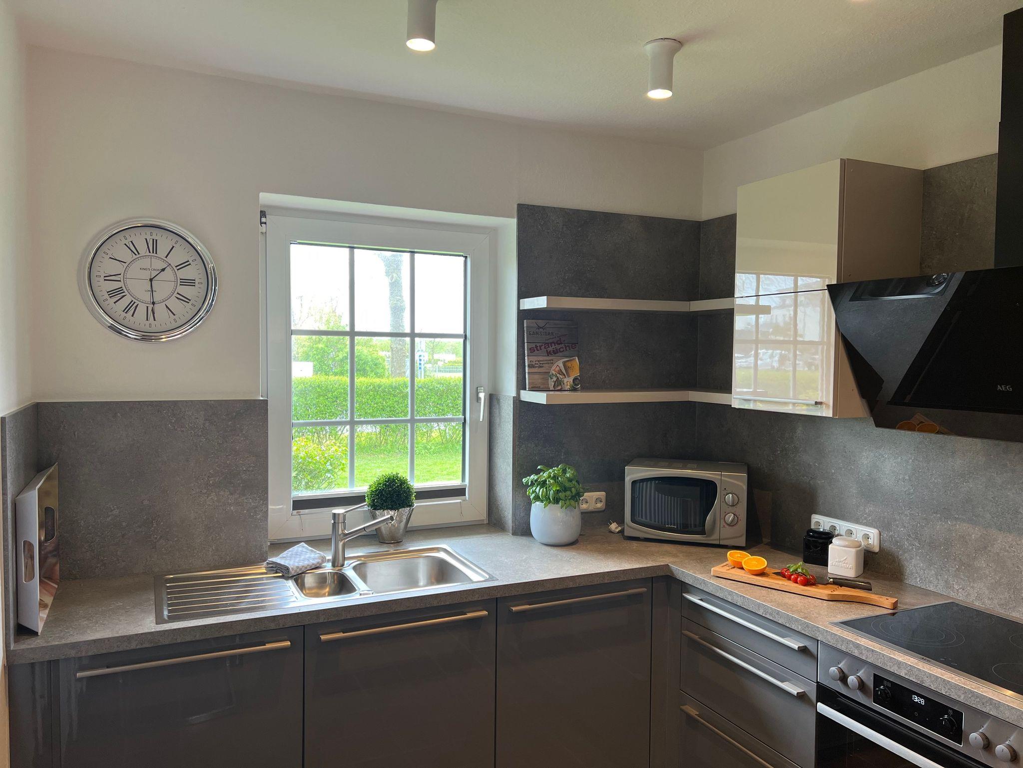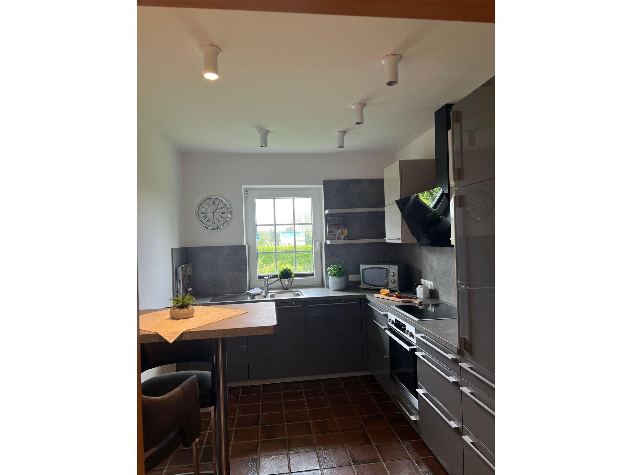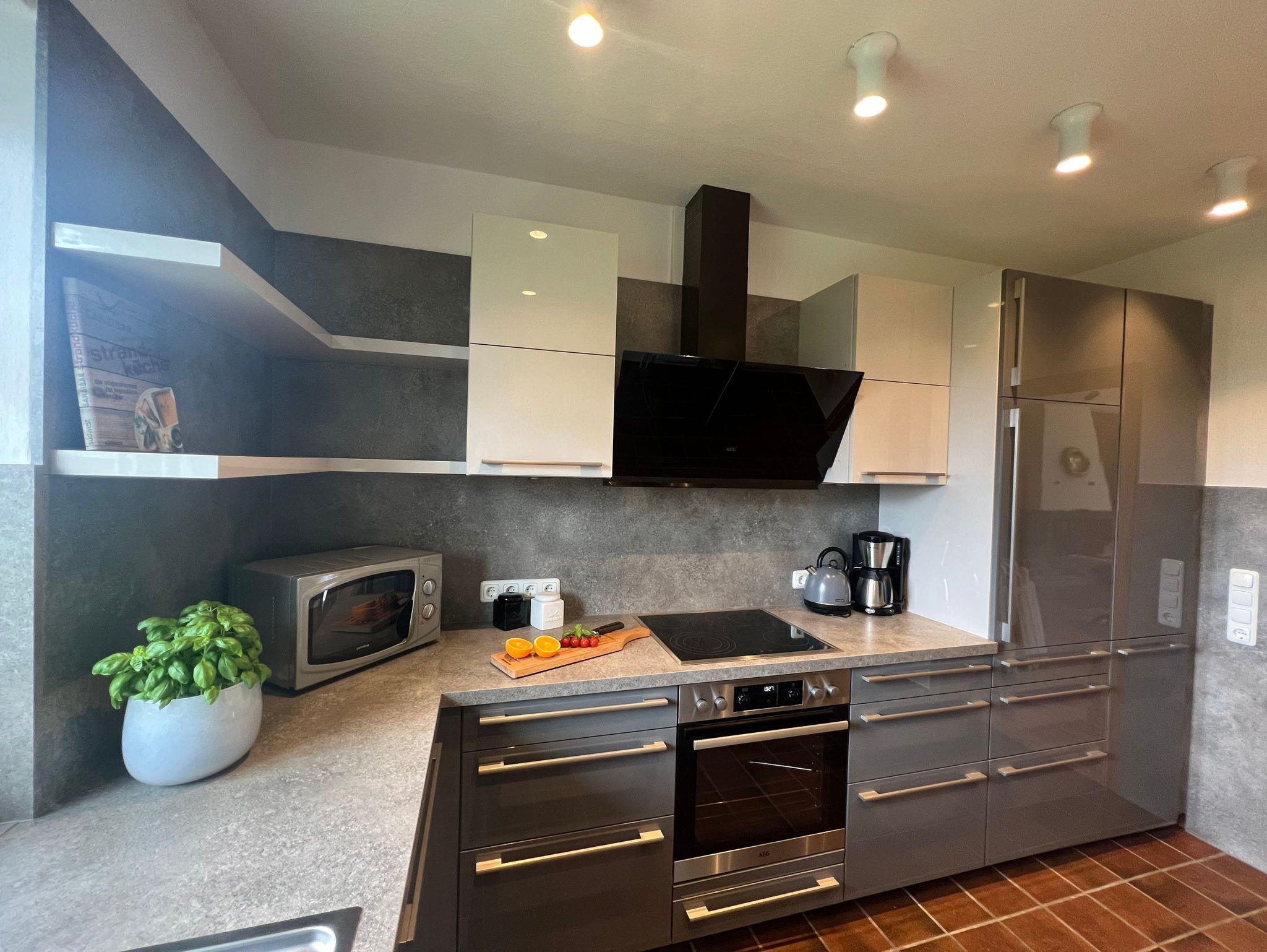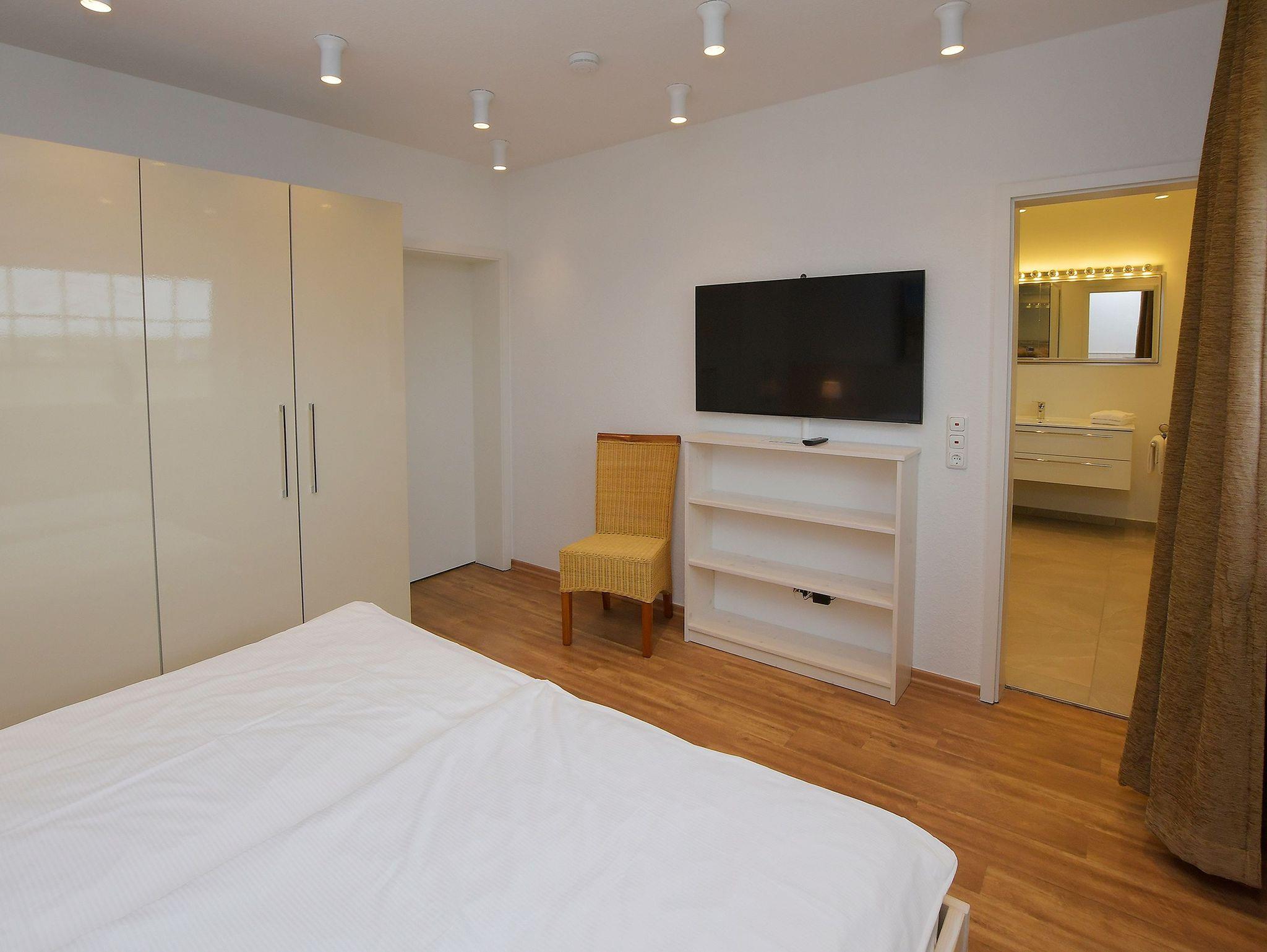 3-RAUM LUXUS-FERIENWOHNUNG, CA. 90 QM FÜR 2-4 PERSONEN Wohnraum mit Wohnzimmerschrank, Couchgarnitur, 1 Sessel, SAT-Smart-TV, Stereoanlage, Deckenstrahler, Laminatböden, hochwertige Teppiche, große Kaminwand, Terrasse mit Strandkorb und Gartenmöbel 1 Schlafraum mit Doppelbett, 2 Nachttischen, SAT-Smart-TV, großem Kleiderschrank, Wertfach 1 Schlafraum mit 2 Einzelbetten, großem Nachttisch, Kleiderschrank Separate Küche mit Essecke: Küchenzeile mit 4 Platteninduktionsherd inkl. Backofen, Spüle, Kühlschrank, Abzugshaube und Geschirrspülmaschine, Geschirr und Hausrat, Kaffeemaschine, Mikrowelle, Wasserkocher und Toaster 1 großes Bad mit Erlebnisdusche, WC, Waschbecken, Spiegelschrank, Föhn 1 Bad mit Dusche, WC, Waschbecken und Spiegelschrank