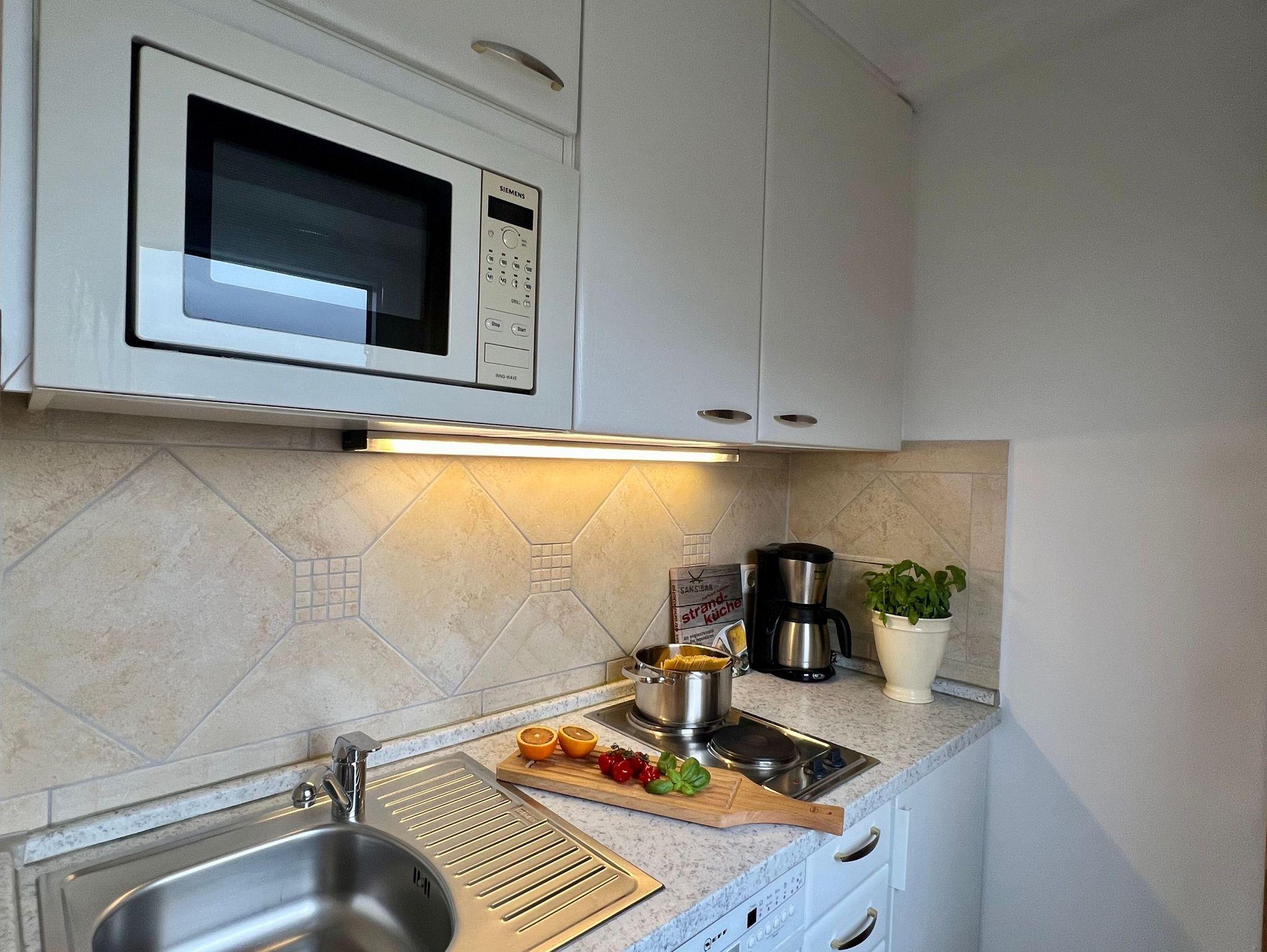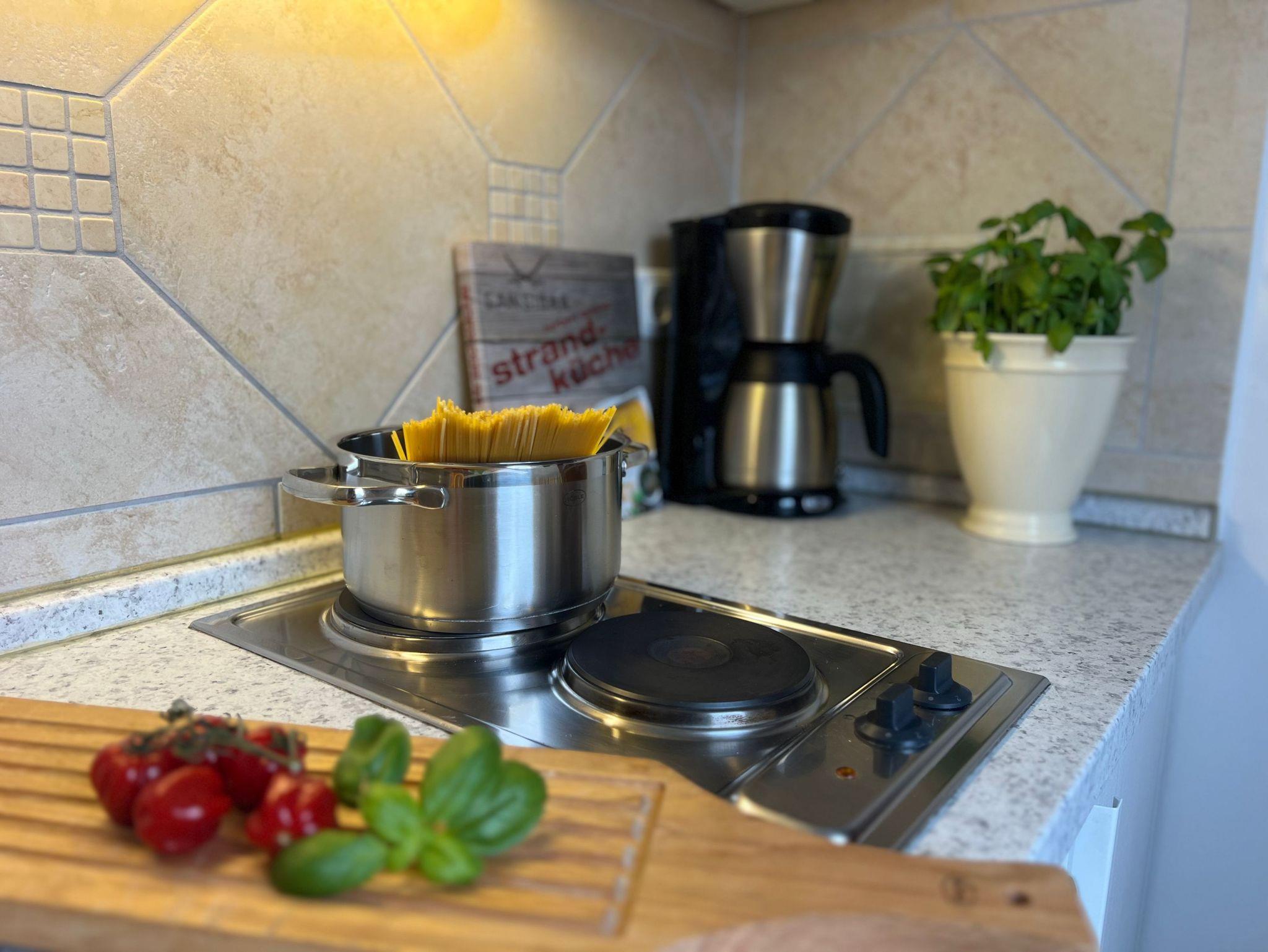 • Küchenzeile mit 2 Kochplatten, Spüle, Spülmaschine, Kühlschrank mit Gefrierfach, Mikrowelle, Kaffeemaschine, Toaster und Wasserkocher. Die Küche ist komplett bestückt mit Geschirr, Bestecken, Töpfen, etc.