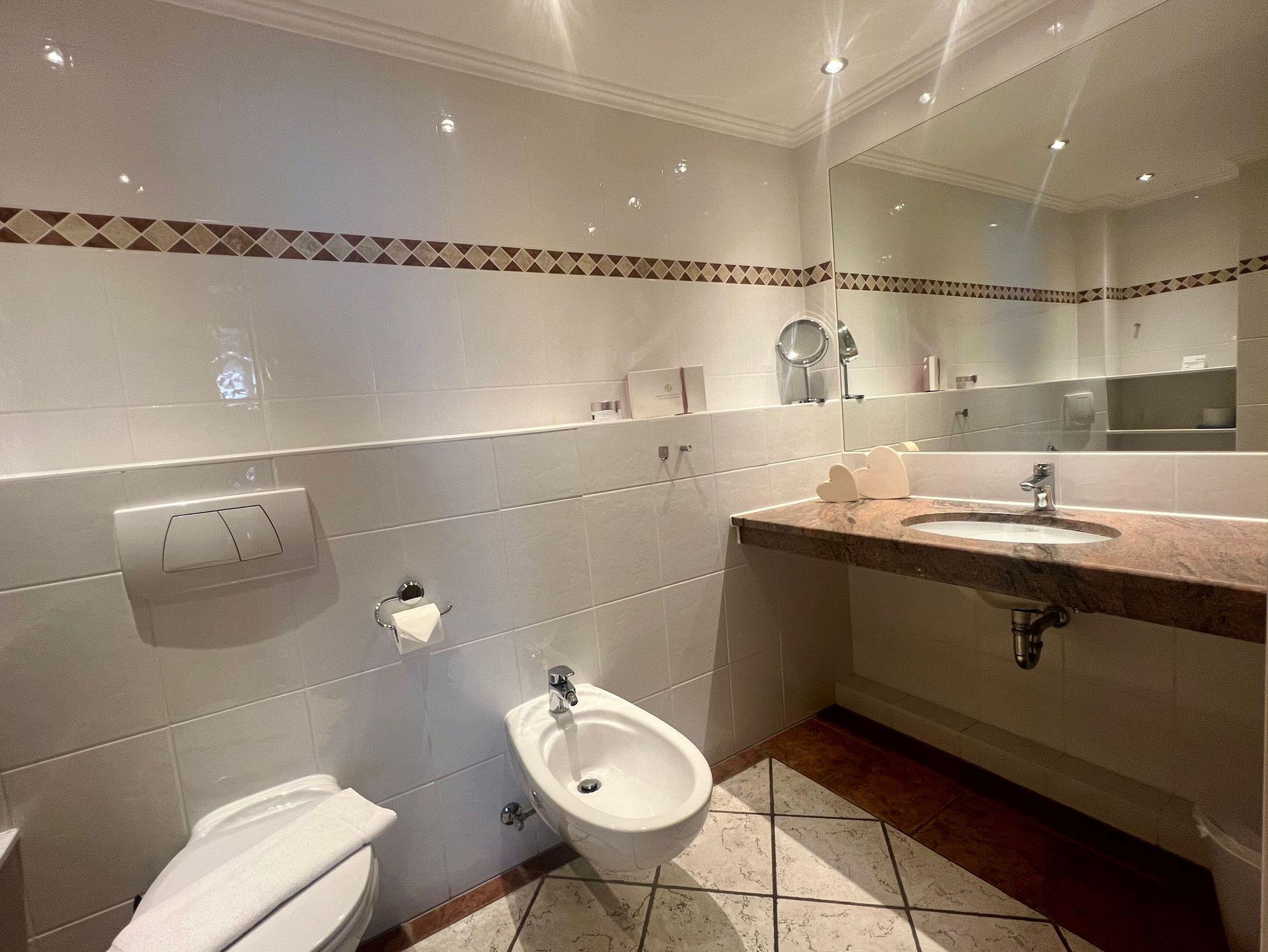 Modernes Bad mit Dusche, WC, Bidet, großem Waschtisch mit Spiegel, ausreichend Ablageflächen, Fußbodenheizung, Handtuchtrockner und Radio.