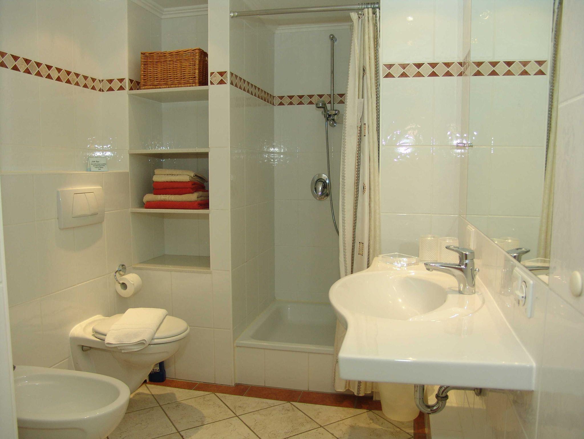 • Duschbad mit Dusche, WC, Bidet, großem Waschtisch mit Spiegel, ausreichend Ablageflächen, Fußbodenheizung, Handtuchtrockner und Radio.