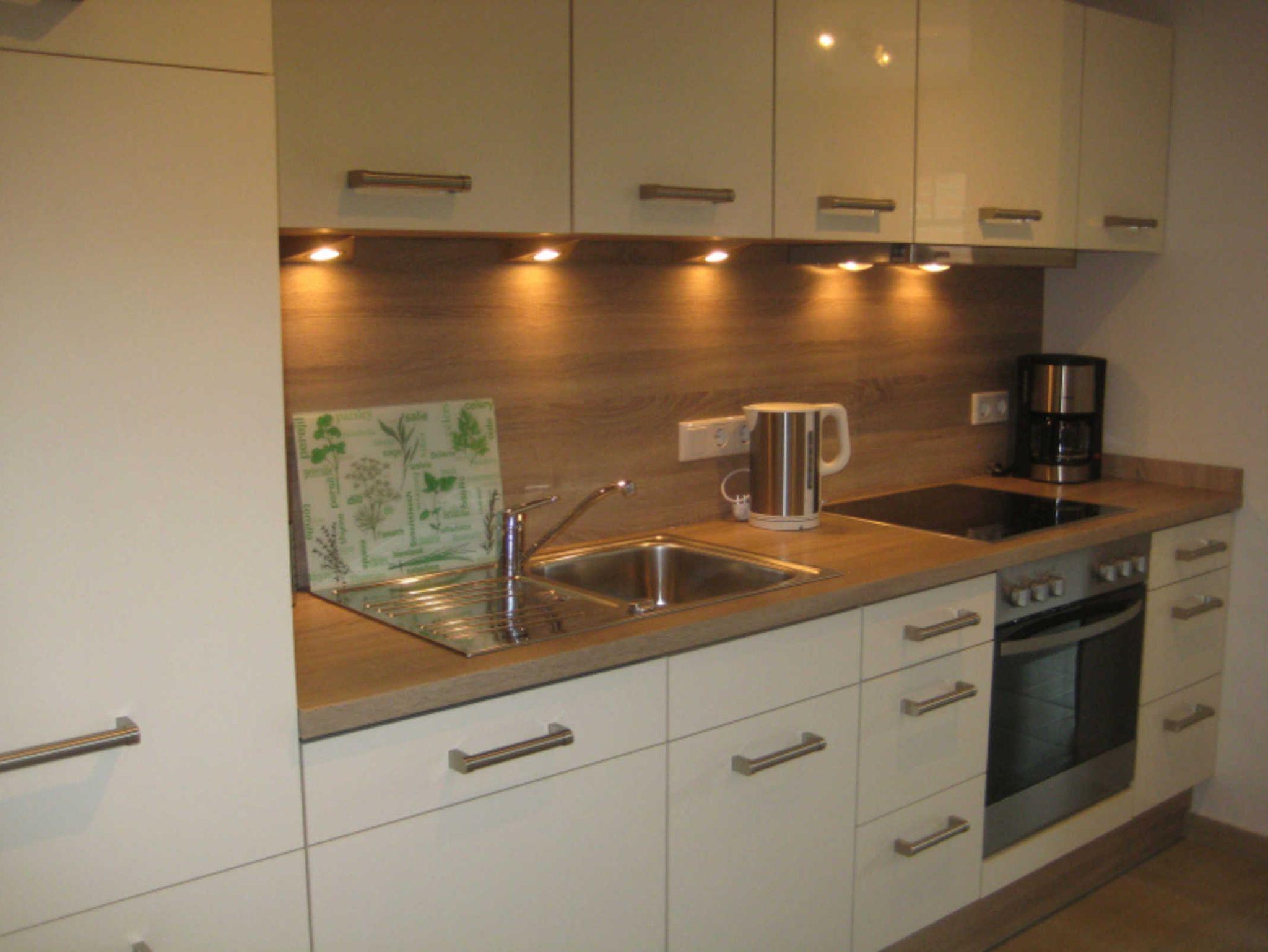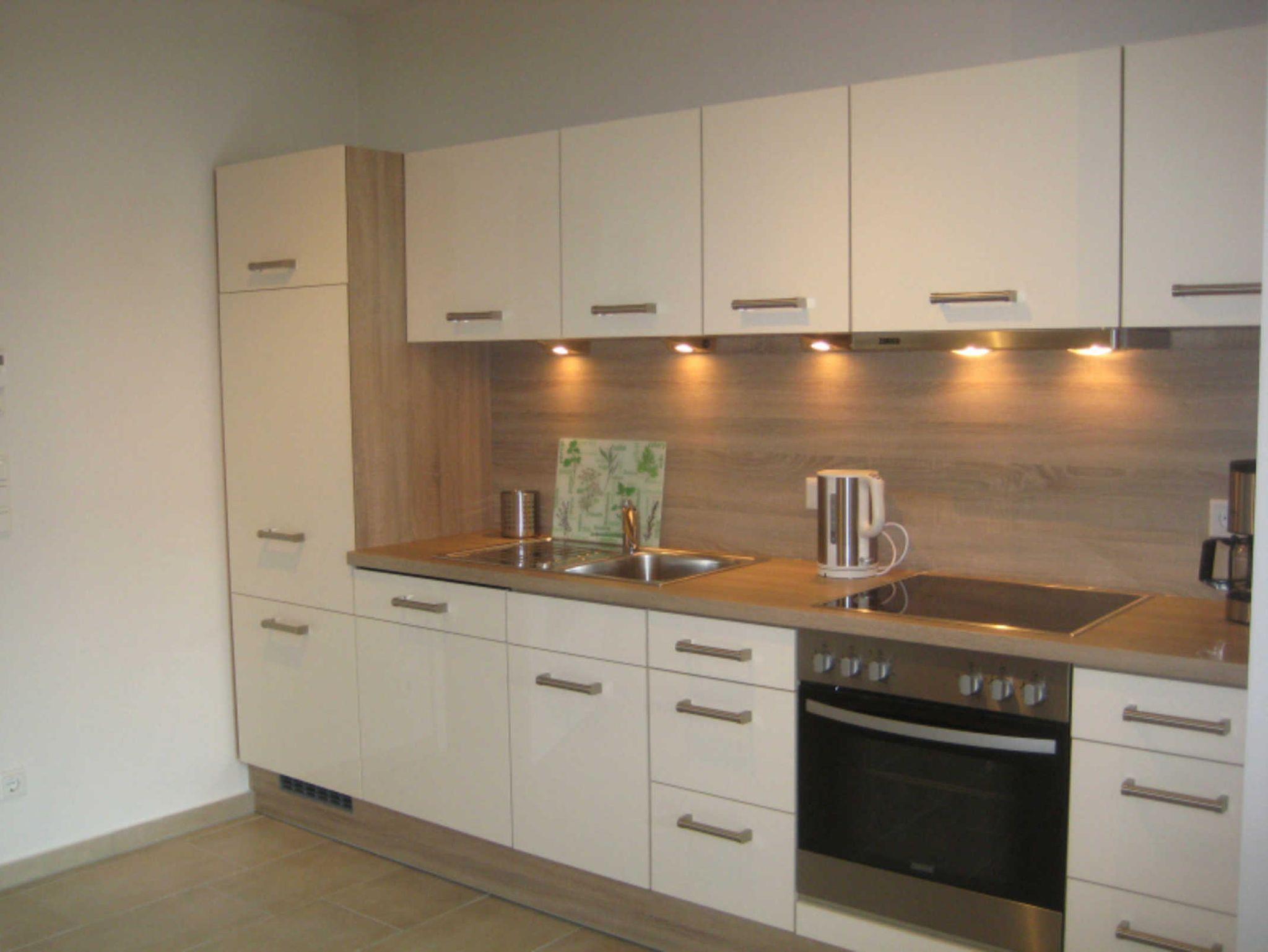 • Im Wohnzimmer integriert ist eine vollständig ausgestattete Küchenzeile. Sie verfügt über ein Cerankochfeld mit Backofen, Mikrowelle, Geschirrspülmaschine, Kühlschrank mit Tiefkühlfach, sowie Kaffeemaschine, Wasserkocher und Toaster. Geschirr und Hausrat sind selbstverständlich ausreichend vorhanden.