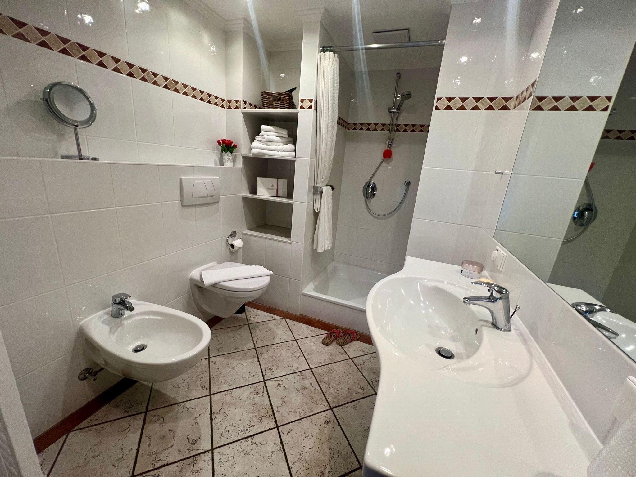 Dusche/WC, Bidet, großer Waschtisch mit Spiegel, ausreichend Ablageflächen, Fußbodenheizung, Handtuchtrockner und Radio.