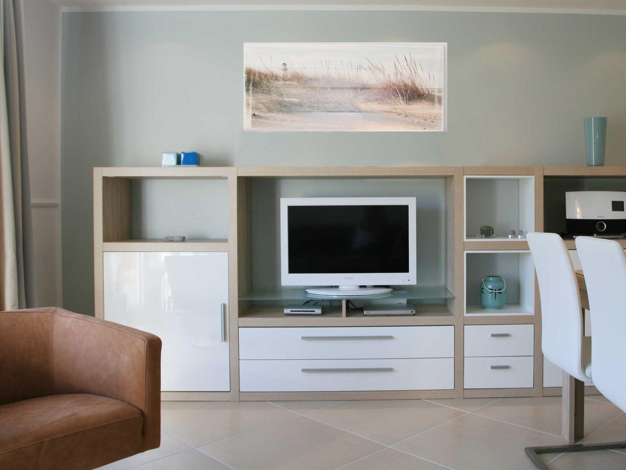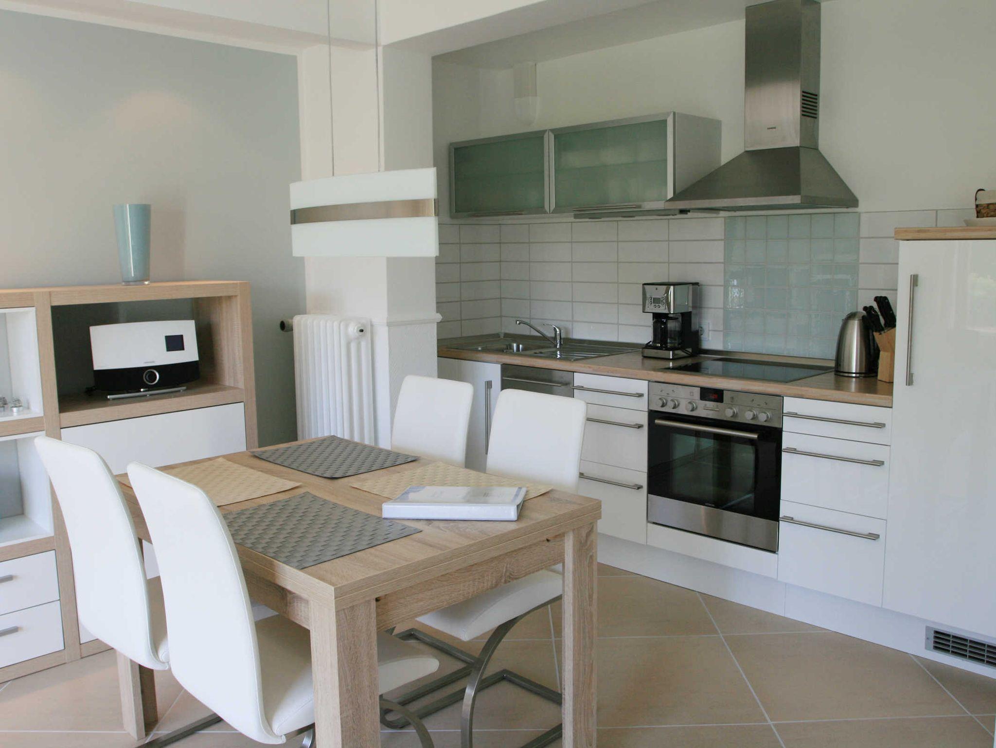 Wohnraum mit Funktionssofa, Sitz- und Essecke sowie Highboard mit DVD-Player, Radio, TV. Bei der Einrichtung des Wohnzimmers wurden nur hochwertige Materialien verwendet. Moderne Echt-Leder-Designermöbel erwarten Sie und laden zum Entspannen ein. Neben einem großen Flatscreen mit digitalem TV-Empfang sorgt eine Hifi-Anlage für kompromissloses Entertainment. Genießen Sie die maritime und helle Atmosphäre in diesem Appartement. Zum Wohnzimmer offene weiße Hochglanz-Einbauküche mit Backofen u. Geschirrspüler.