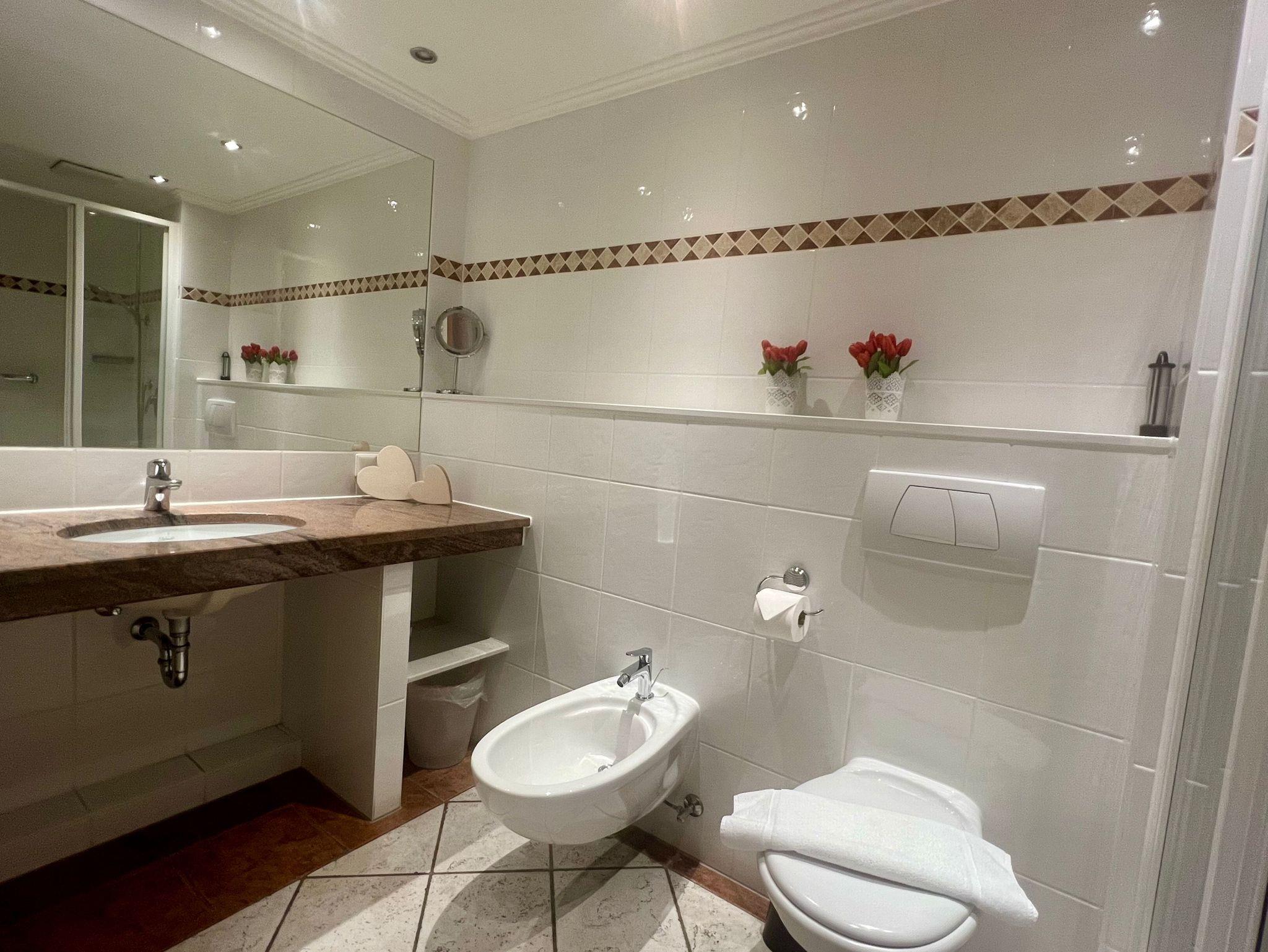 • Modernes Bad mit Dusche, WC, Bidet, großem Waschtisch mit Spiegel, ausreichend Ablageflächen, Fußbodenheizung, Handtuchtrockner und Radio.