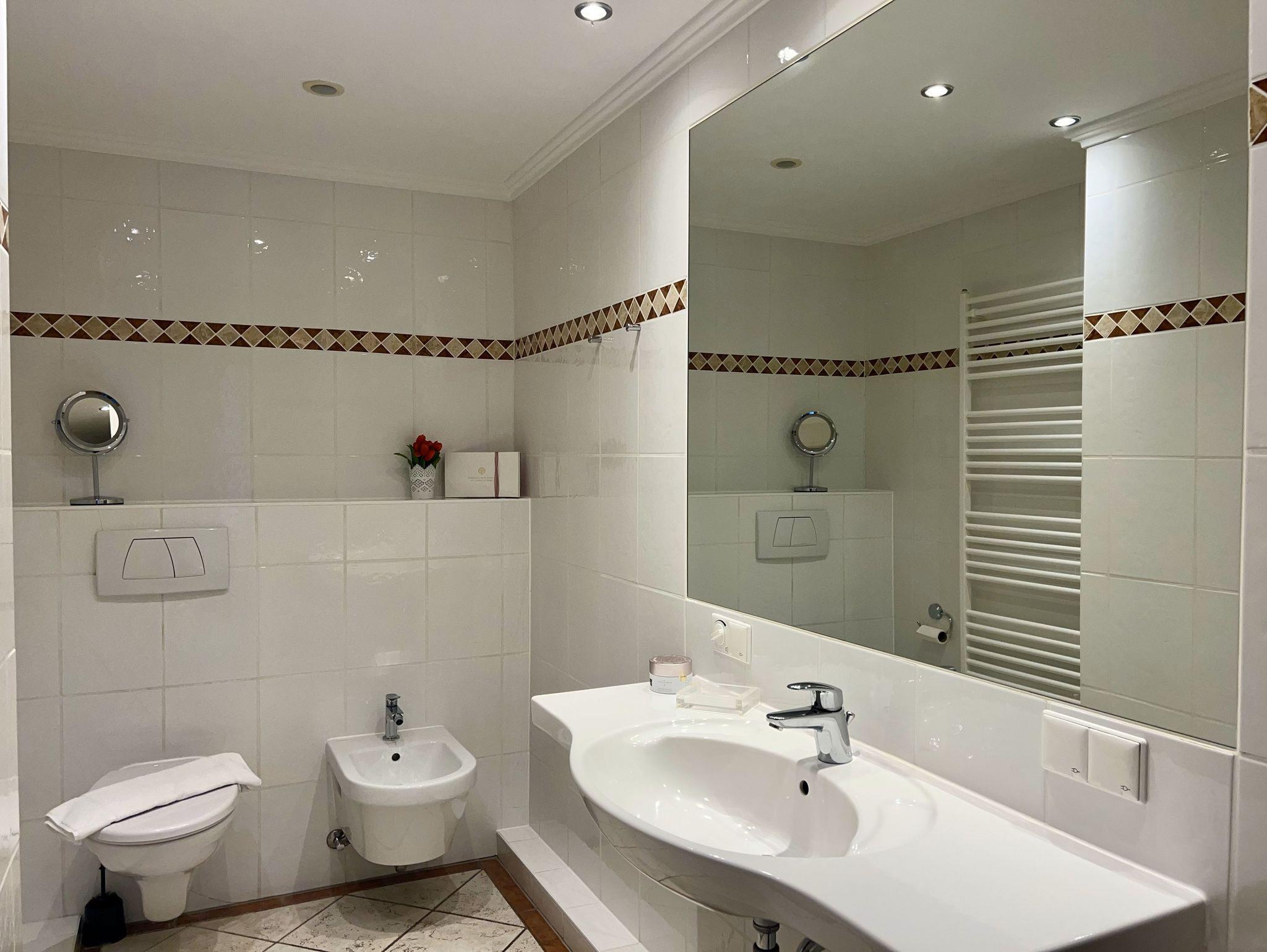 • Dusche, WC, Waschtisch mit großem Spiegel und Ablageflächen