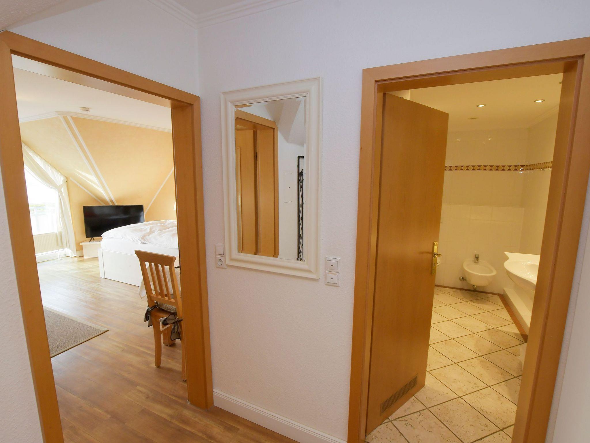 • Kombinierter Wohn-Schlafraum mit großem Doppelbett, 2 Sesseln, Esstisch mit Stühlen, SAT-TV, Stereoanlage, Balkon nach Südwesten mit Gartenmöbeln.