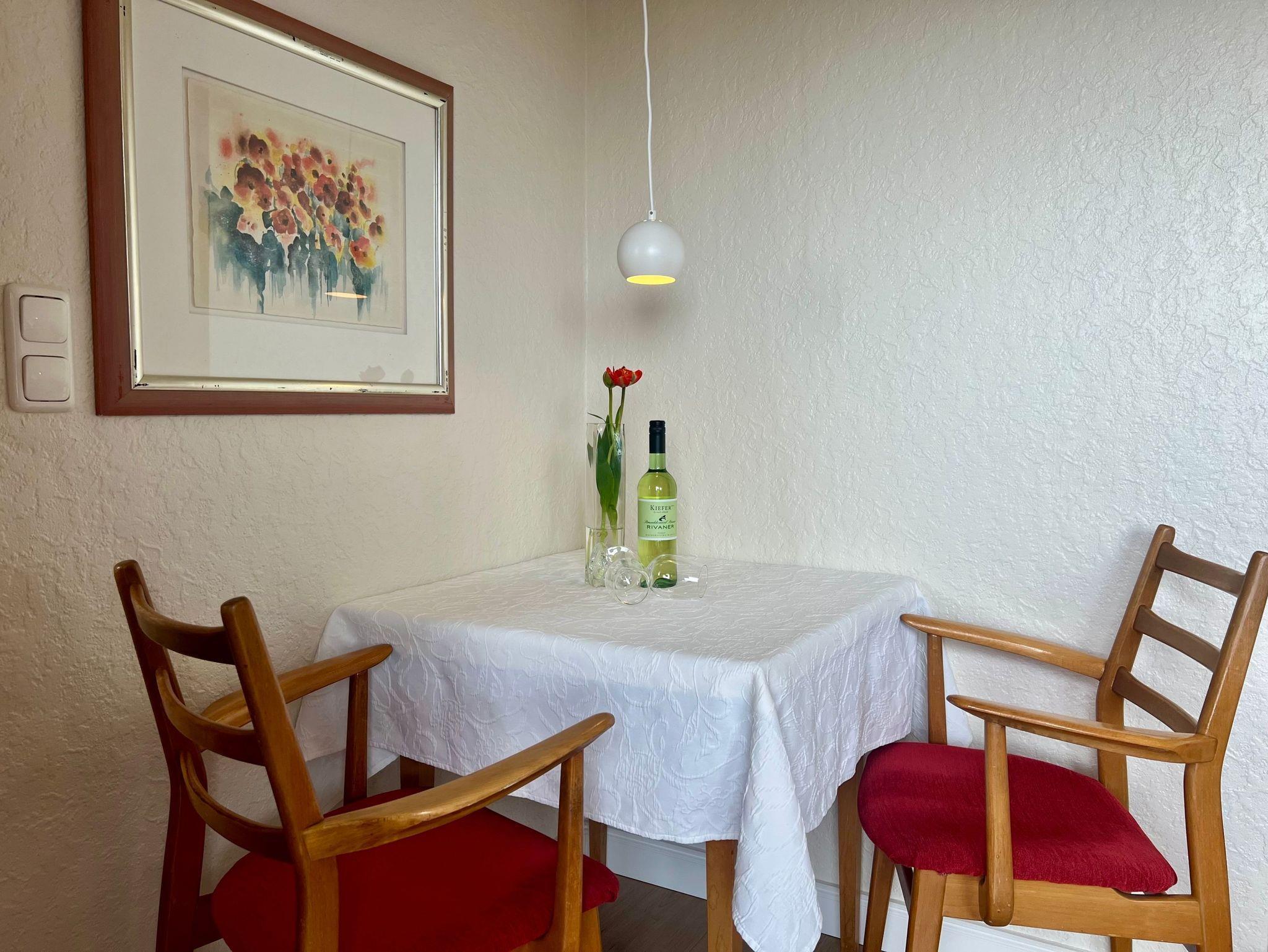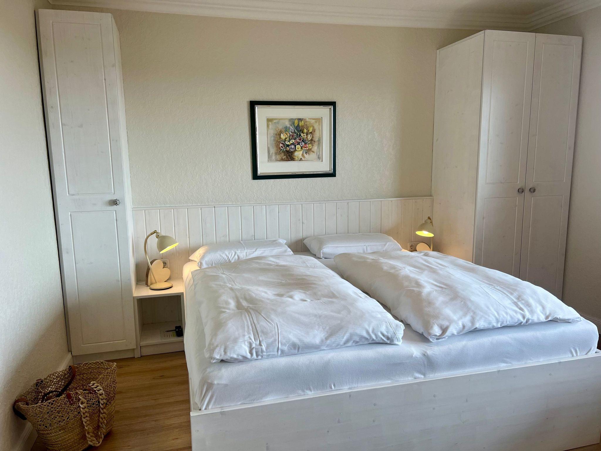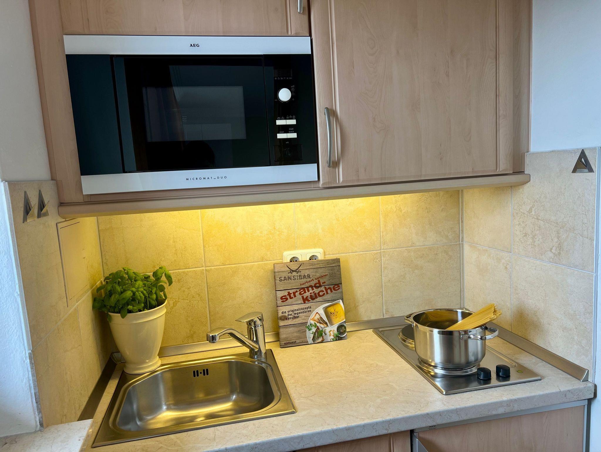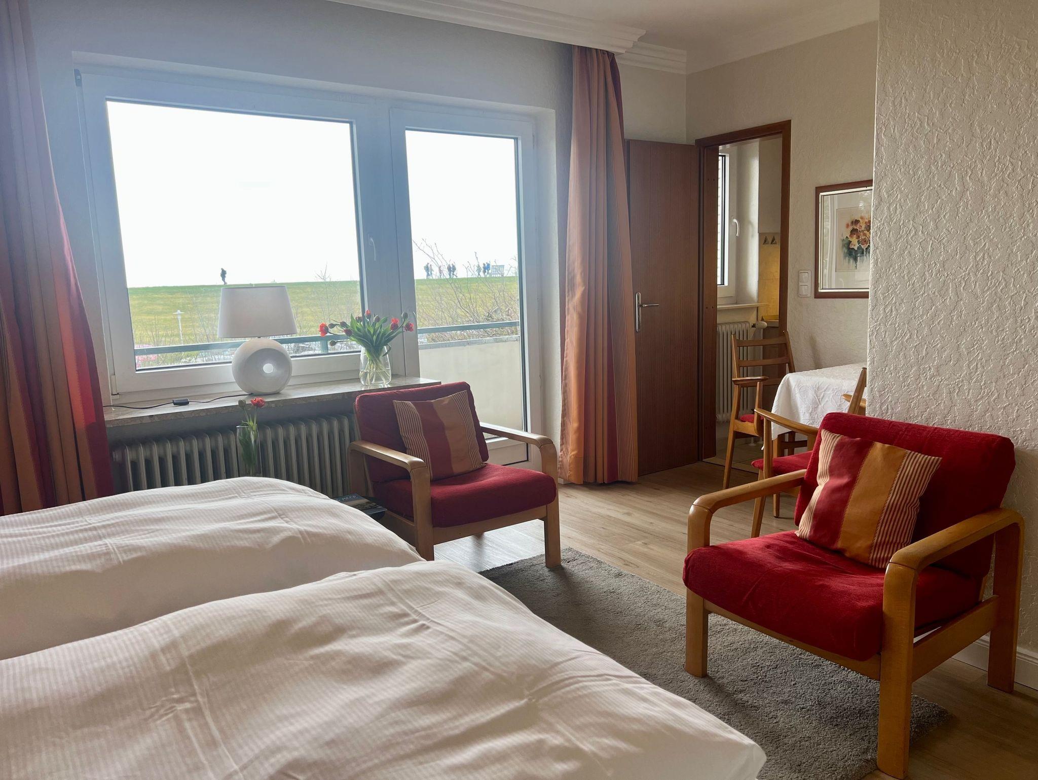 Appartement mit Balkon. Das kombinierte Wohn-Schlafzimmer bietet mit Blick über den Deich eingeschränkten Meerblick. Es ist geräumig und mit 2 Sesseln und großem Doppelbett ausgestattet. Die moderne Küchen enthält Herd mit 2 Kochstellen, Mikrowelle, Kühlschrank mit Gefrierfach, Kaffeemaschine und Wasserkocheer. Die Küche ist komplett bestückt mit Geschirr, Bestecken, Töpfen, etc.