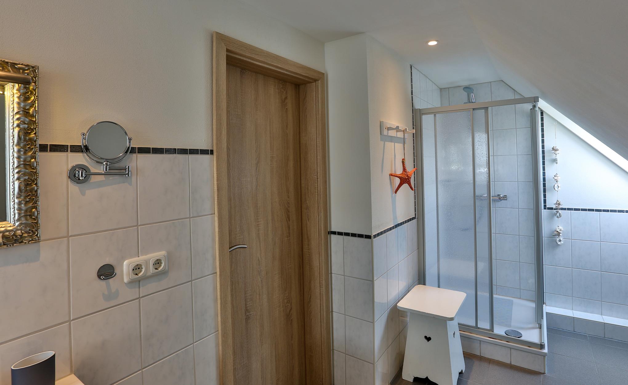 Im großzügigen Duschbad finden Sie nicht nur das WC, eine geräumige Dusche und einen Schrank unter dem Waschbecken, sondern auch einen Fön und einen extra Schminkspiegel und einen Erste-Hilfe-Kasten für den Notfall.