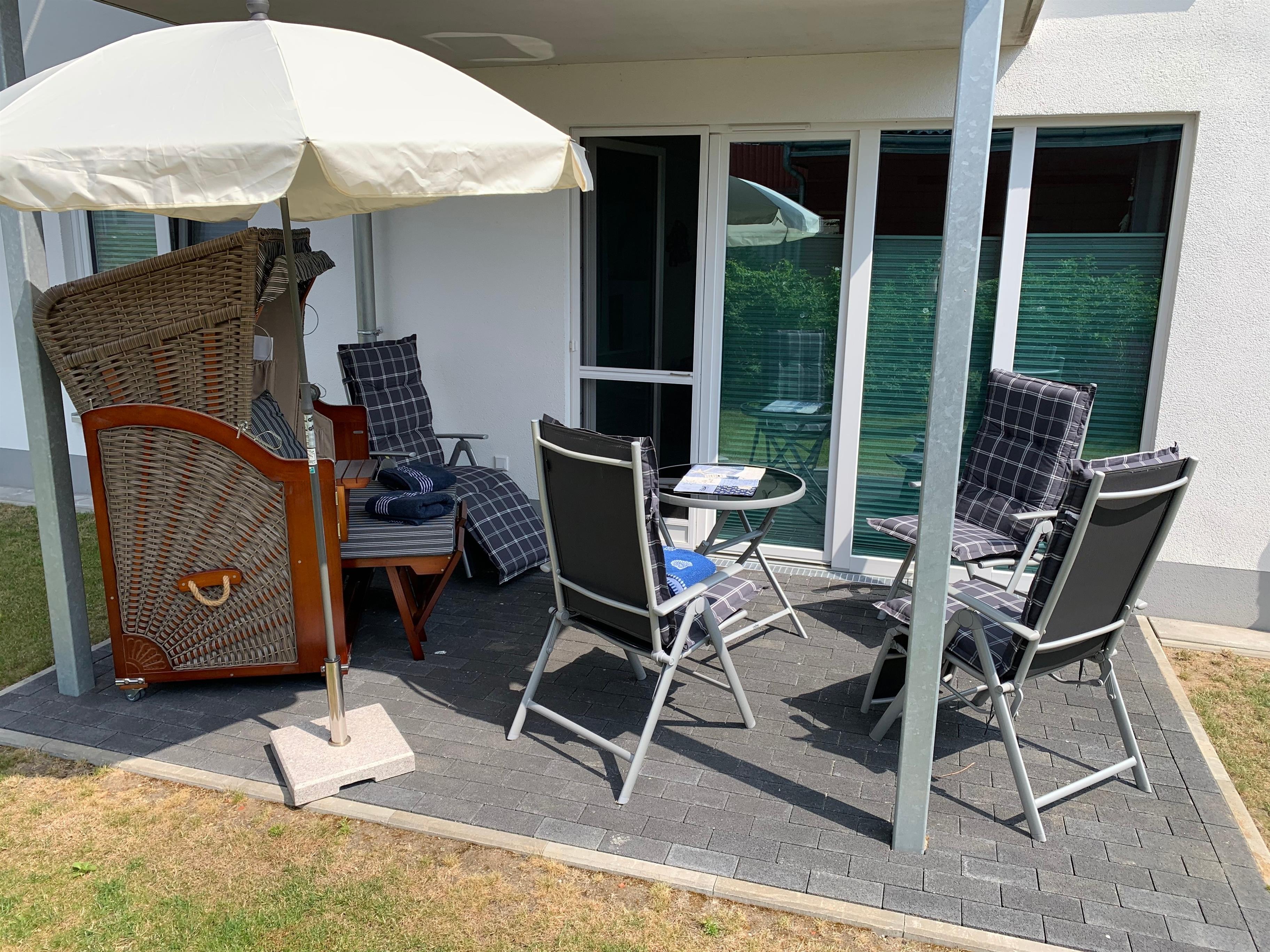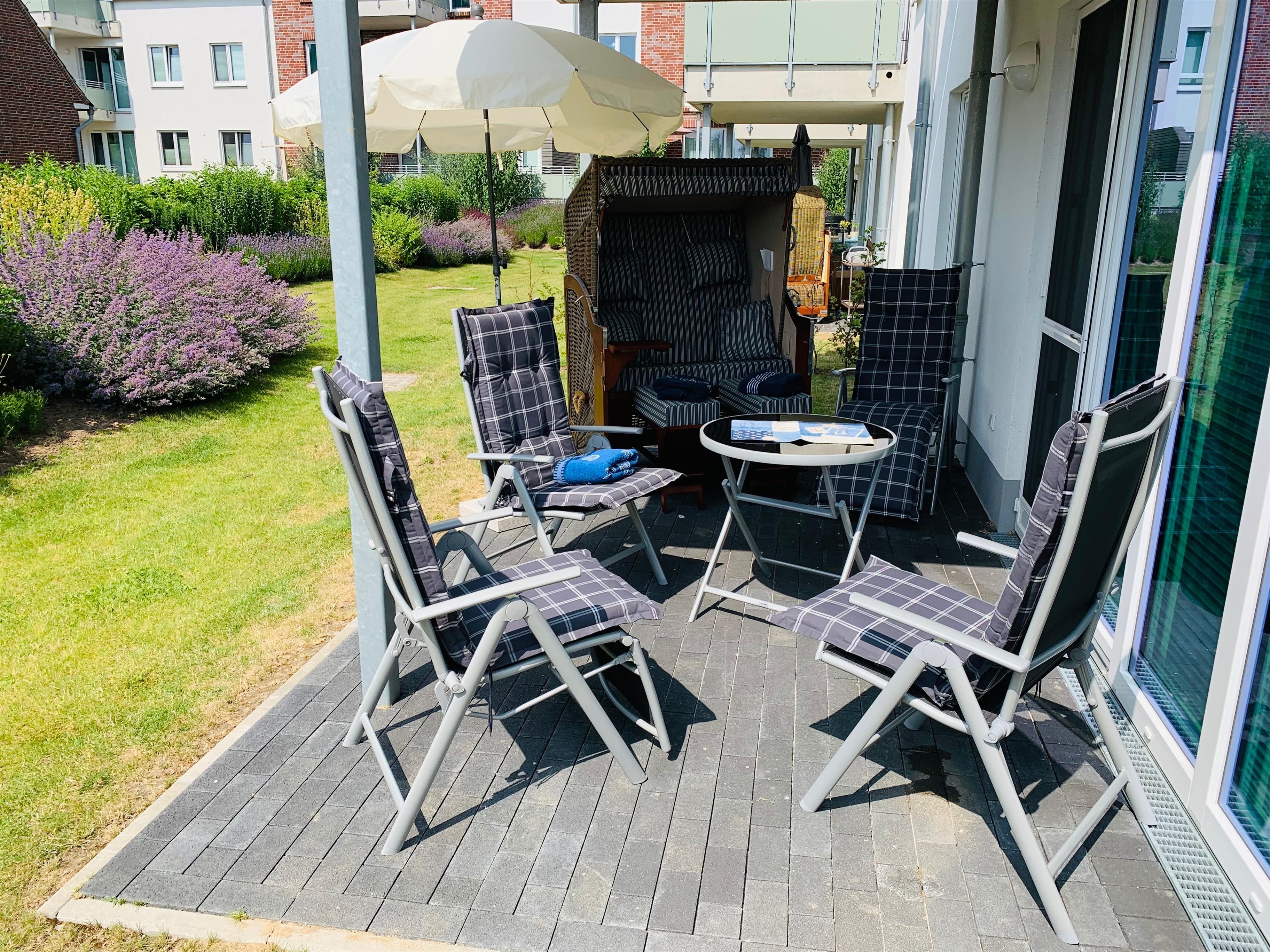 Moderne Ferienwohnung in Büsum mit Terrasse, eigenem Strandkorb und Tiefgaragenstellplatz, ideal für einen ruhigen und zentralen Urlaub.