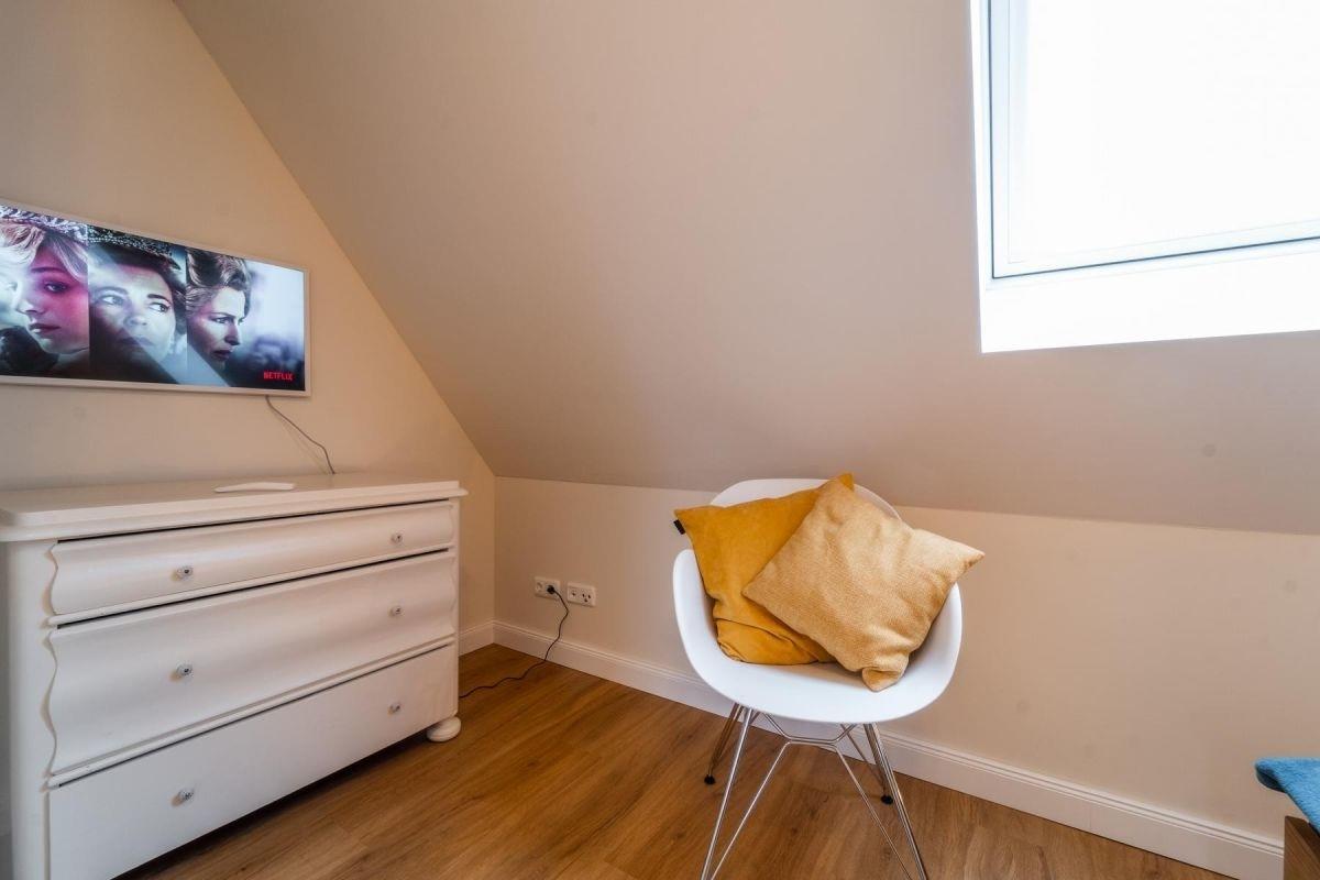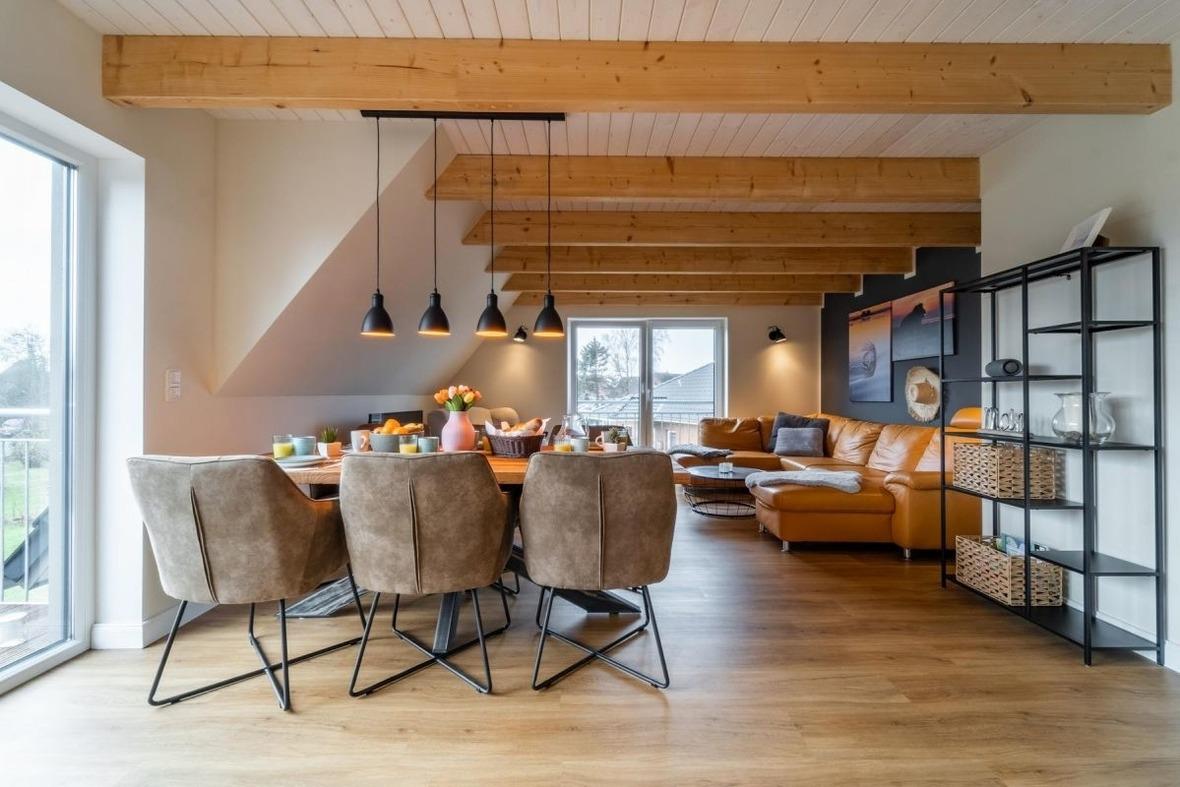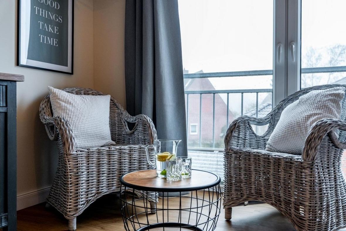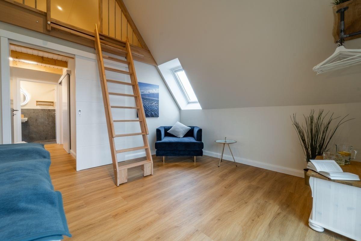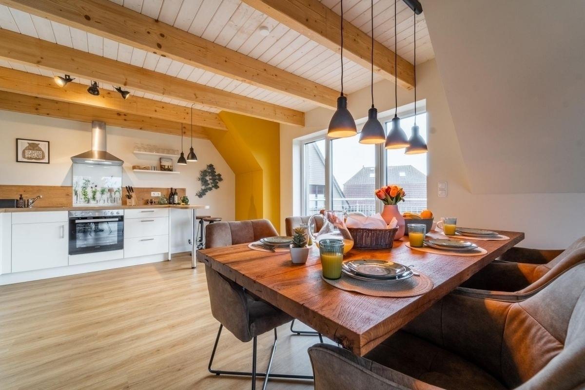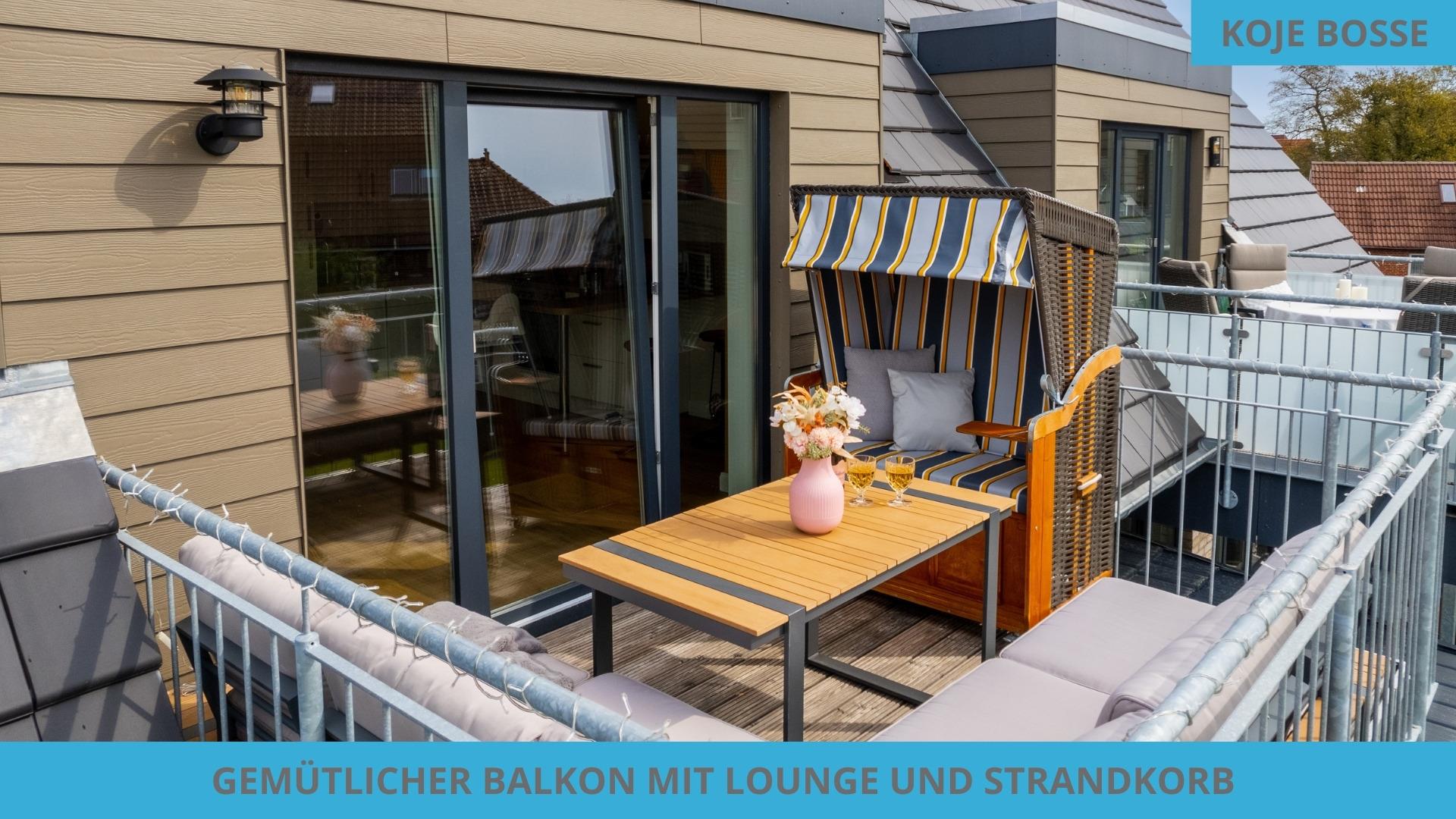 Moderne Maisonette-Ferienwohnung in Büsum mit Balkon, Strandkorb und Fußbodenheizung für entspannte Urlaubstage.