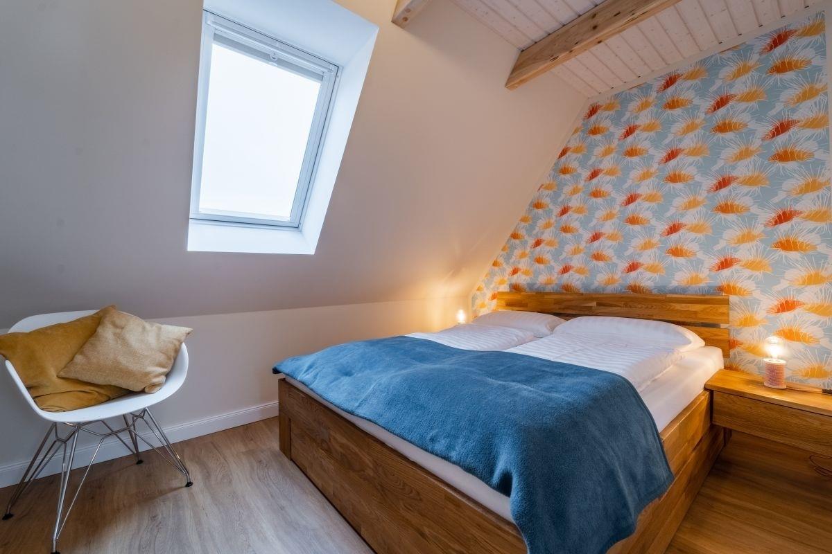 Im Dachgeschoss der Koje Bosse findet ihr ein weiteres hochwertig ausgestattetes Badezimmer. Für Familien oder dicke Freunde ist das zweite große Schlafzimmer inklusive Doppelbett auf dem Alkoven geeignet.
