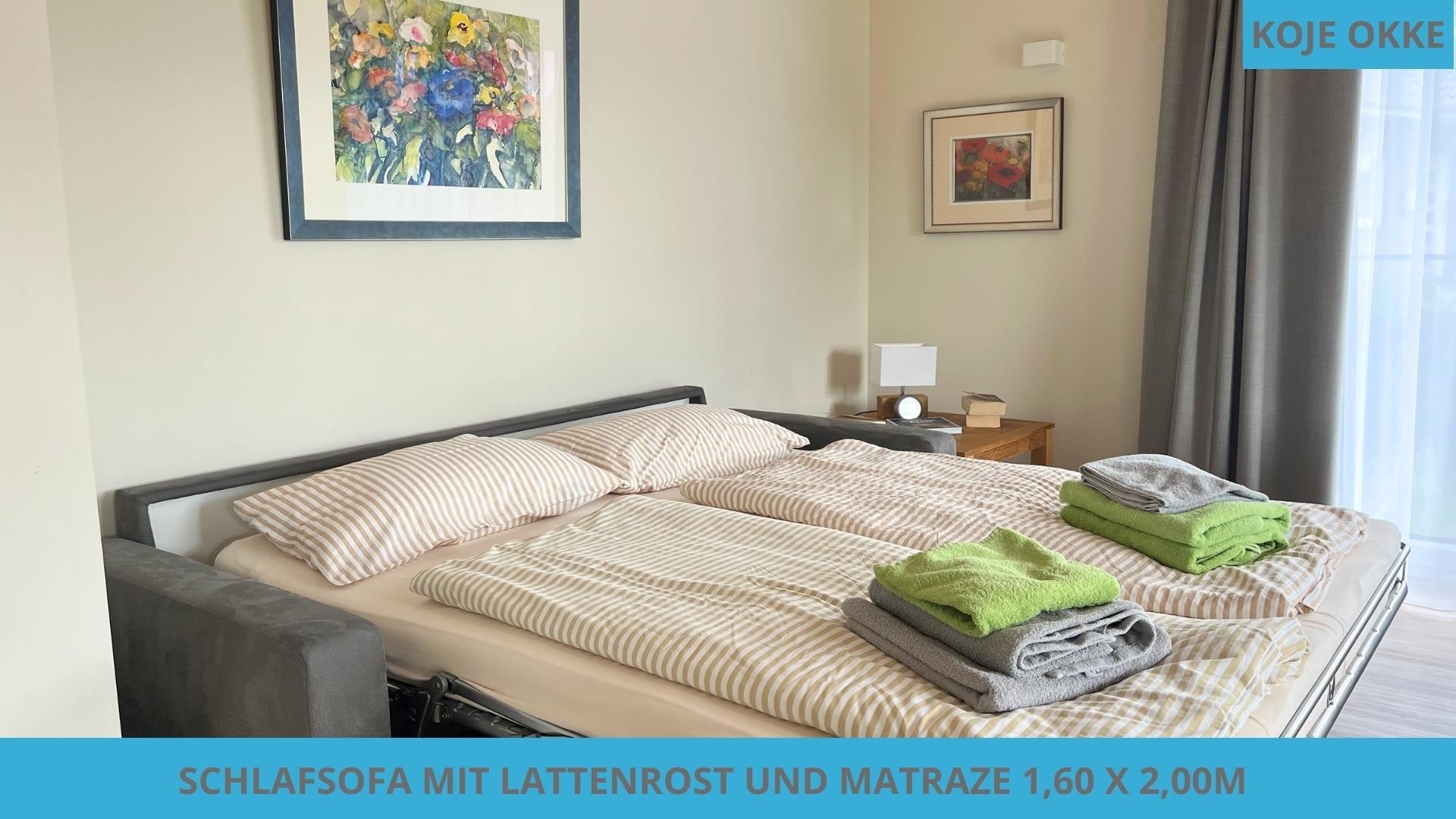 Bodentiefe Fenster sorgen für lichtdurchflutete Räume und die großzügigen Boxspringbetten im Schlafzimmer für einen erholsamen Schlaf. Die Wohnung Ose kann mit bis zu 4 Personen belegt werden. Im Wohnzimmer befindet sich für zwei weitere Gäste das komfortable Schlafsofa mit integriertem Lattenrost. Die neue Küche lädt euch zum Kochen ein.