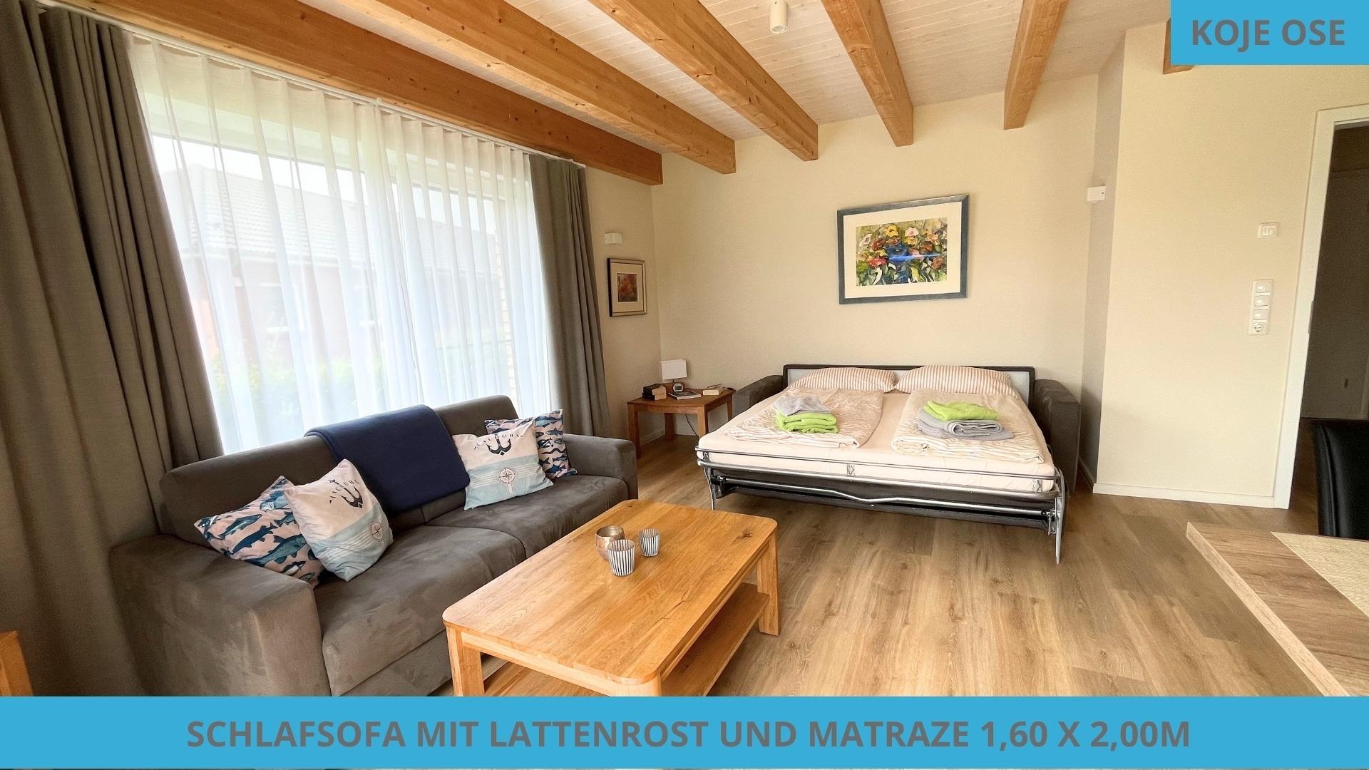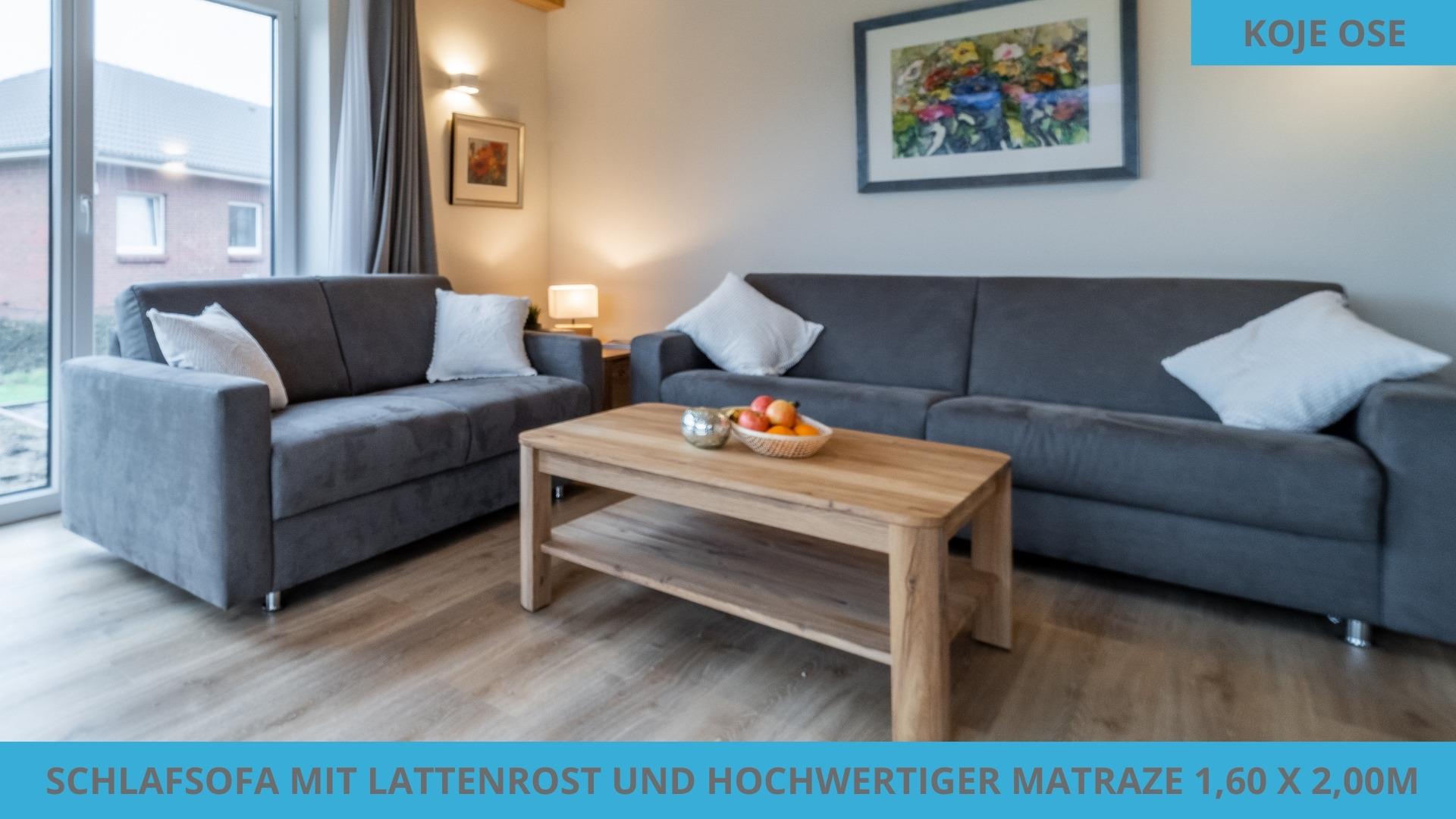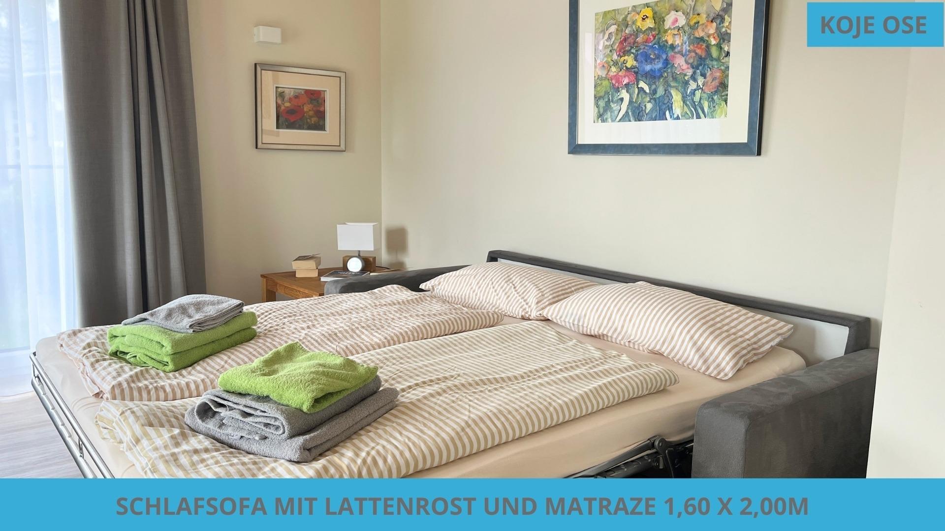 Bodentiefe Fenster sorgen für lichtdurchflutete Räume und die großzügigen Boxspringbetten im Schlafzimmer für einen erholsamen Schlaf. Die Wohnung Ose kann mit bis zu 4 Personen belegt werden. Im Wohnzimmer befindet sich für zwei weitere Gäste das komfortable Schlafsofa mit integriertem Lattenrost. Die neue Küche lädt euch zum Kochen.
