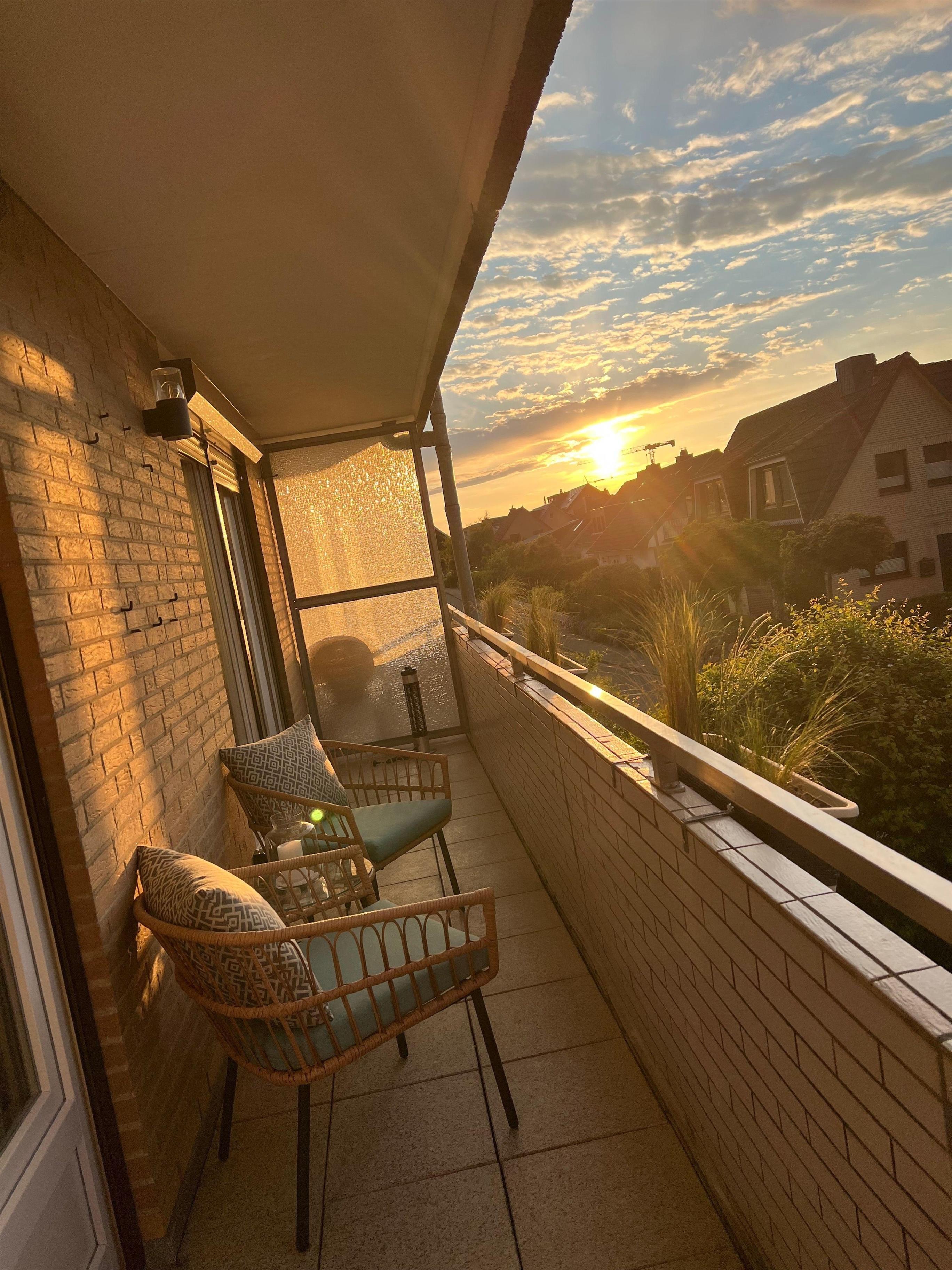 Der große, möblierte Balkon ist nach Osten ausgerichtet. Er ist jeweils vom Wohnzimmer und Schlafzimmer direkt begehbar. Da im Osten die Sonne aufgeht, sind schöne Sonnenaufgänge keine Seltenheit und können von dort ausgiebig genossen werden. Außerdem können Sie jederzeit mit unserem Elektrogrill auf dem Balkon Spezialitäten der Region zubereiten und vielleicht schöne laue Sommernächte genießen.
