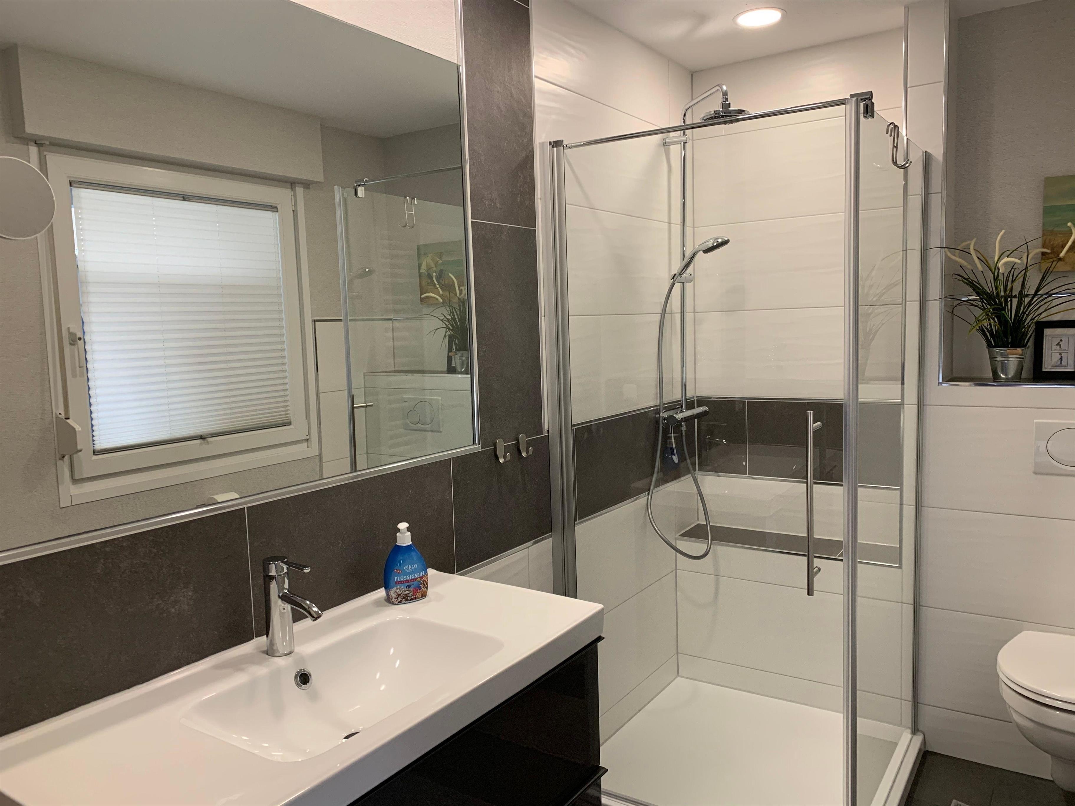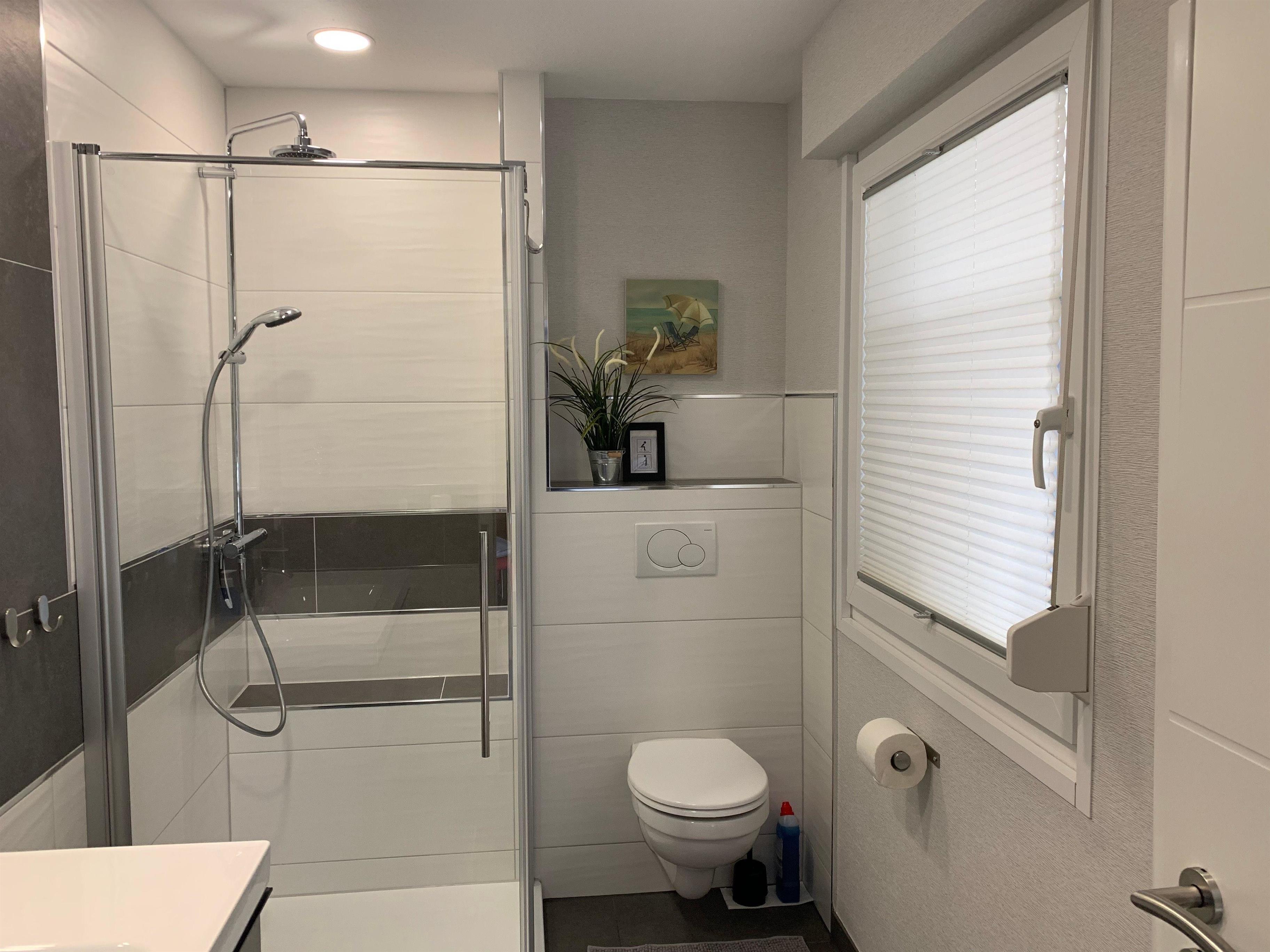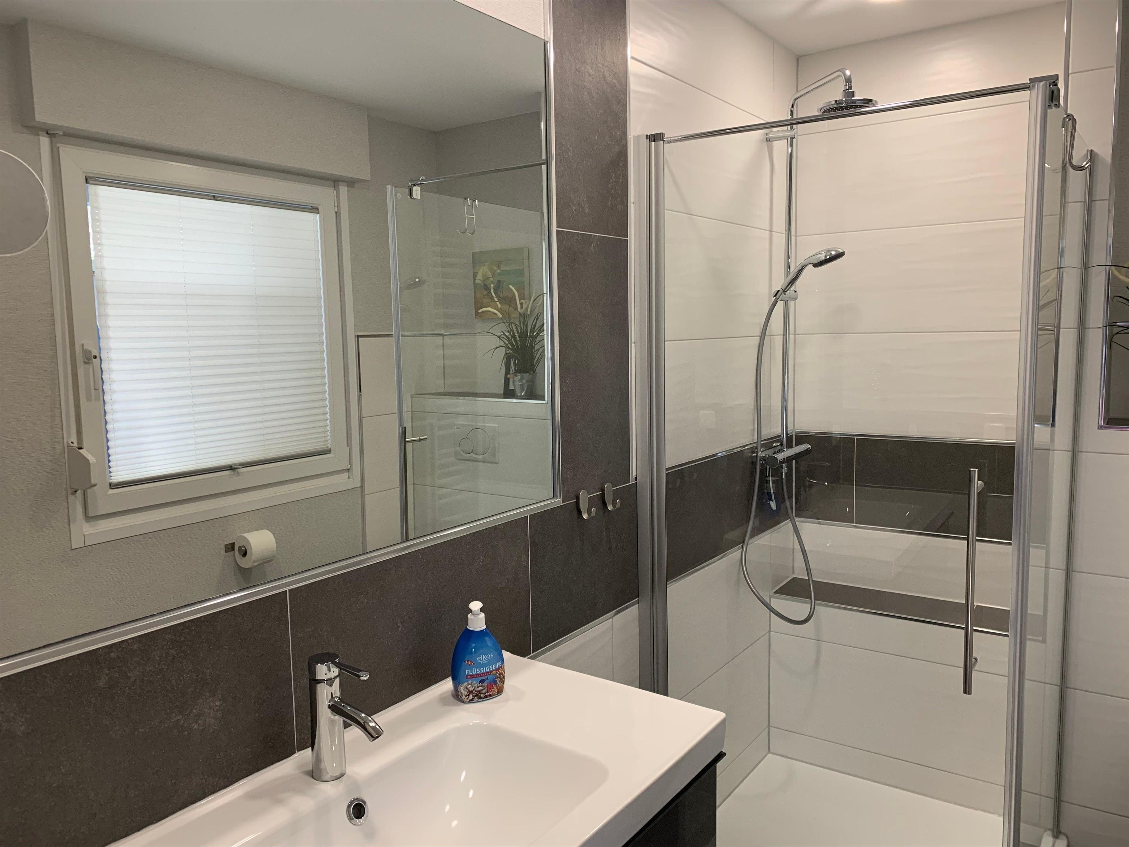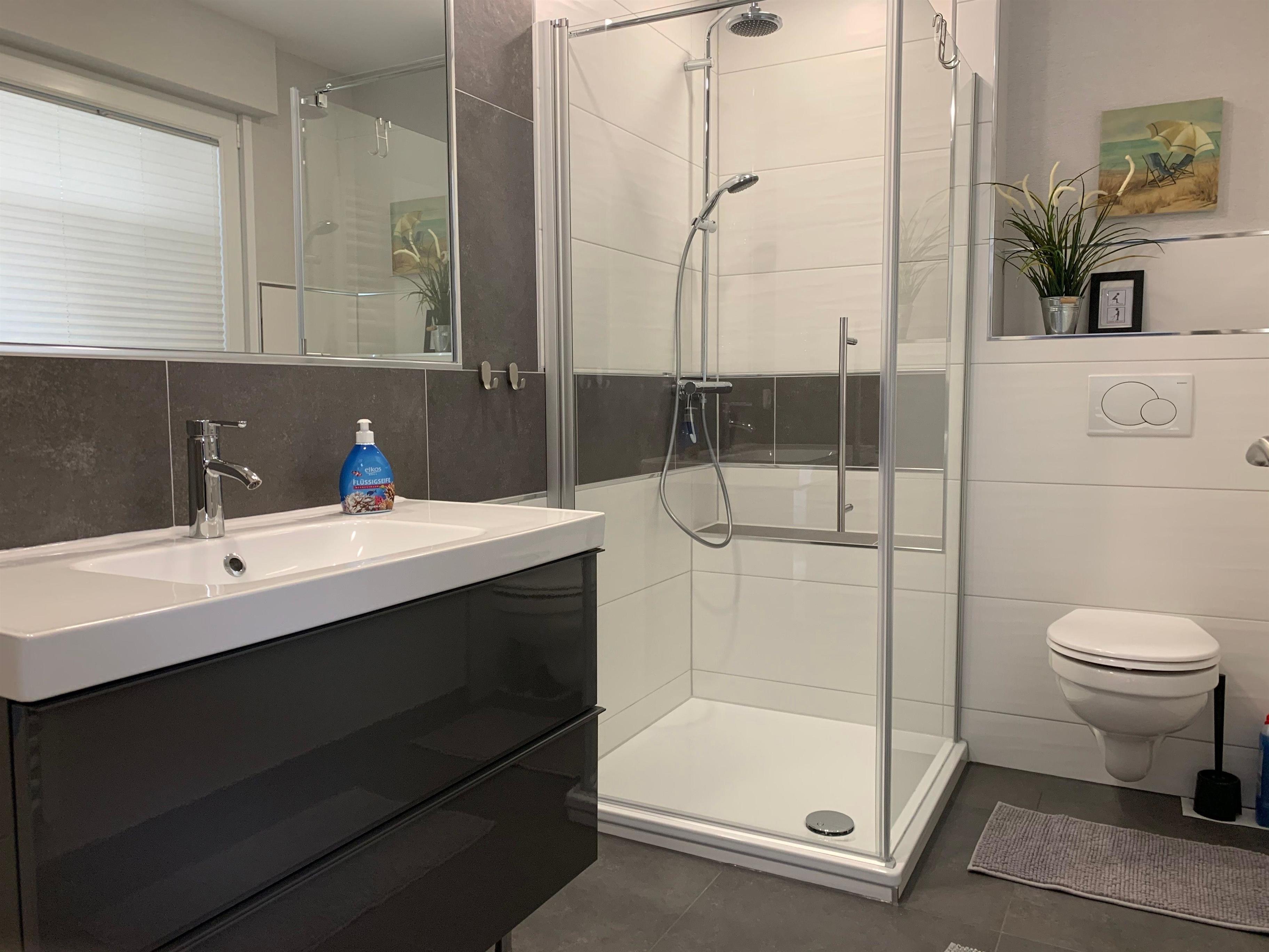 Das Badezimmer ist mit einer großen Regendusche, einem Waschbecken mit großem Spiegel, Fön und dem WC zu Verfügung.