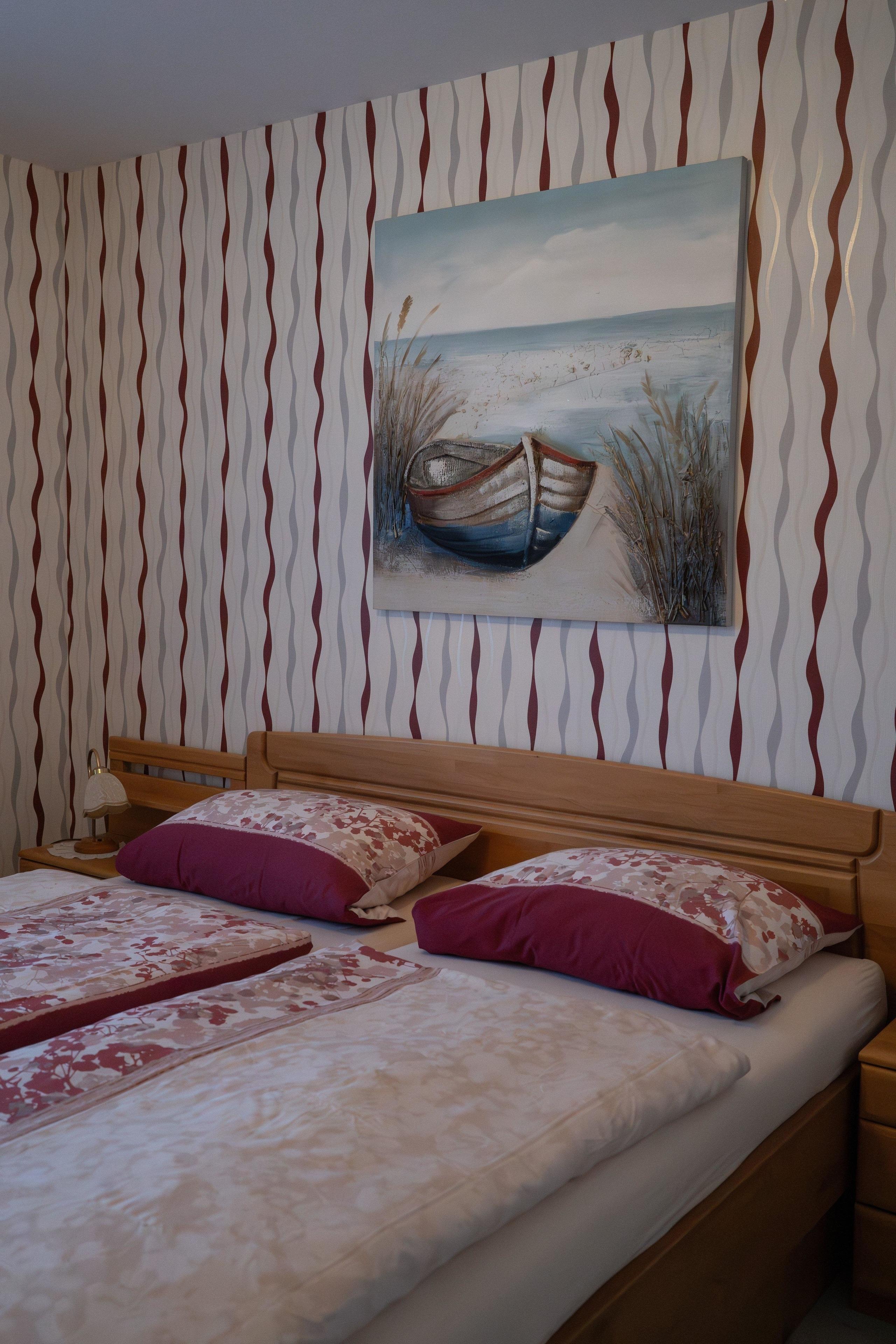 Im Schlafzimmer befindet sich ein Doppelbett mit zwei getrennten Matratzen, die eine Gesamtbreite von 180 cm bieten. Hier gibt es ebenfalls einen Kleiderschrank.