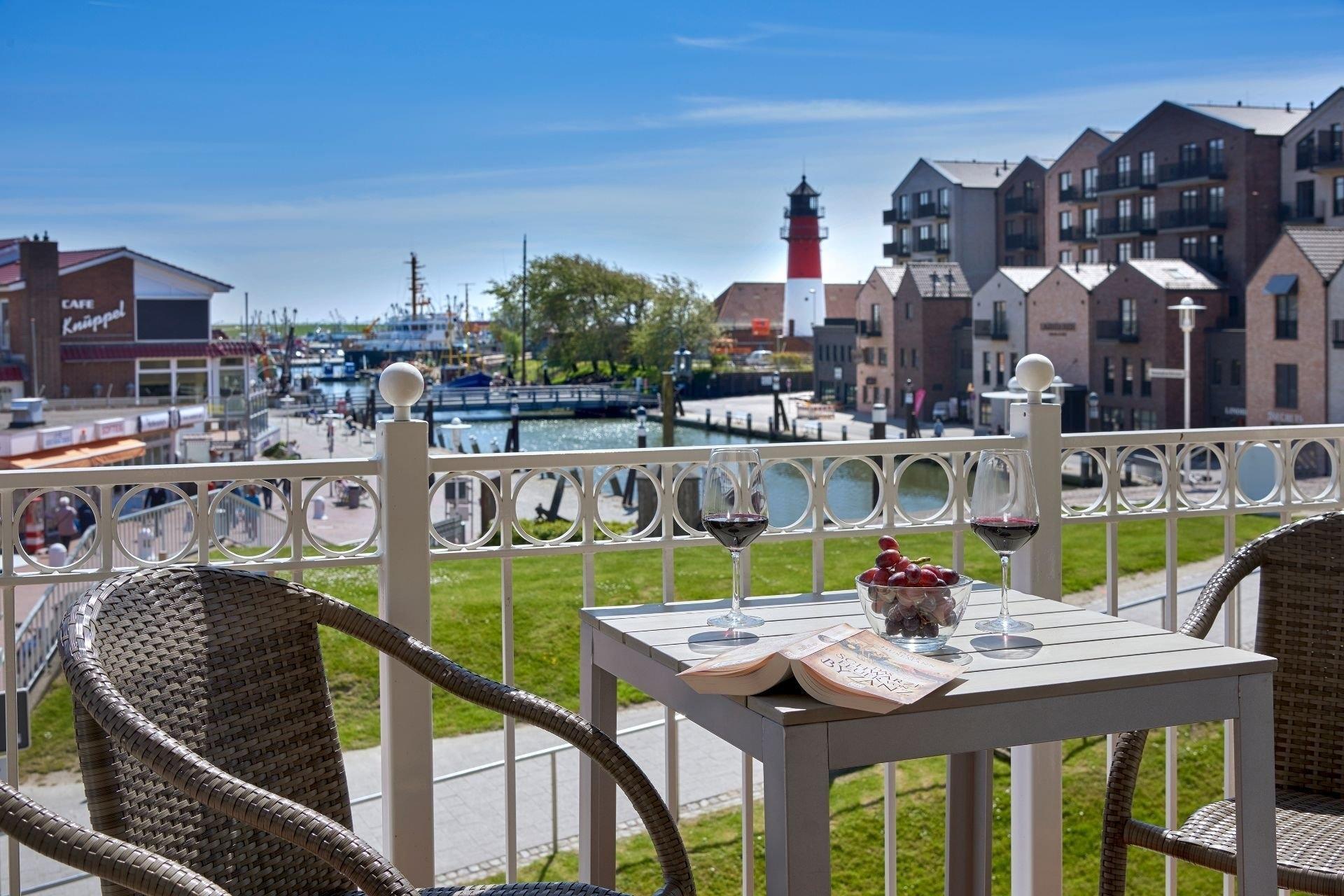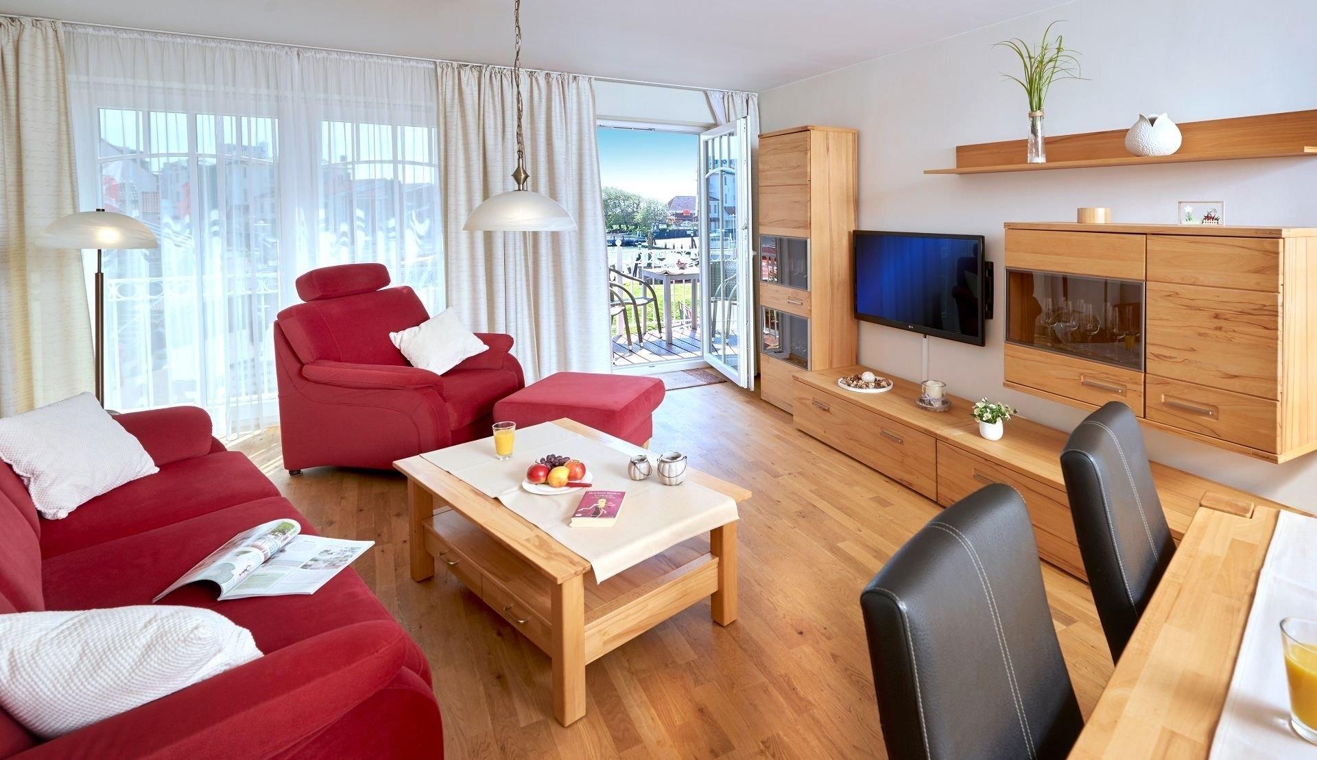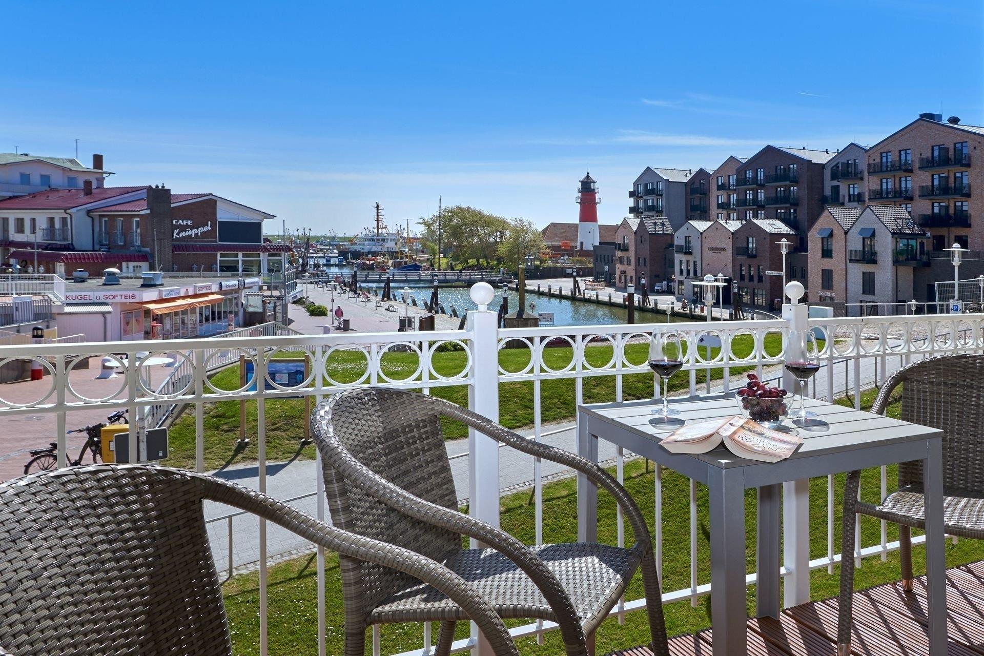 Helle 80m² Ferienwohnung in Büsum mit Balkon und Blick auf den Museumshafen, ideal für Familien oder Freunde.