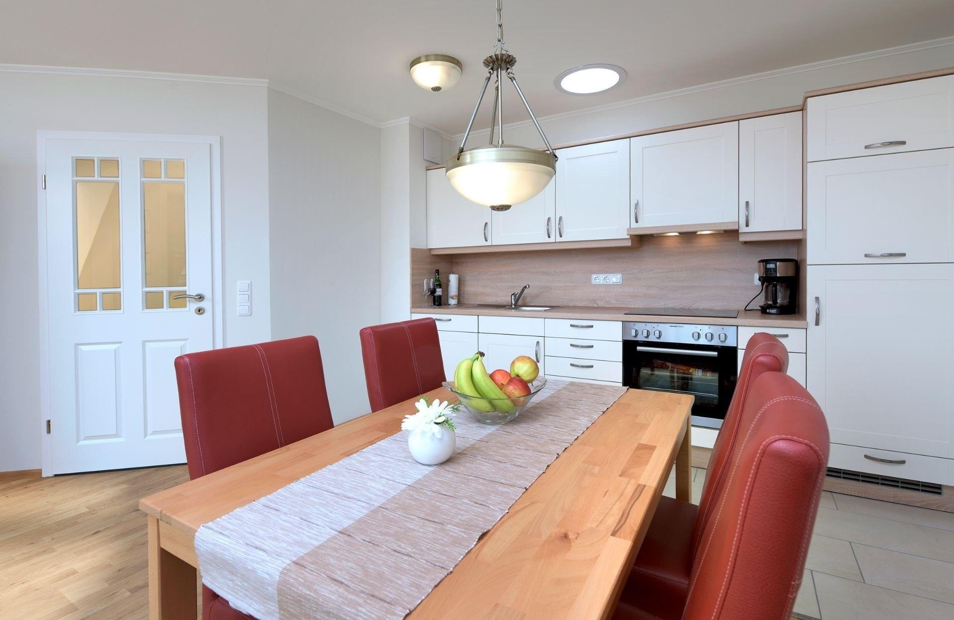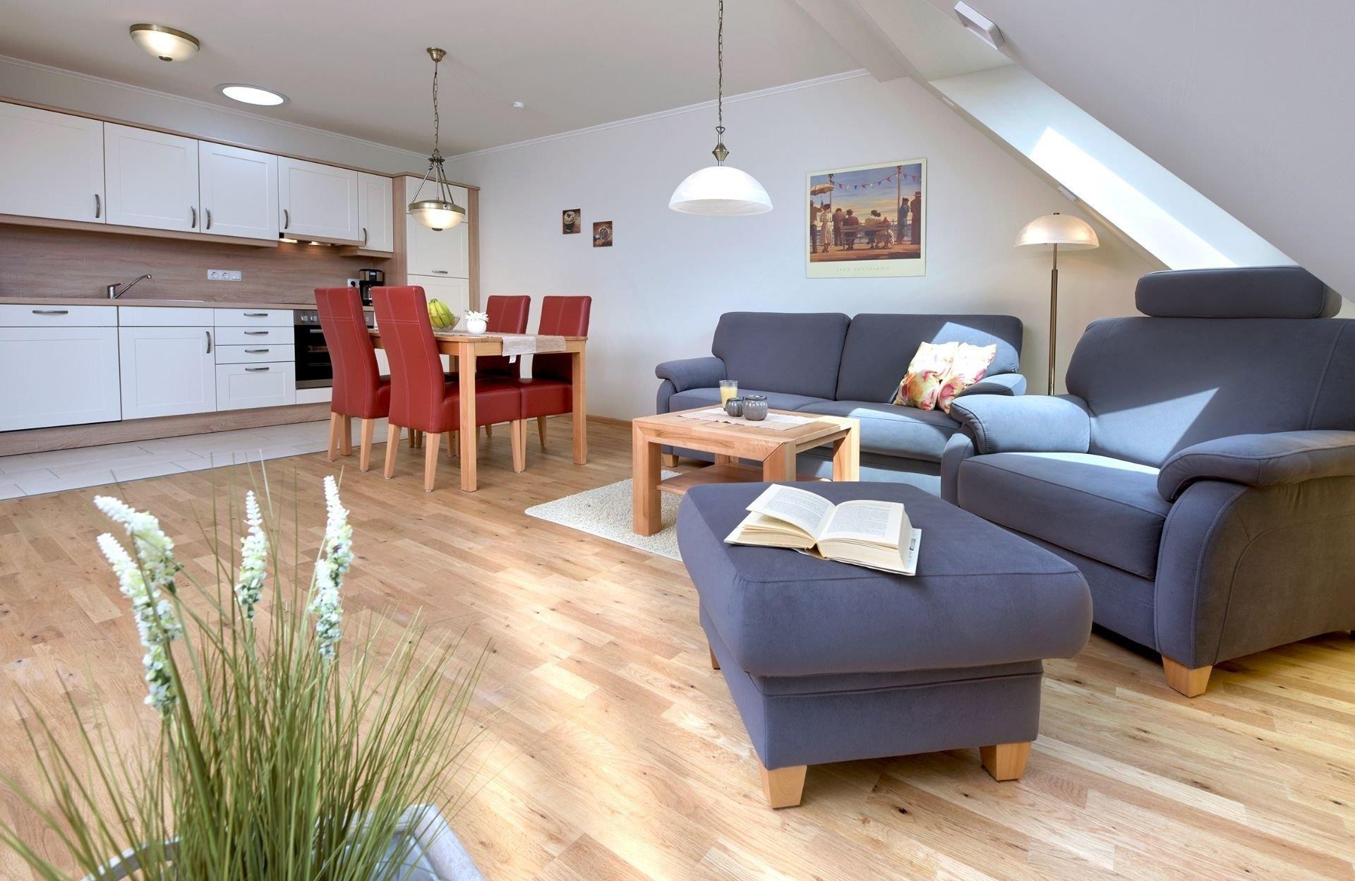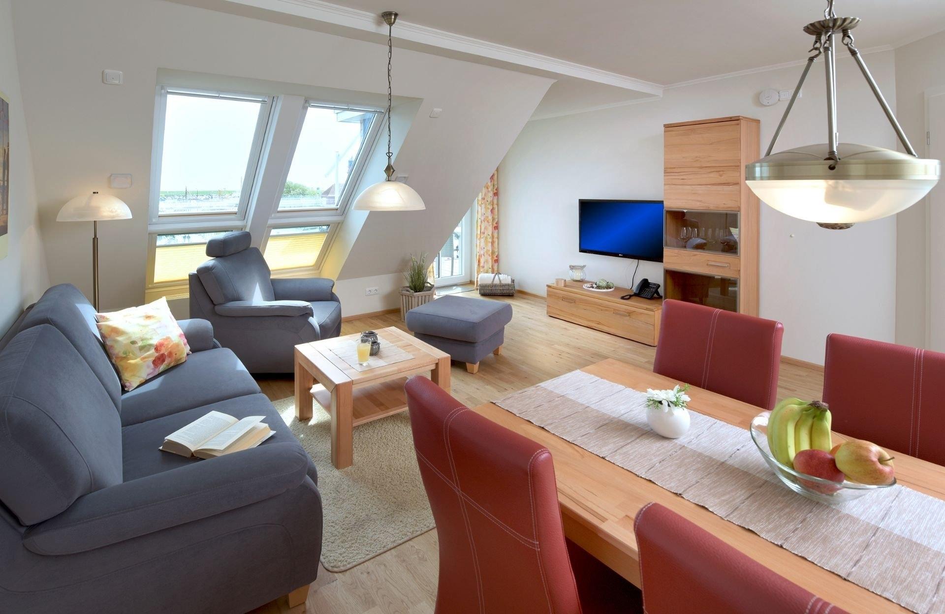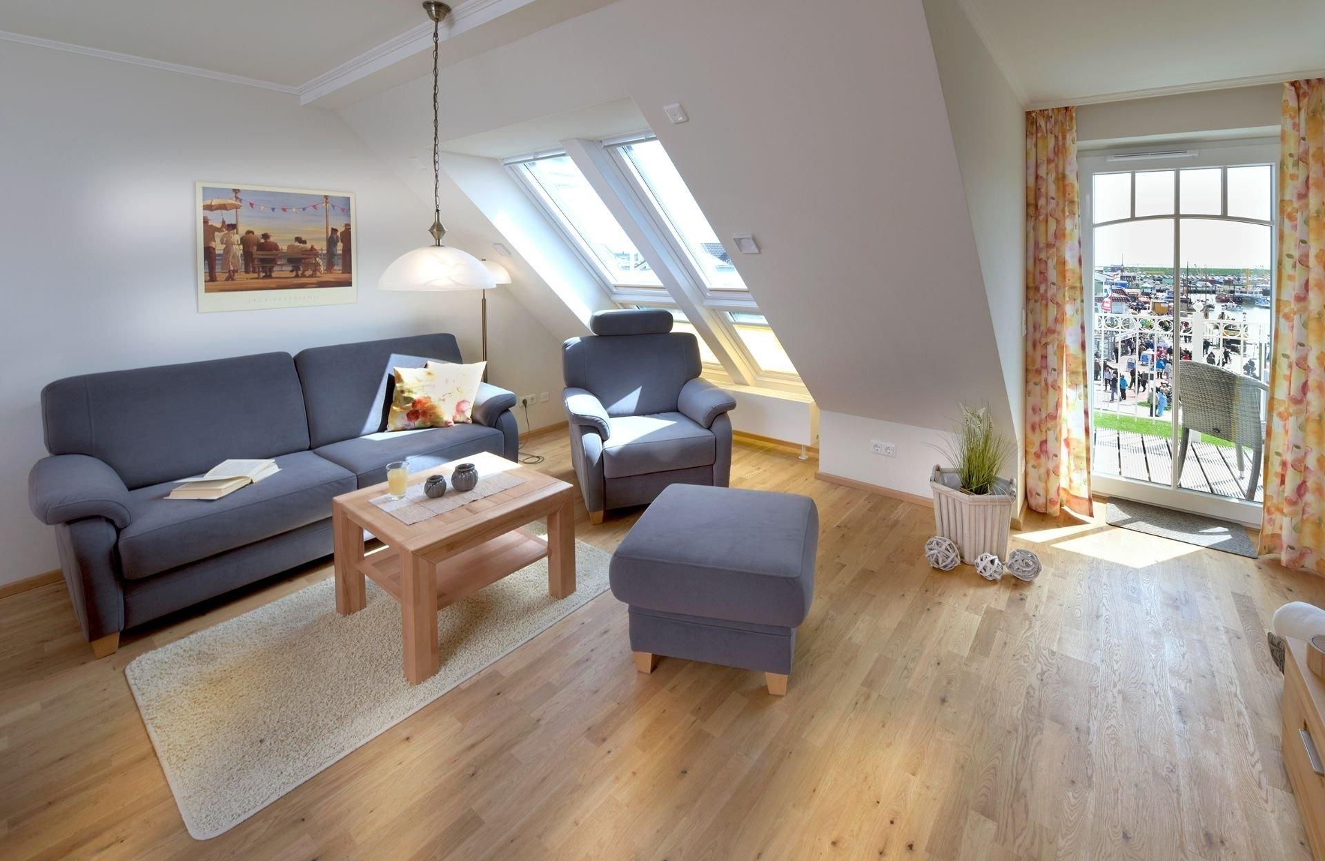 Die im Dachgeschoss liegende Ferienwohnung ist ideal für zwei Personen. Durch große Fenster in Südausrichtung bieten wir Ihnen lichtdurchflutete Räume mit einem herrlichen Blick auf den Museumshafen. Holzfußböden im großzügigem Wohn- und Esszimmer und im Schlafzimmer sowie eine hochwertige Schallisolierung sorgen für eine angenehme und erholsame Atmosphäre. Besonderen Komfort bieten wir mit einer hochwertigen Ausstattung und stufenfreien Zugängen, insbesondere mittels Aufzug und Walk-In-Dusche im Bad. Auf dem mit einer Markise ausgestatteten möblierten Balkon können Sie bei schönem Wetter bis zum frühen Abend die Sonne genießen und das bunte Treiben um den Museumshafen beobachten. Sie werden sich zu jeder Jahreszeit und bei jedem Wetter bei uns wohl fühlen.