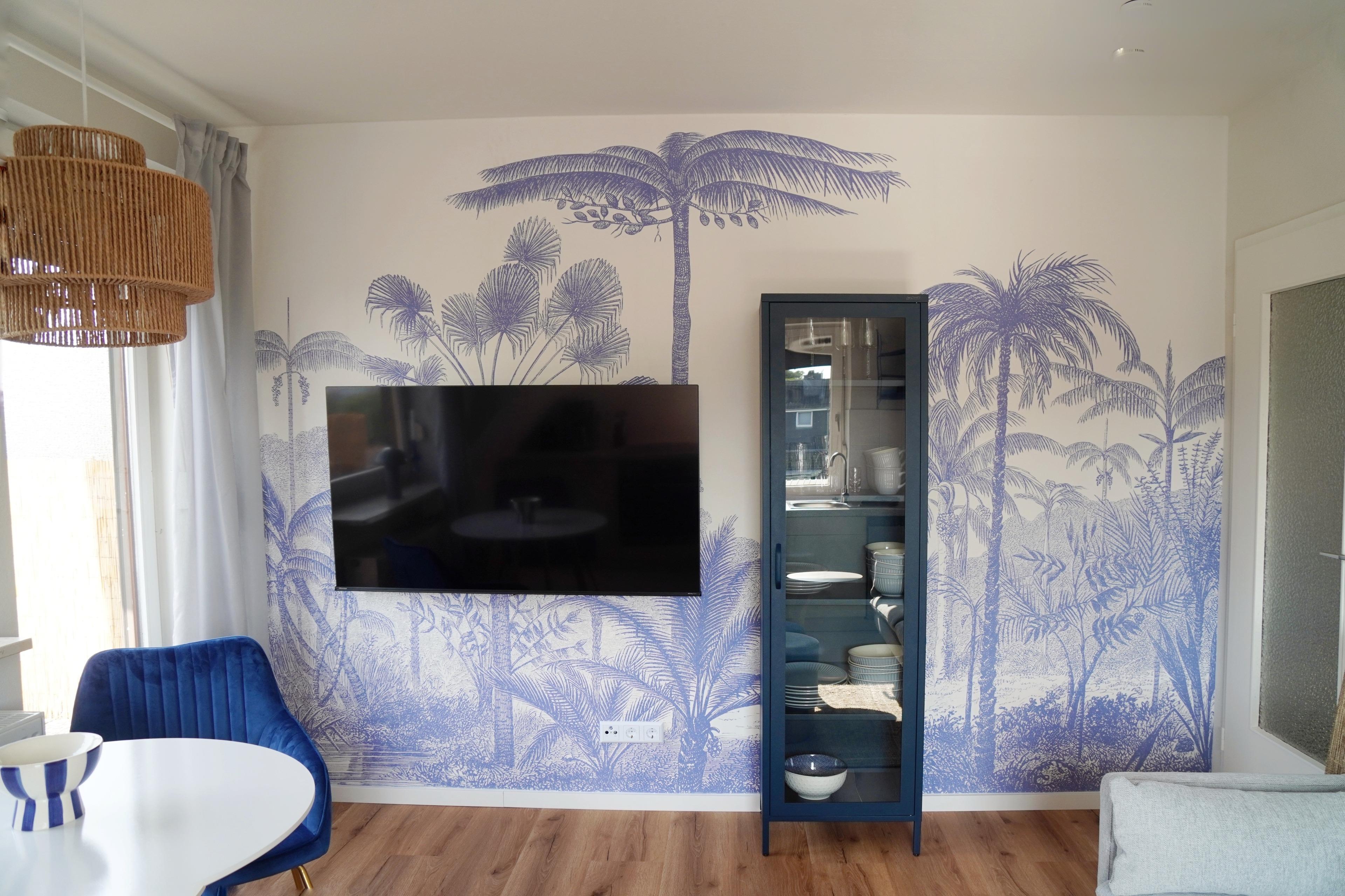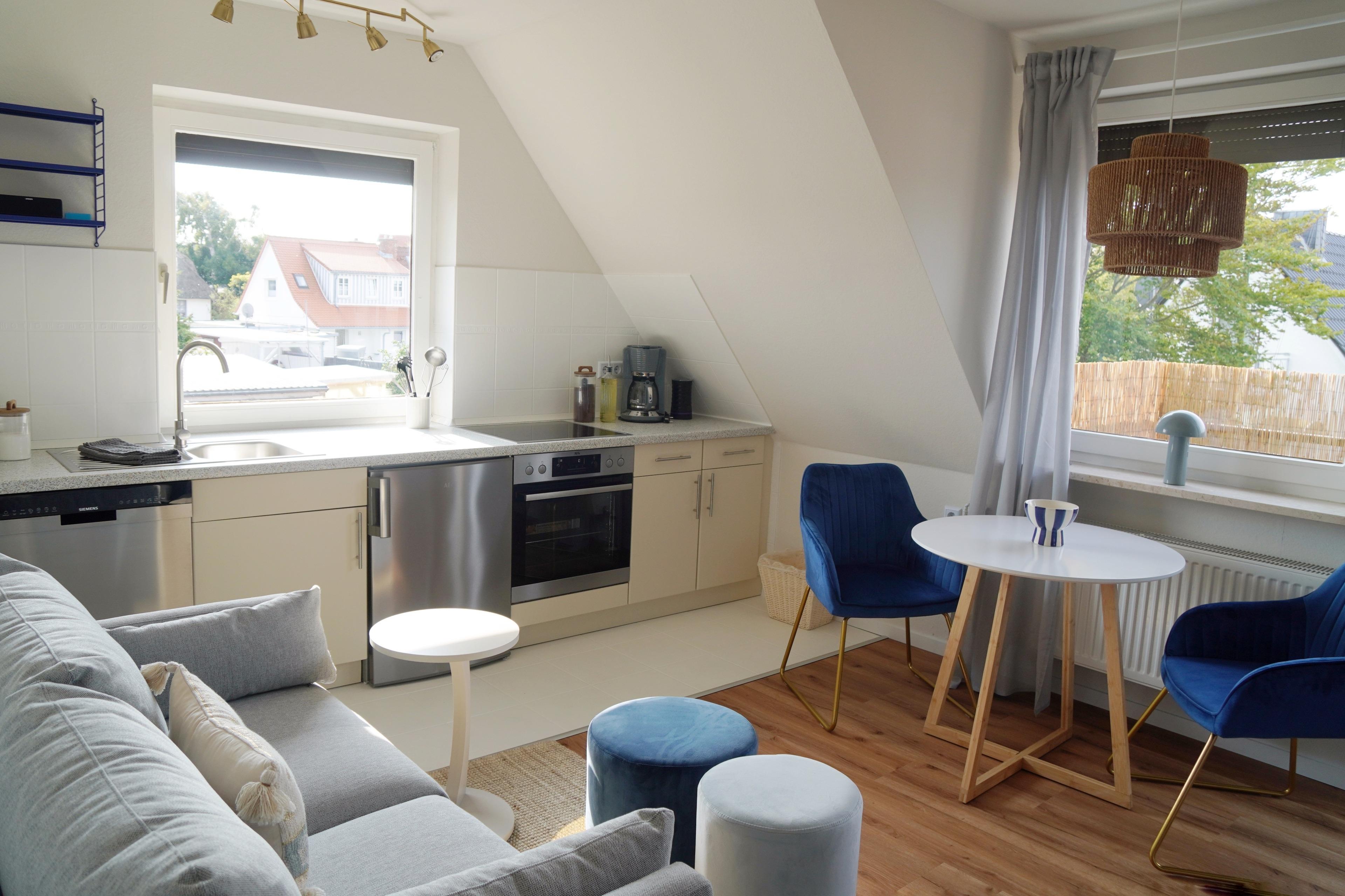 Liebevoll eingerichtet mit blauen Akzenten und Naturmaterialien. Das Wohnzimmer ist gemütlich, die Küche komplett ausgestattet – perfekt für Selbstversorger. Das Schlafzimmer mit Queensize-Bett sorgt für erholsame Nächte, das Bad für einen frischen Start in den Tag. Der kleine Balkon lädt zu entspannten Abenden ein.