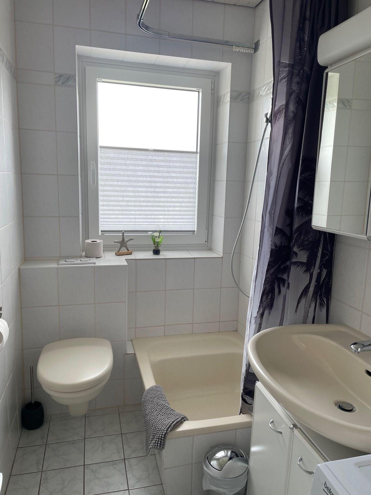 Im Tageslichtbad mit Dusche steht eine Waschmaschine zur Verfügung