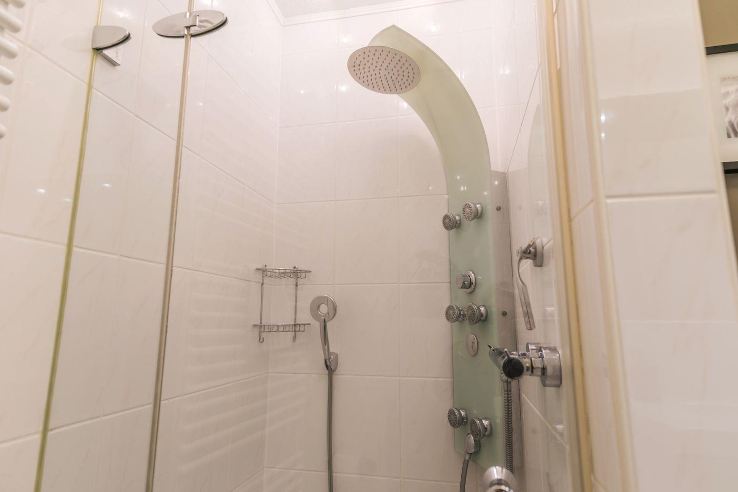 geräumige Dusche mit Sternenhimmel, WC, großer Spiegel, Föhn, Schränke, beleuchteter Kosmetikspiegel