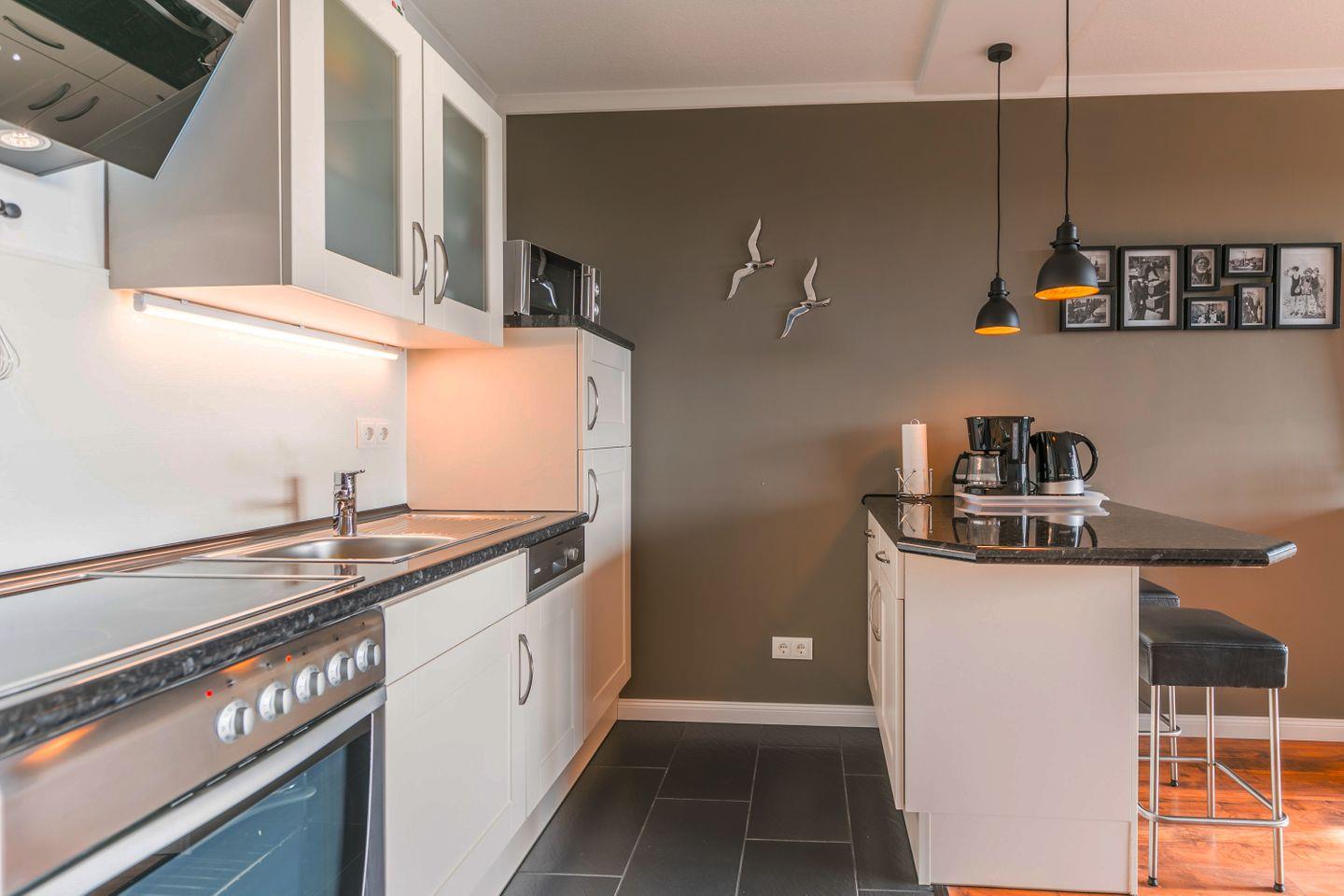 Küchenzeile, Cerankochfeld, Dunstabzugshaube, Backofen, Gefrierschrank, Mikrowelle, Geschirrspüler, Küchentresen mit Barhockern, Kaffeemaschine, Eierkocher, Wasserkocher, Toaster, Espressomaschine