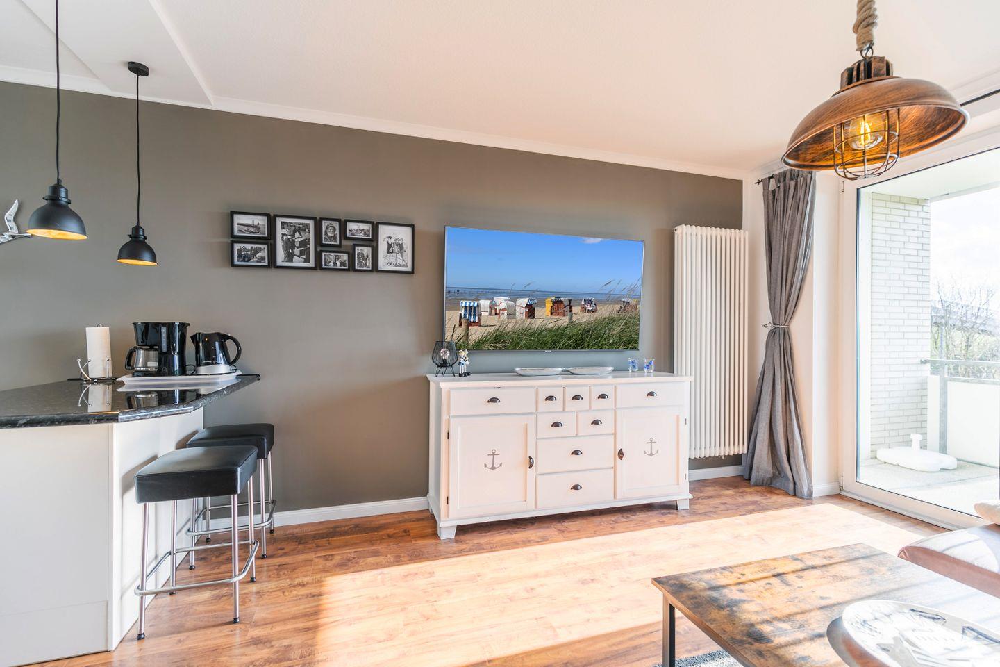 große Couch, Essgruppe mit 2 drehbaren Stühlen, 65" Smart-TV, DAB-Radio Internetradio mit Wetteranzeige, DVD-Player, Südbalkon mit Tisch und Loungemöbeln & Liege
