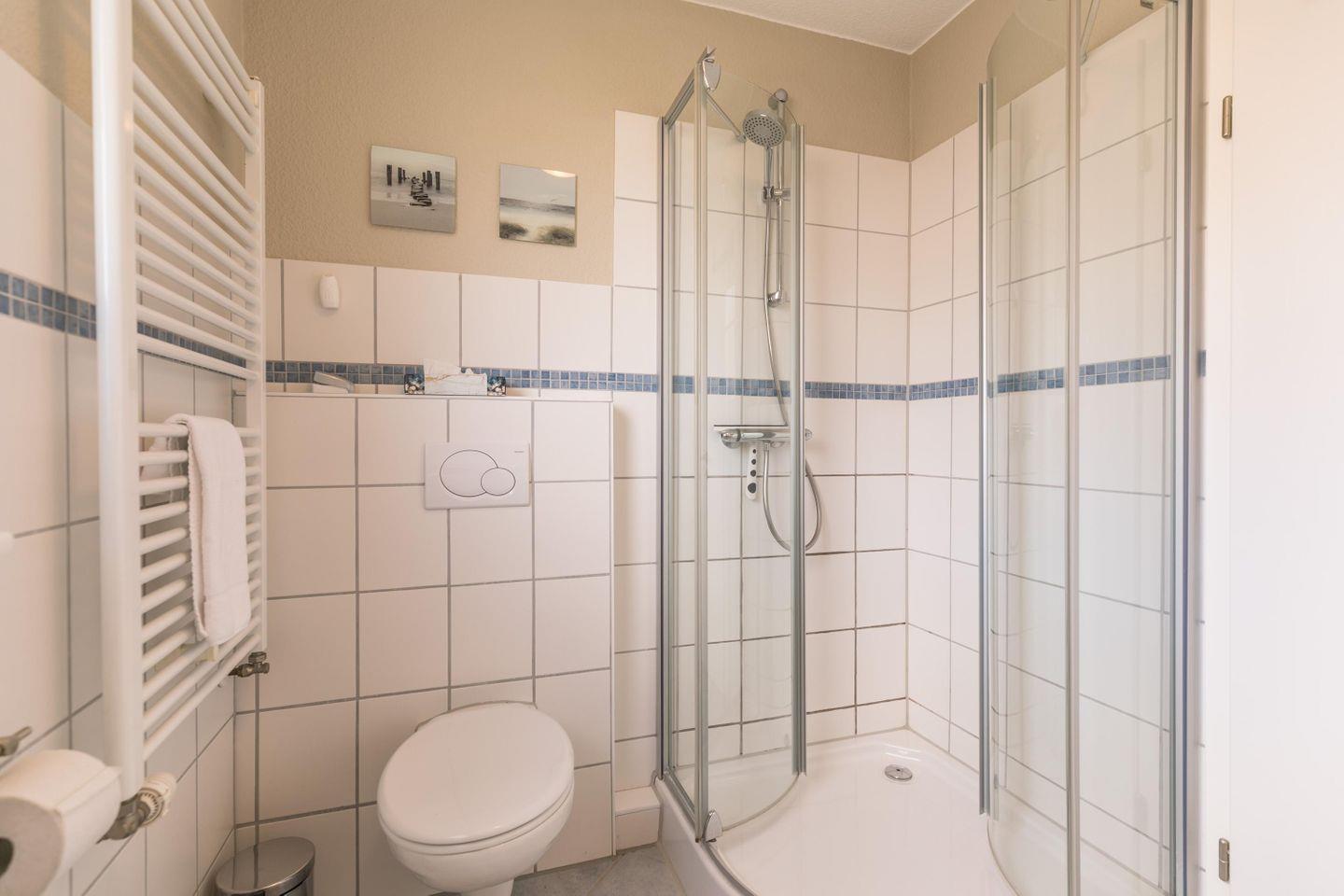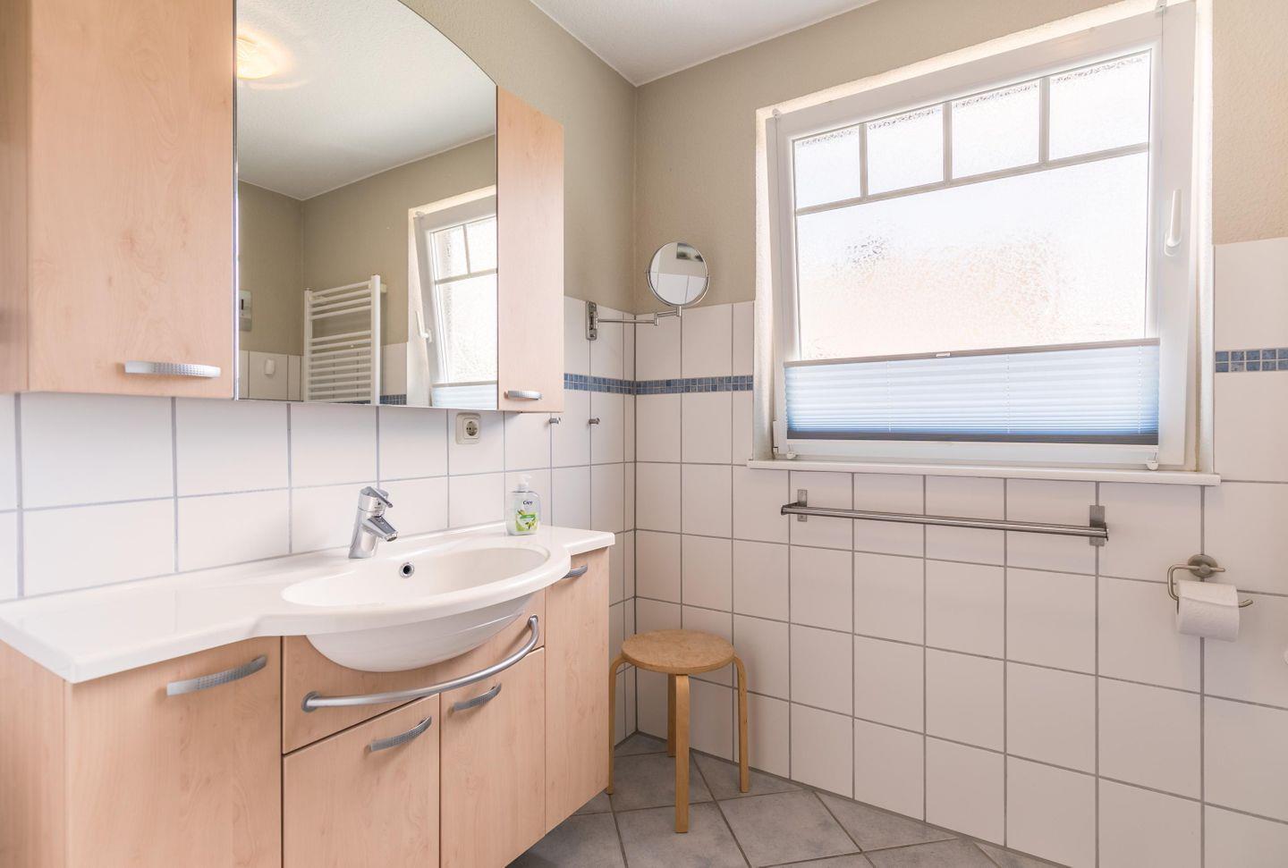 Duschbad und WC, Waschbecken mit Unterschrank, Handtuchtrockner, Haartrockner, Hocker, Fenster mit Plissee, Spiegelschrank