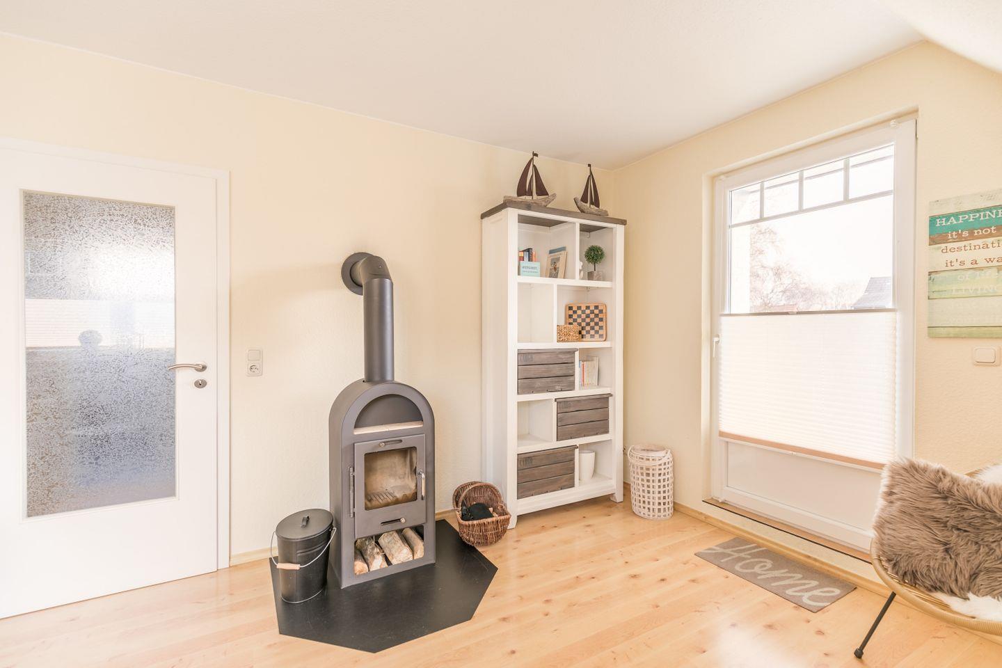 An kühlen Tagen genießen Sie das Holzfeuer im Kaminofen und zaubern sich damit eine kuschelige Atmosphäre. Die Fewo in Büsum ist mit 3 Personen belegbar.