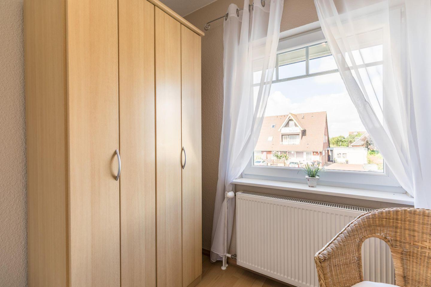 1 Einzelbett, Kleiderschrank 4-türig, Nachtkonsole, Fenster mit Außenjalousien