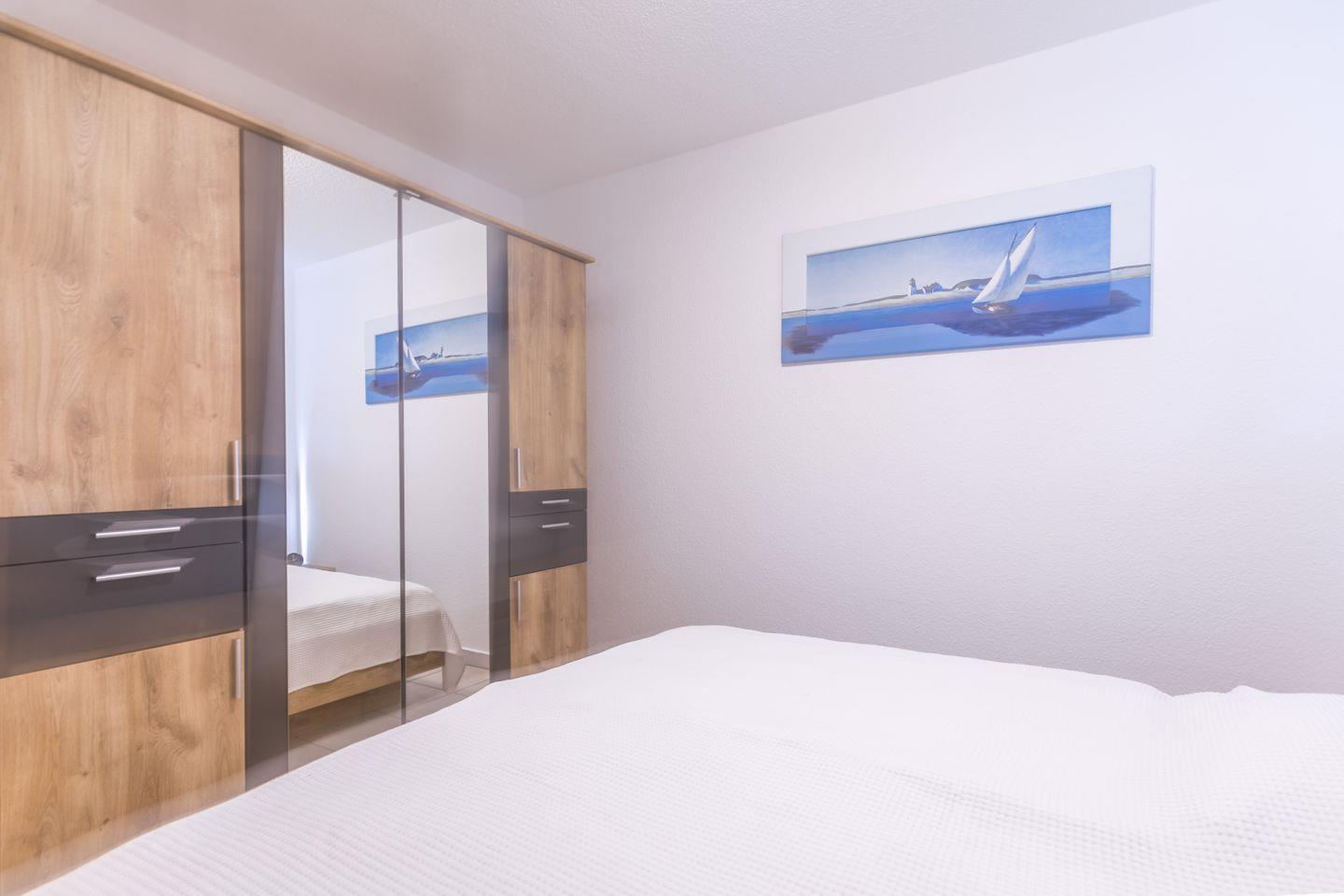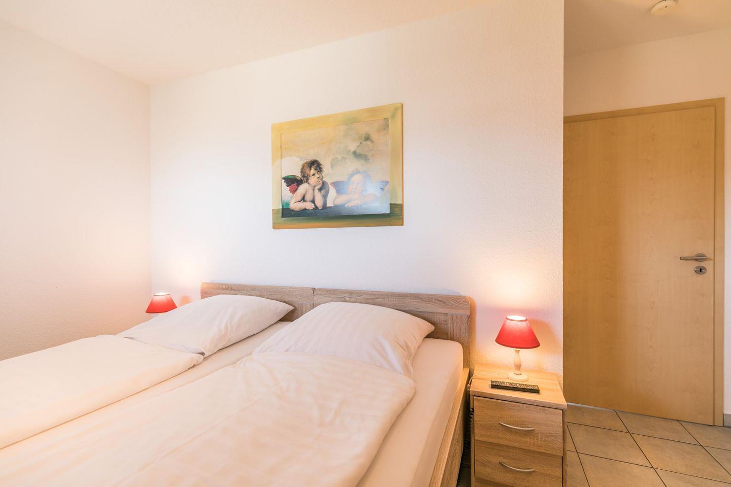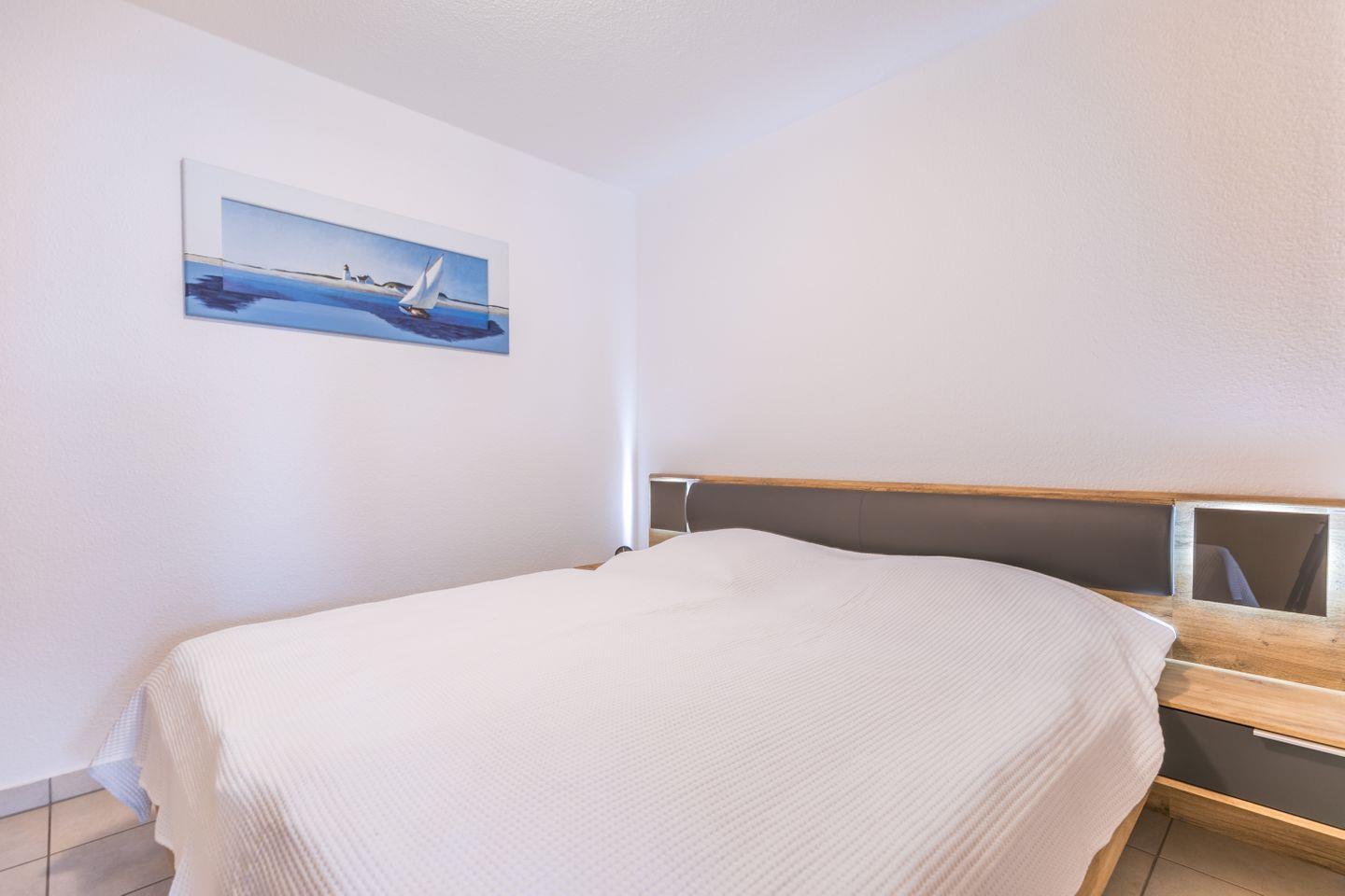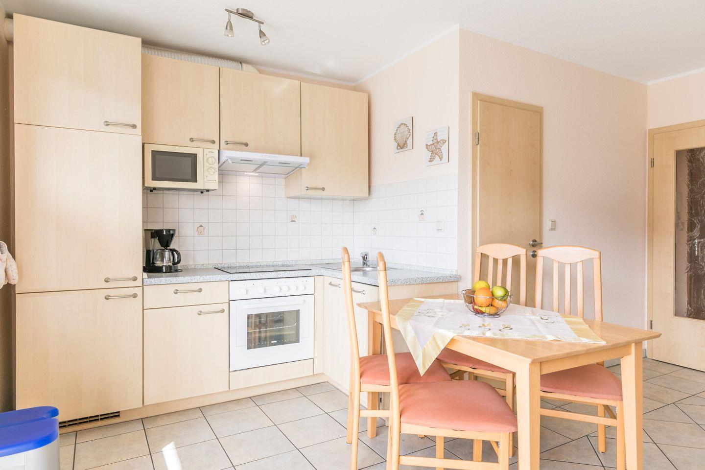 Die Wohnung verfügt über zwei Schlafzimmer – eines mit zwei Einzelbetten und Flachbild-TV, das andere mit einem Doppelbett. Das behaglich ausgestattete Wohnzimmer mit Südbalkon lädt zum Entspannen ein. Die offene Küche ist vollständig eingerichtet, inklusive Geschirrspüler, Backofen und Mikrowelle. Das Badezimmer ist barrierearm gestaltet und bietet eine Dusche mit Klappsitz sowie Haltegriffe.