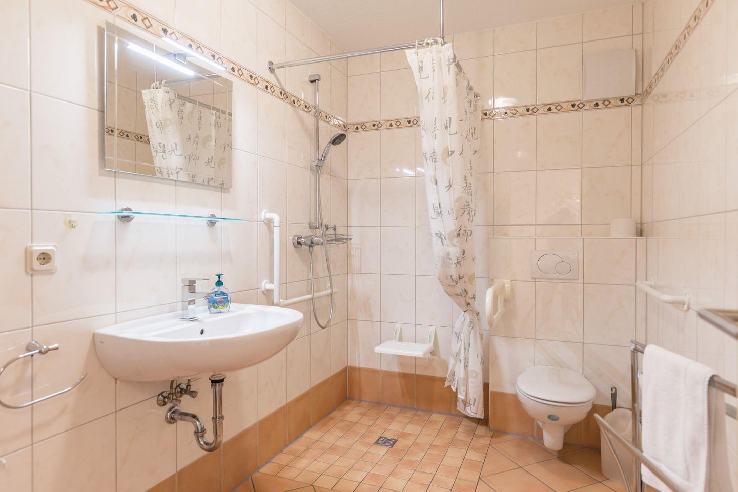 Dusche mit Klappsitz, Bodeneinlauf, WC mit Haltegriff, Handtuchwärmer, Fußbodenheizung, Föhn