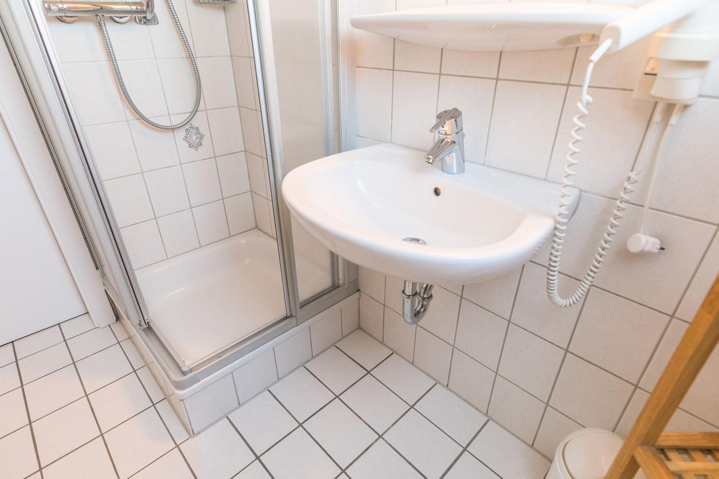 Dusche mit Duschwanne, WC, Waschbecken, Handtuchheizung, Fön, Jalousie