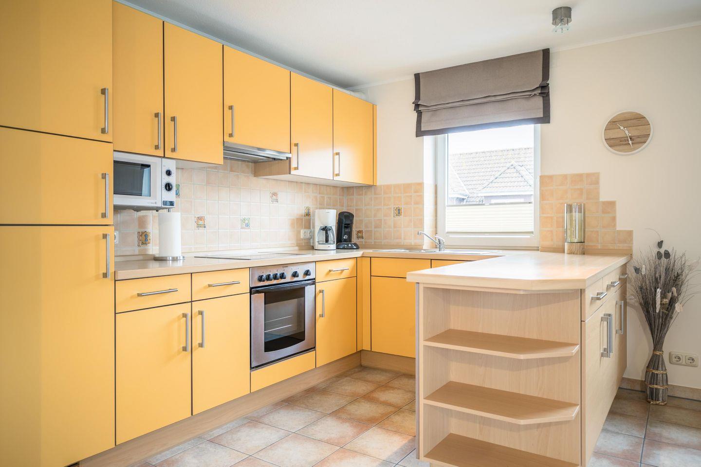 Fußbodenheizung, Einbauküchenzeile, Geschirrspüler, Ceran-Kochfeld, Abluft, Backofen, Mikrowelle, Kühlschrank, kl. Gefrierschrank, Wasserkocher, Toaster, Kaffeemaschine und zusätzlich eine Senseo-Pad-Maschine, Eierkocher