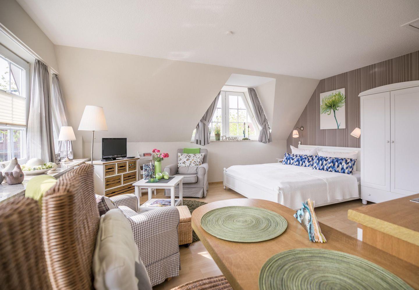 Ausgestattet mit einem komb. Wohn-, Schlafraum mit Doppelbett, Sesseln und einer kleinen Küchenzeile mit Essplatz für 2 Personen, sowie einem Tageslicht Duschbad.