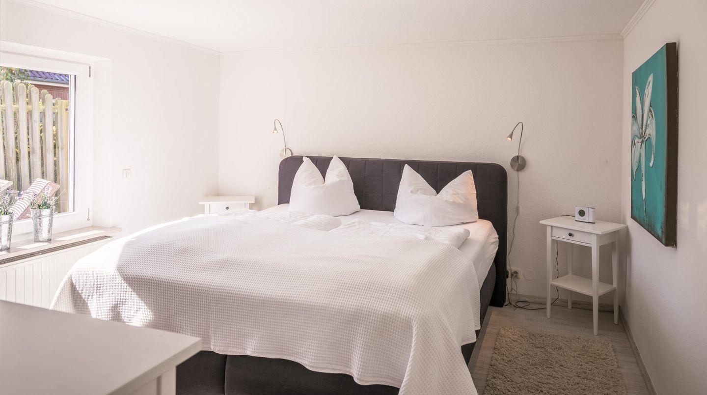 Erdgeschoss über 2 Stufen erreichbar, Boxspringdoppelbett (1,80x2,00m), Flachbild-TV, 2 Nachtkonsolen, Kleiderschrank 2türig, Stuhl, elektr. Außenrolläden